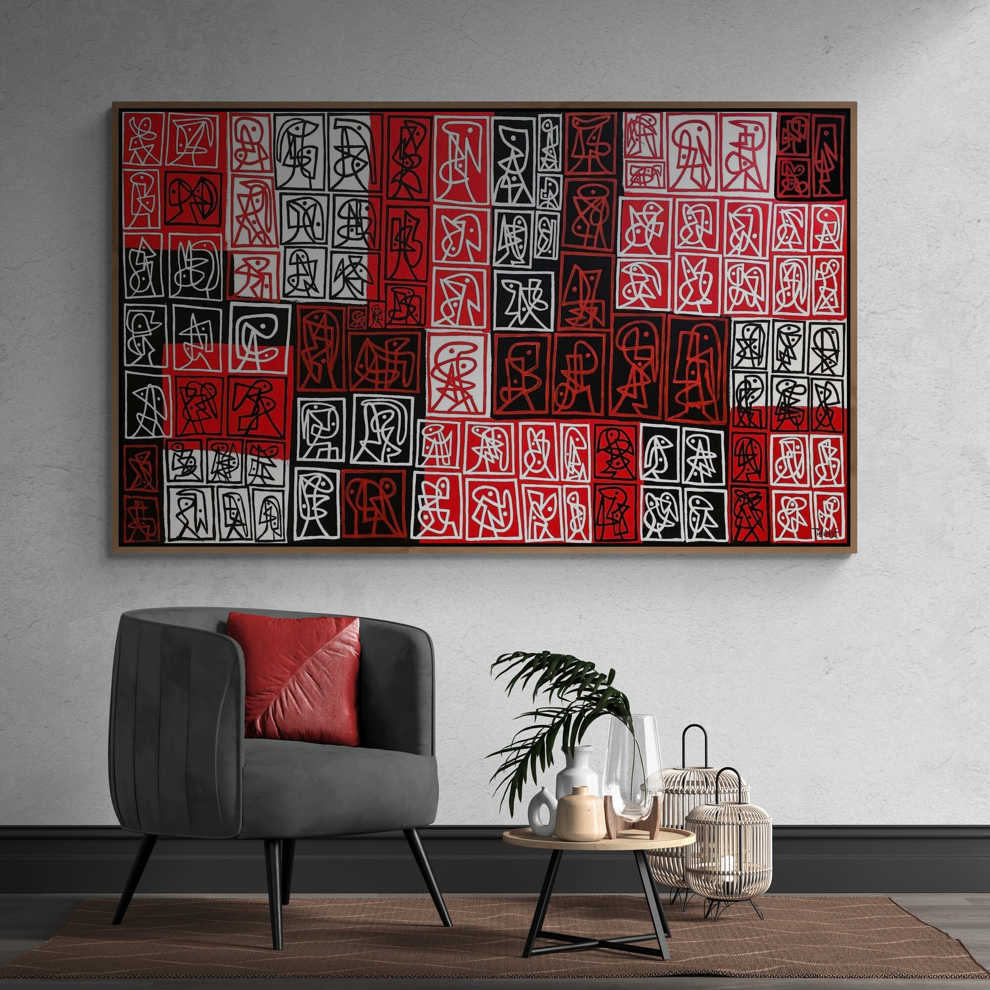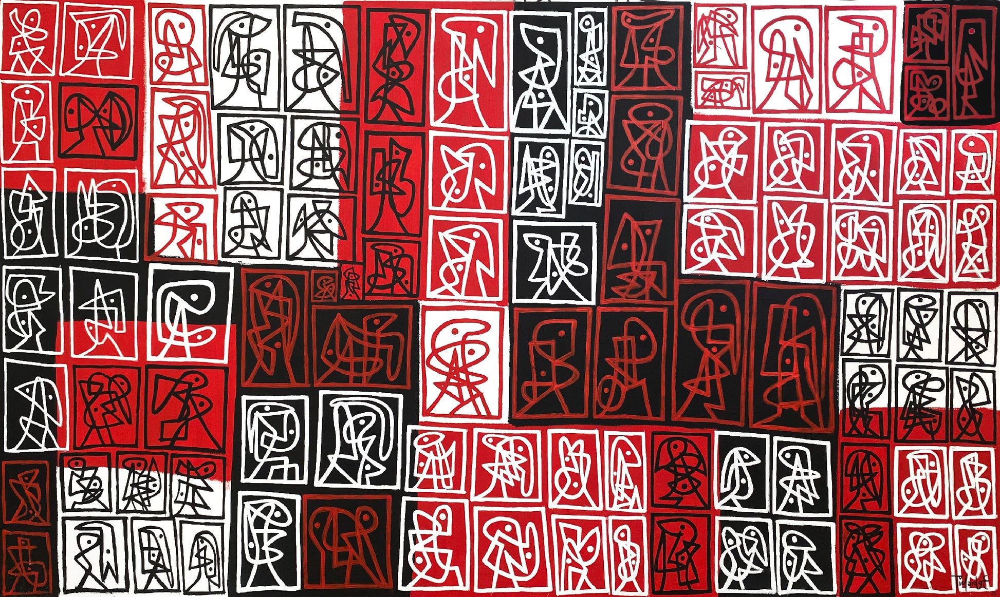 En "Signos rojizos" (210x125 cm, acrílico), el artista invita a la reflexión a través de un espacio donde los signos y las formas parecen entrar en una danza caótica y ordenada al mismo tiempo. Los trazos fluidos y los matices de rojo, blanco y negro se entrelazan de manera que el espectador es arrastrado por la fuerza de la pintura. El uso del rojo, tan simbólico y cargado de emociones, se convierte en un protagonista que dialoga con las formas, desbordando la obra de pasión y vitalidad. Cada trazo no solo representa una imagen, sino una expresión única que invita a la interpretación personal de quien la observa.