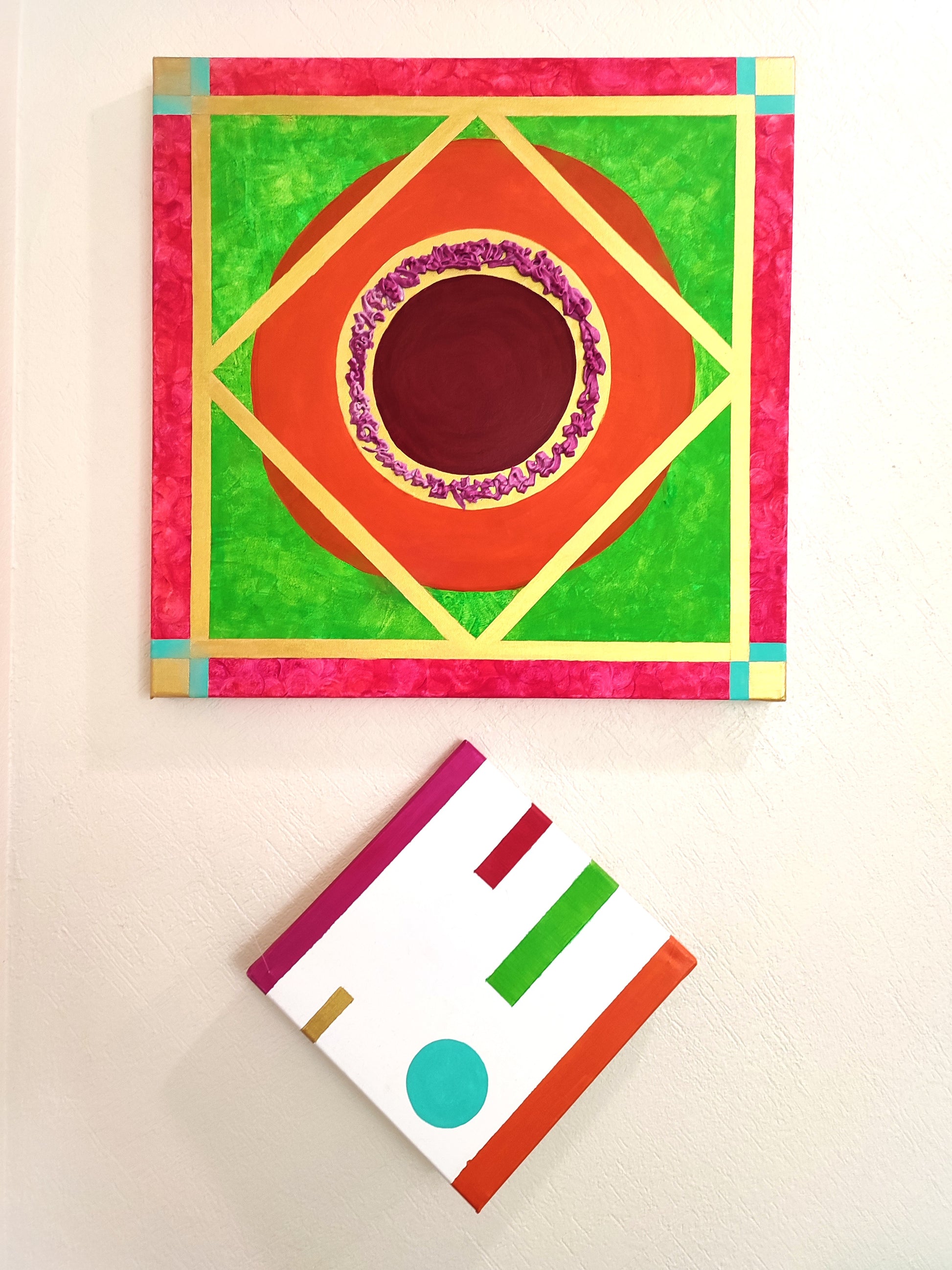 Esta pieza es un fascinante juego de líneas y formas, donde la simetría imperfecta se convierte en una expresión de belleza. Dos lienzos se unen mediante un hilo transparente, creando una composición única y llamativa. Un lienzo grande, de forma cuadrada, sirve como escenario principal, mientras que delinea desde su centro cuelga un segundo lienzo más pequeño, con una intrigante forma de rombo.