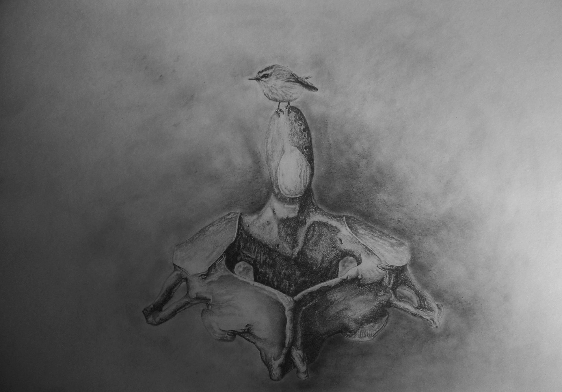 Esta pieza forma parte de una serie de pequeñas posando en los huesos como si estuviera inspeccionando el hueso para poder realizar su espacio para habitarlo. la idea del ave construyendo un nido en el hueso es como lo que hace el hombre cuando quiere resguardarse de lo ahí afuera. definiendo que es habitar para nosotros.