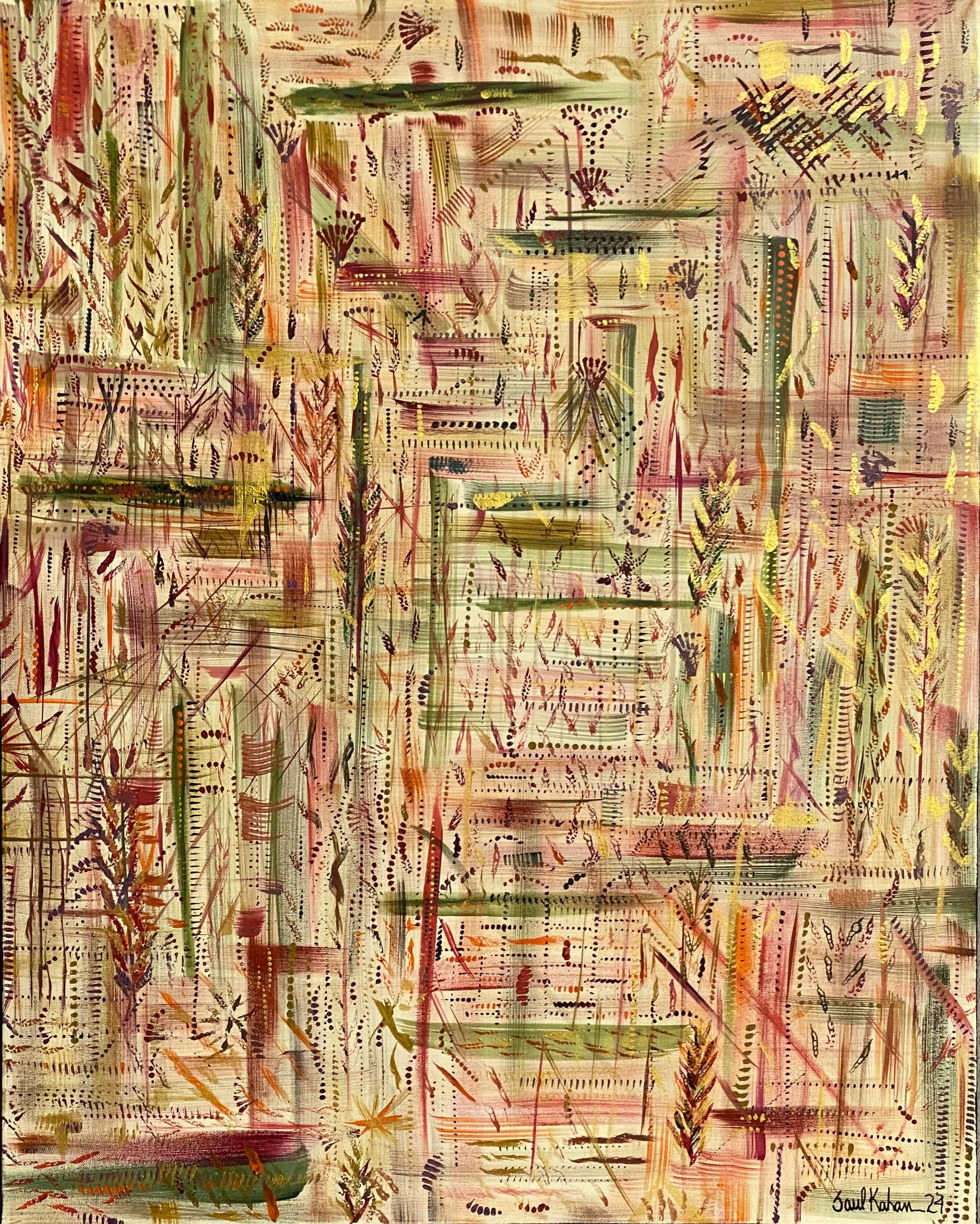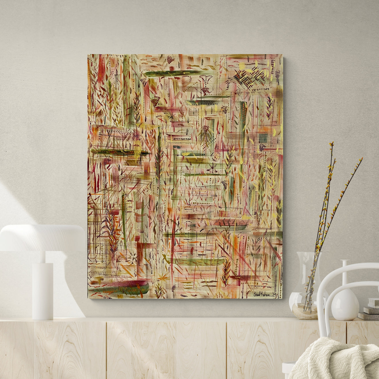 Abstracto en amalgama de crema, verdes, dorados, vino y sepia.
