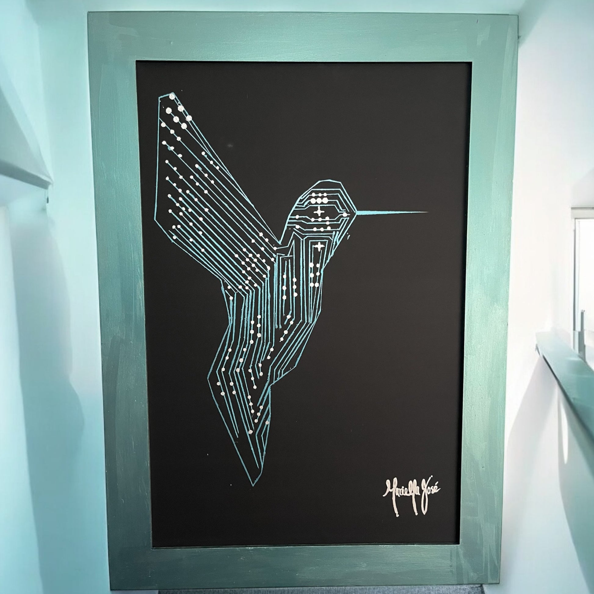 Pintura en acrílico metálico sobre lienzo y marco de MDF. 74 cm de base por 1.04 cm de altura. Este colibrí nos trae el mensaje de la singularidad: cada alma es única e irrepetible, y está conectada con las demás creando redes y conexiones divinas.