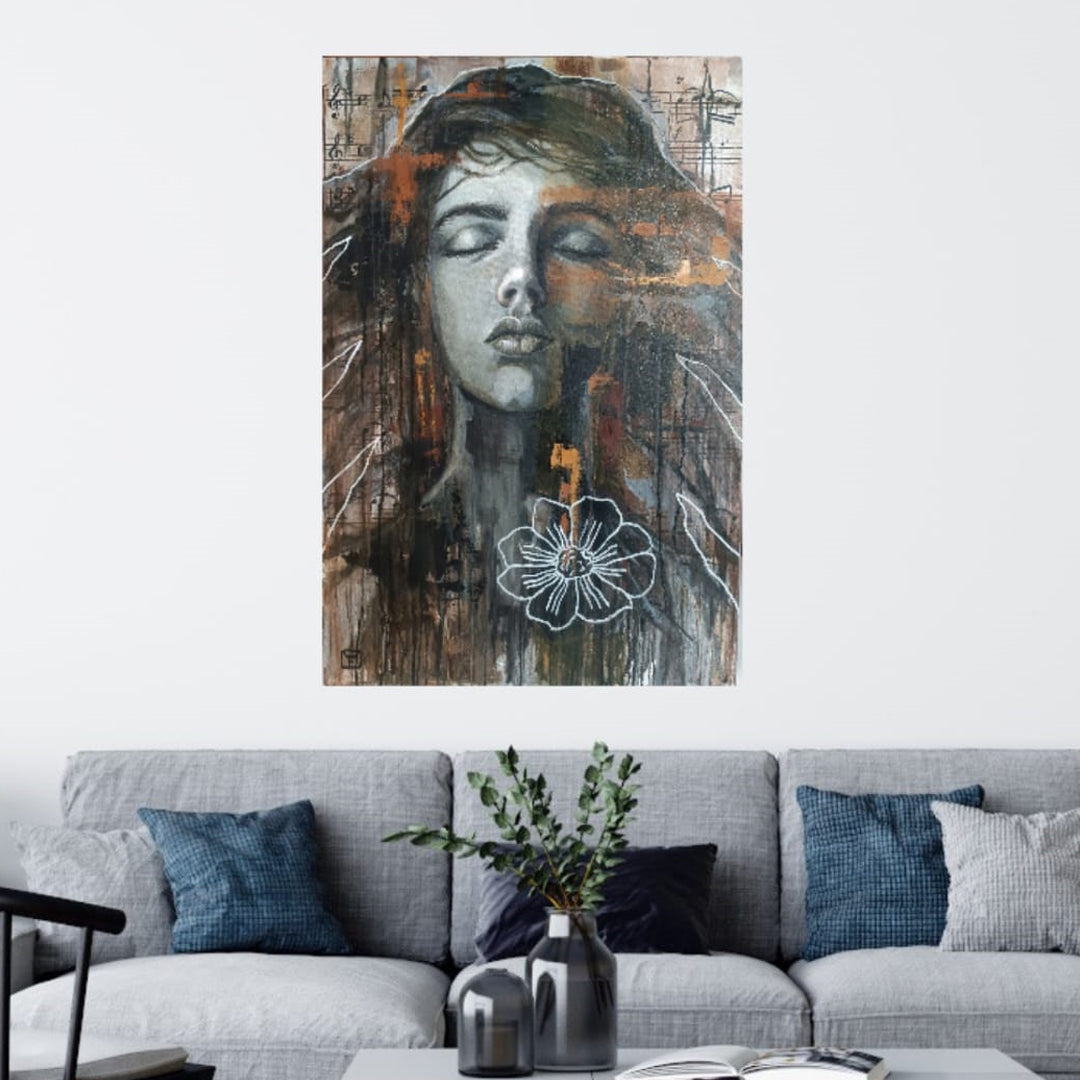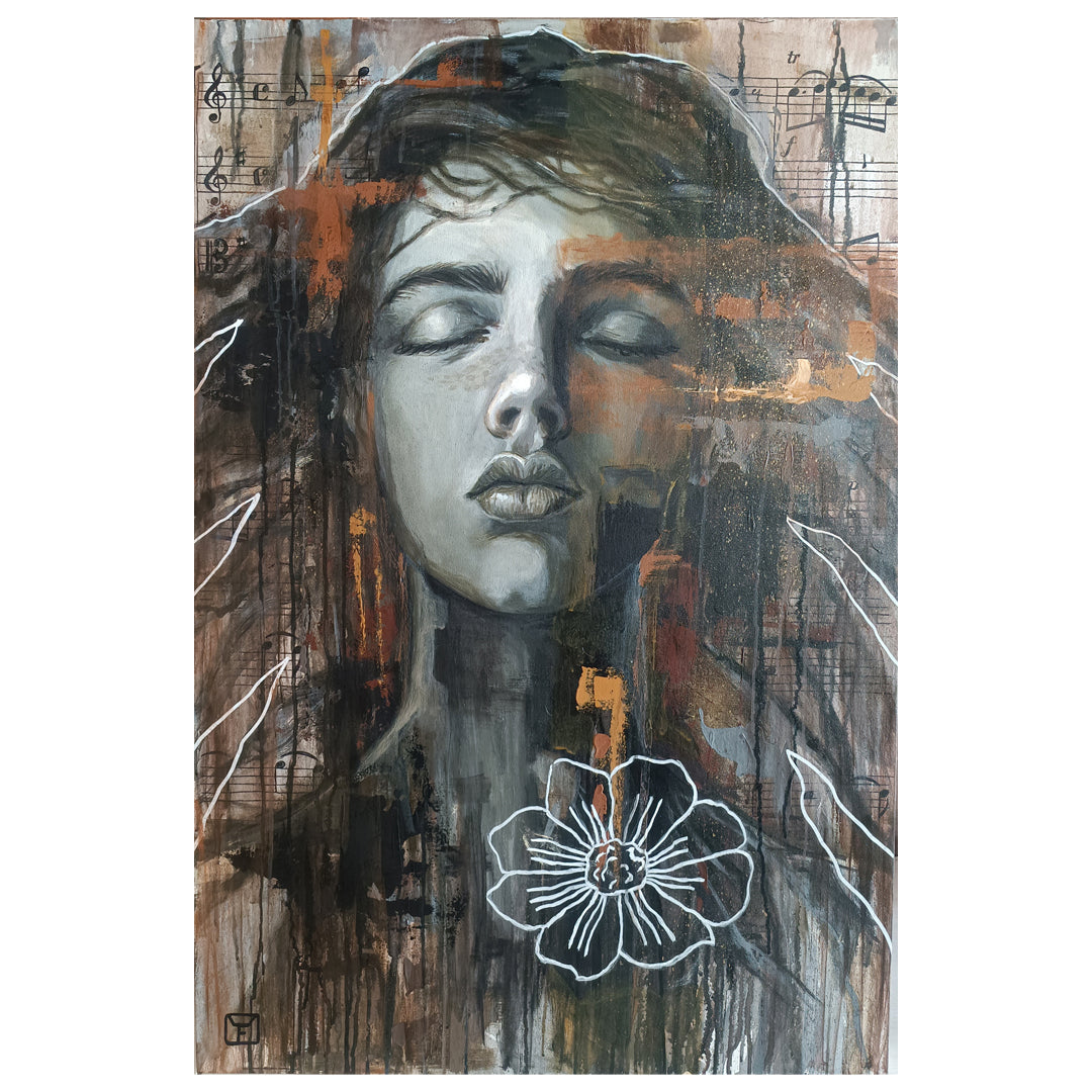 Utilizando parte de la partitura del Cuarteto de Cuerdas de Mozart como fondo e inspiraciòn para esta pintura, retraté a una joven que simboliza la inspiración, con una flor en lugar de su corazón, que florece con el sonido, al cerrar los ojos y dejarse envolver por la vibración de la música.