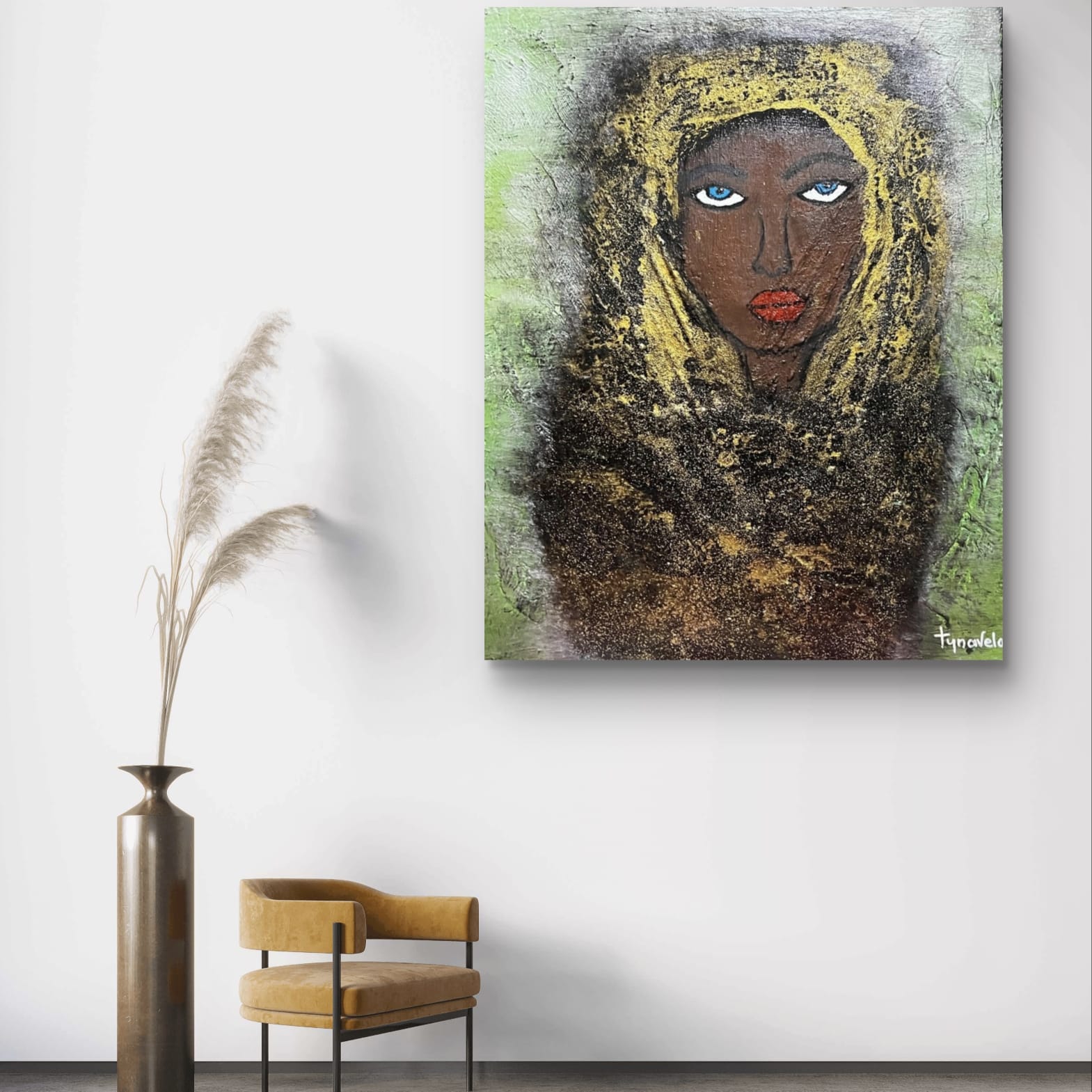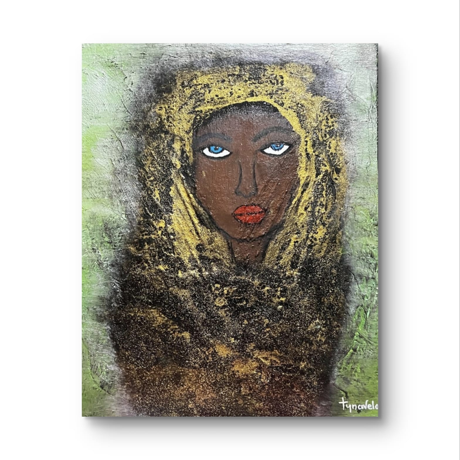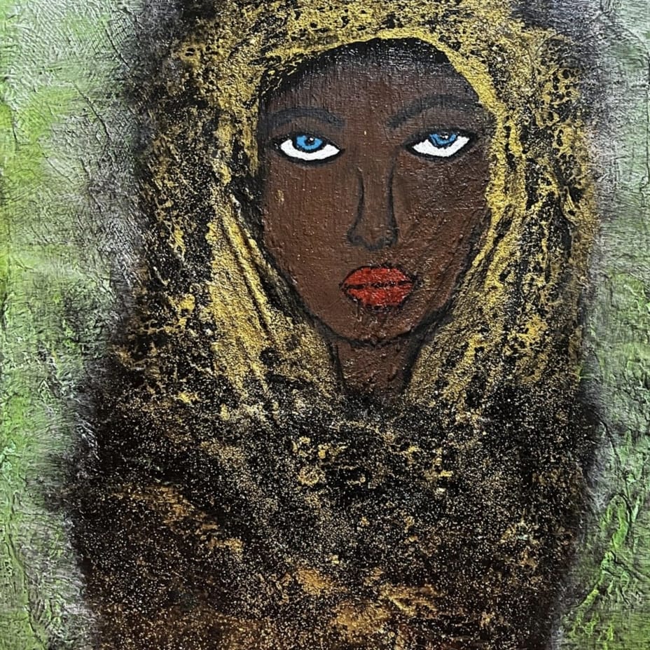 Utilizando técnica mixta que fusiona tradición e innovación: pigmentos acrílicos aplicados en capas sutiles se entrelazan con polvo dorado texturizado, evocando simultáneamente los iconos bizantinos y la expresividad contemporánea. Esta yuxtaposición temporal refleja cómo los códigos de obediencia femenina han evolucionado en su forma pero persistido en su esencia. El fondo verde, trabajado con trazos etéreos que sugieren un espacio natural pero contenido, enmarca a la figura en un limbo entre la libertad potencial y el confinamiento histórico. La composición centralizada otorga a la figura una presencia casi ritual, convirtiendo al espectador en testigo de un silencioso acto de autodeterminación.