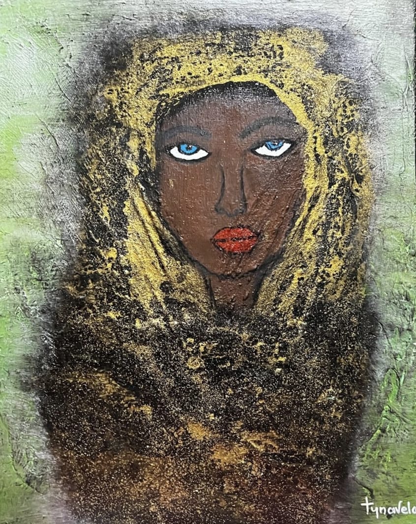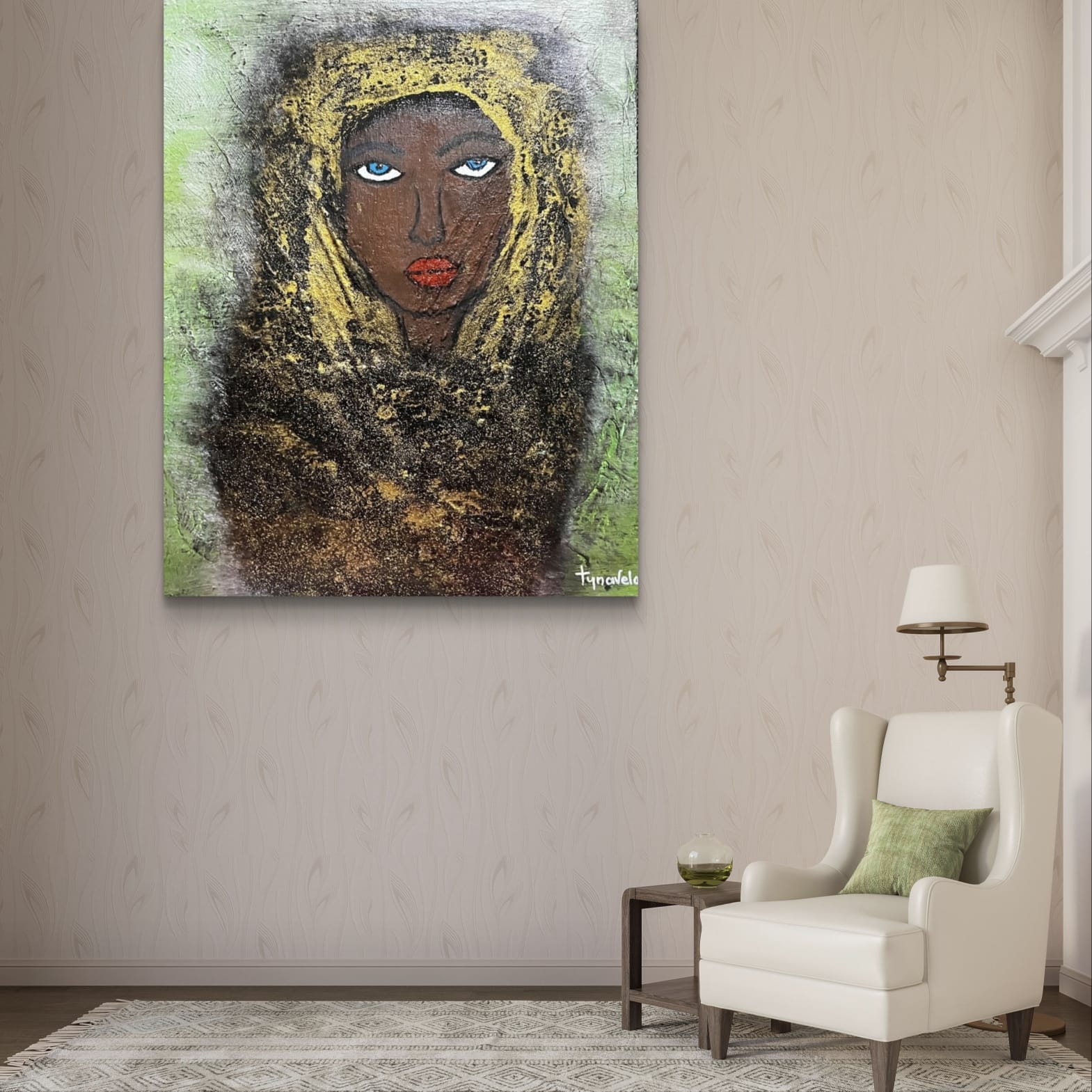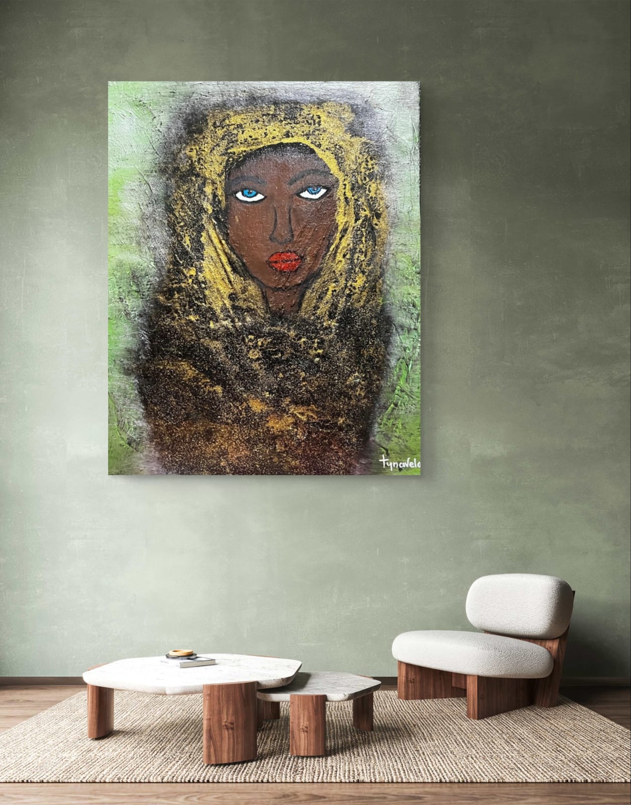 Utilizando técnica mixta que fusiona tradición e innovación: pigmentos acrílicos aplicados en capas sutiles se entrelazan con polvo dorado texturizado, evocando simultáneamente los iconos bizantinos y la expresividad contemporánea. Esta yuxtaposición temporal refleja cómo los códigos de obediencia femenina han evolucionado en su forma pero persistido en su esencia. El fondo verde, trabajado con trazos etéreos que sugieren un espacio natural pero contenido, enmarca a la figura en un limbo entre la libertad potencial y el confinamiento histórico. La composición centralizada otorga a la figura una presencia casi ritual, convirtiendo al espectador en testigo de un silencioso acto de autodeterminación.