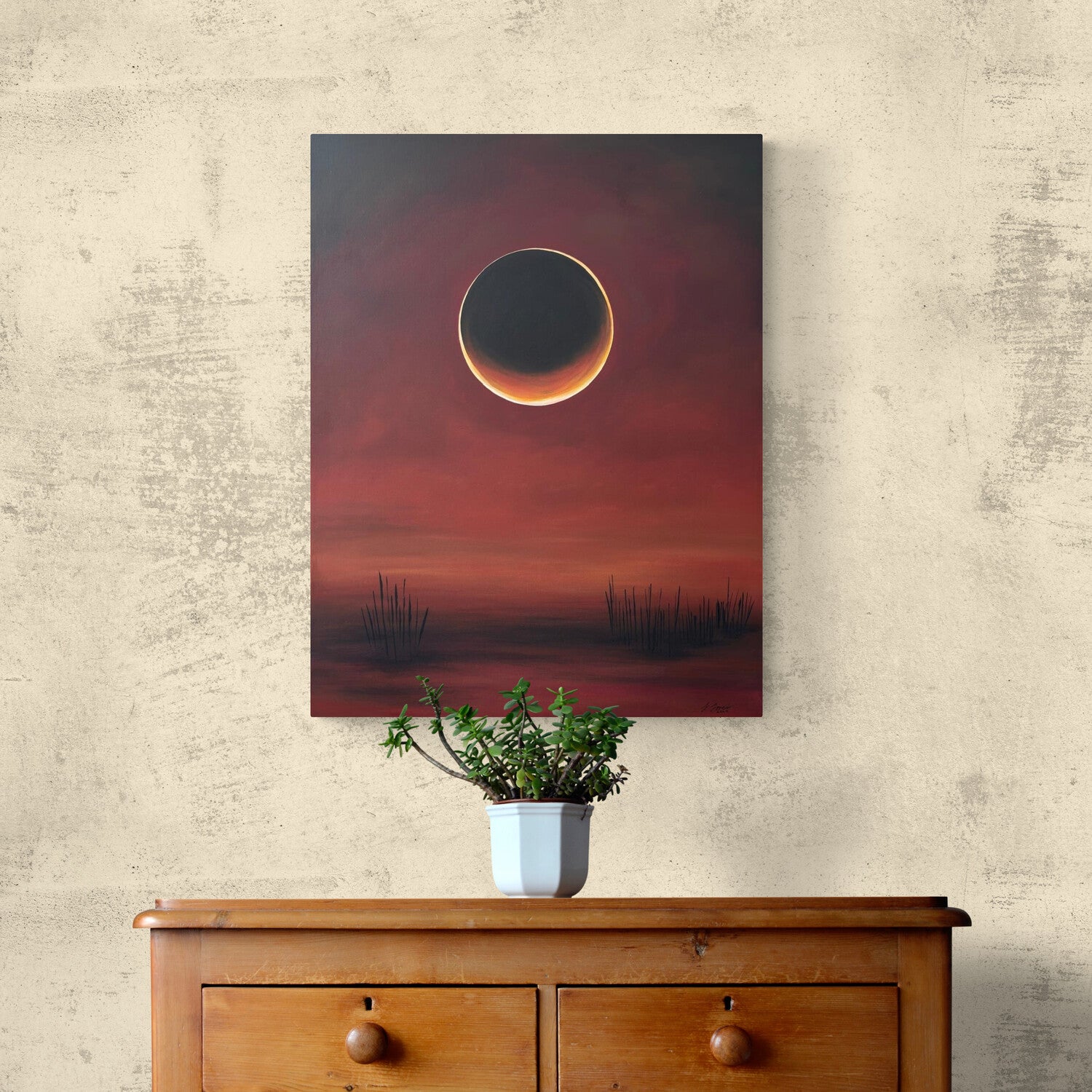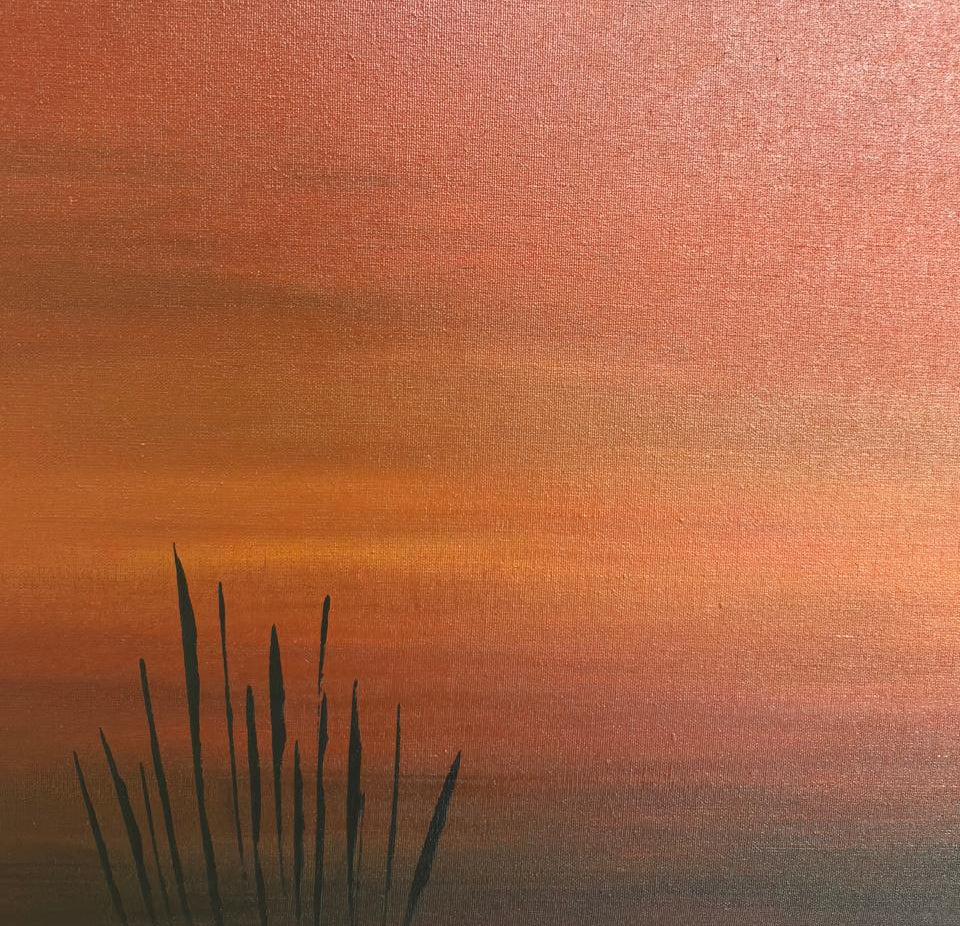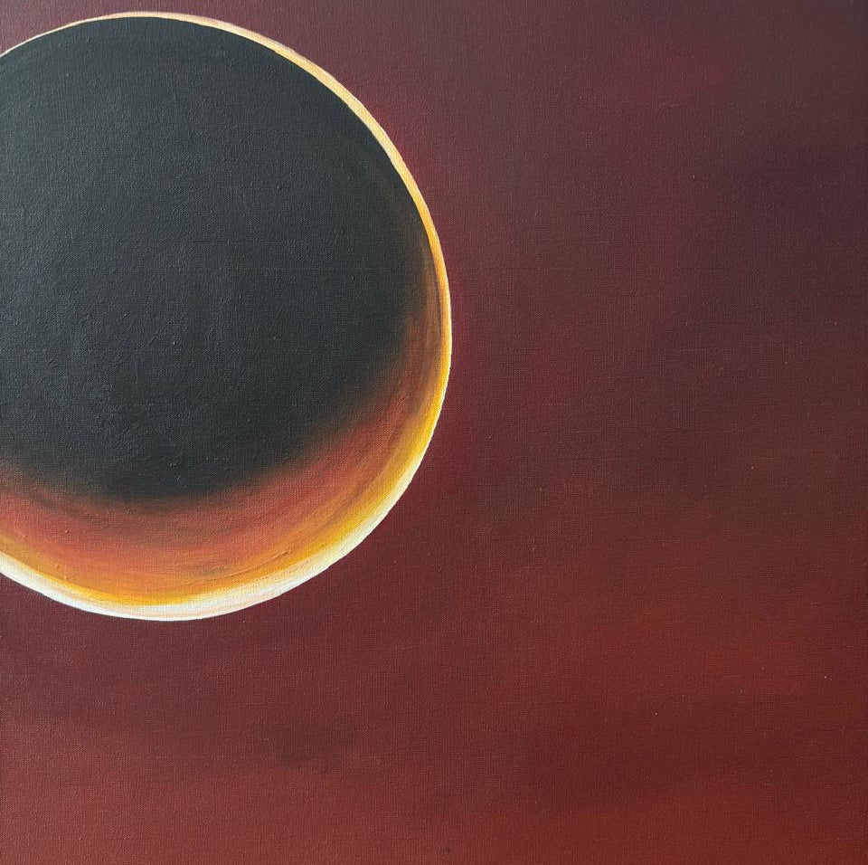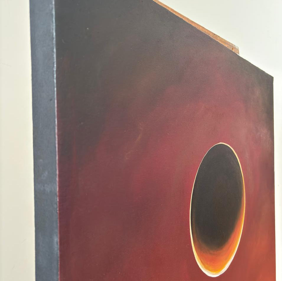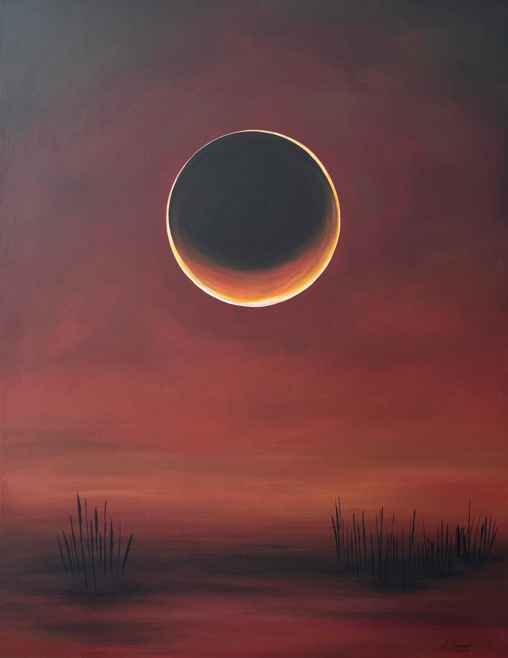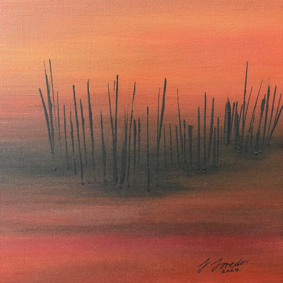 Sol de sangre, obra realizada en el 2024. A través de un lenguaje abstracto, con algunas referencias figurativas, esta obra rememora un paisaje desértico, como lo es mi ciudad natal, donde la vida se abre paso con resiliencia. Las luces del atardecer tiñen de rojo el cielo y la tierra, diluyendo el horizonte con el polvo atmosférico al final del día.