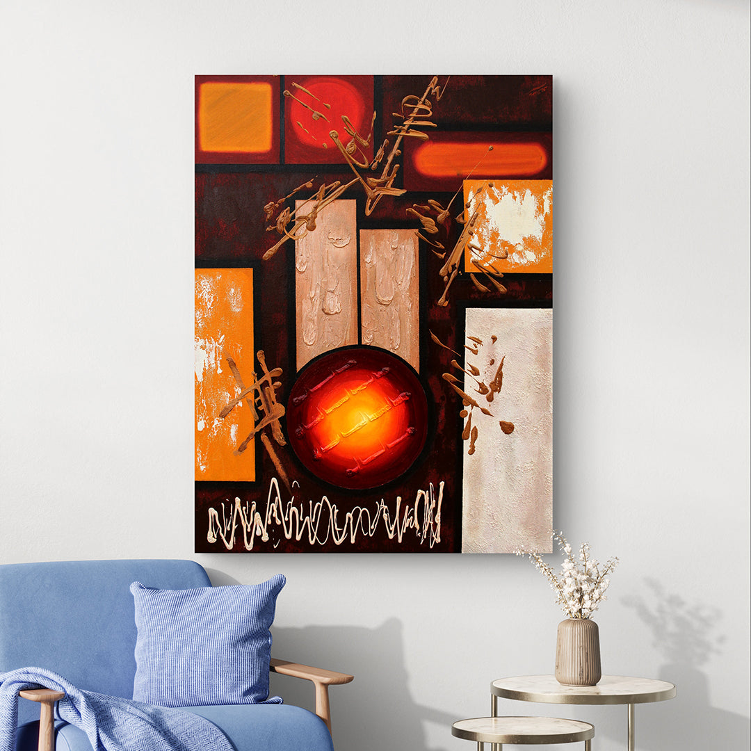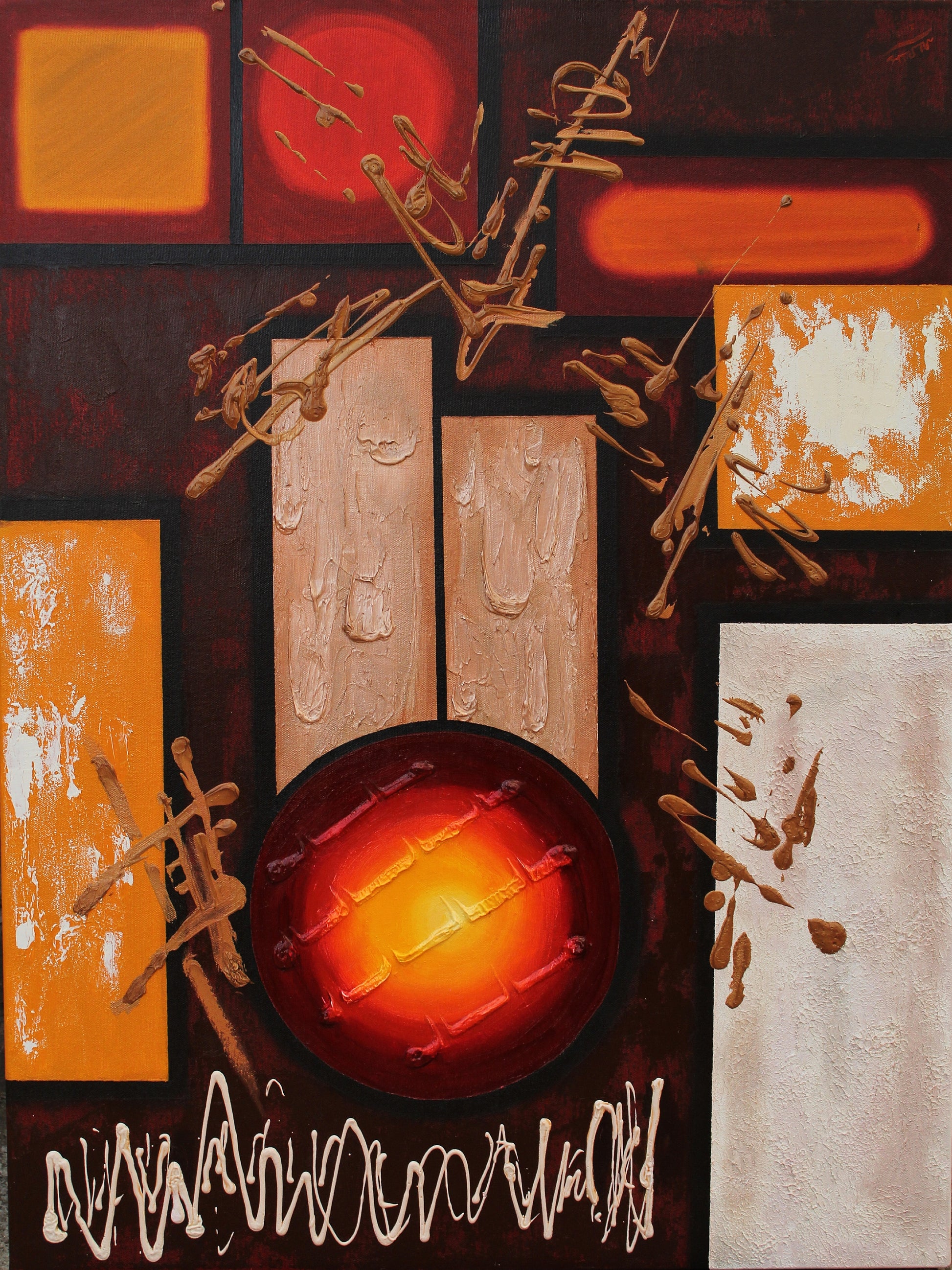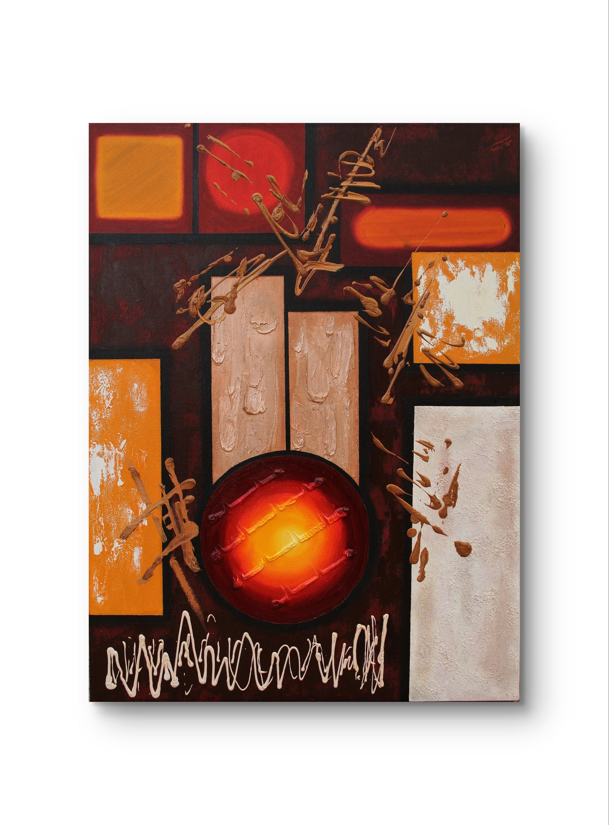 Esta pintura es una abstracción de una ciudad sofocada por el sol. A través de formas geométricas y texturas matéricas, intento representar la arquitectura, el bullicio y la energía contenida en las calles. El círculo central ardiendo simboliza el calor extremo, casi palpable, que todo lo cubre. Las manchas y trazos gestuales evocan el ruido, el movimiento incesante y la vida que vibra bajo la superficie urbana.