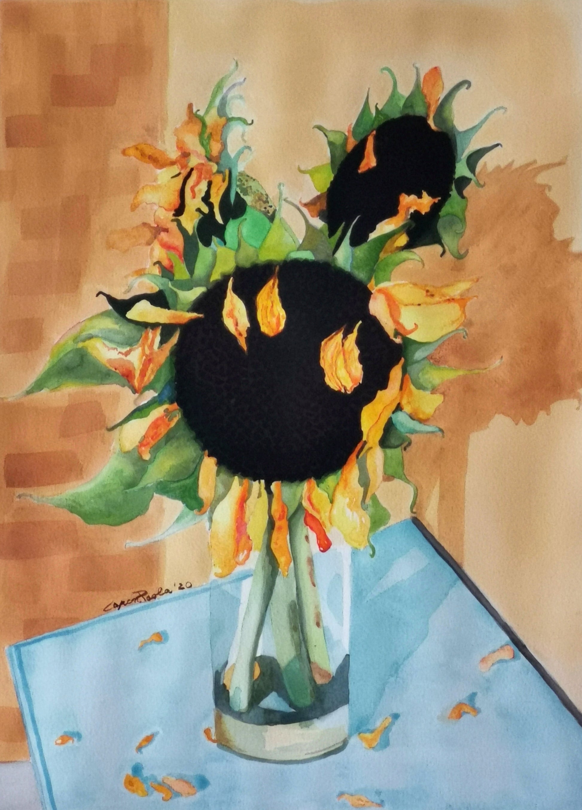 Los girasoles son las flores que más me representan, miran siempre hacia la luz, ¡el sol y se abren a la vida! Como ellos y como en la vida misma, hay estaciones y cada una es bella y tiene su función en la naturaleza. A pesar de envejecer, ese ramo seguía hermoso y quise pintarlo como un paralelo con la madurez y la viejez de las personas.