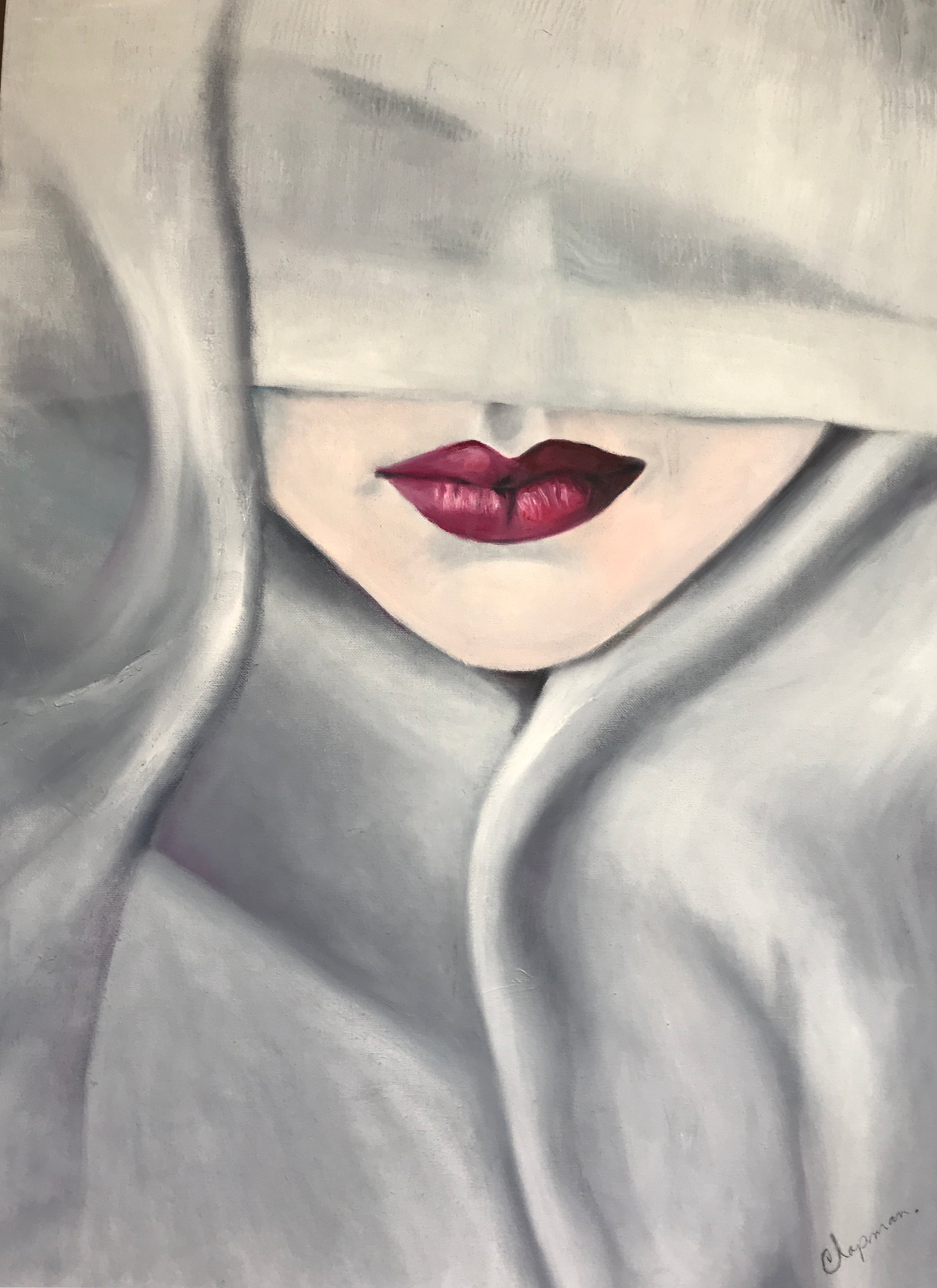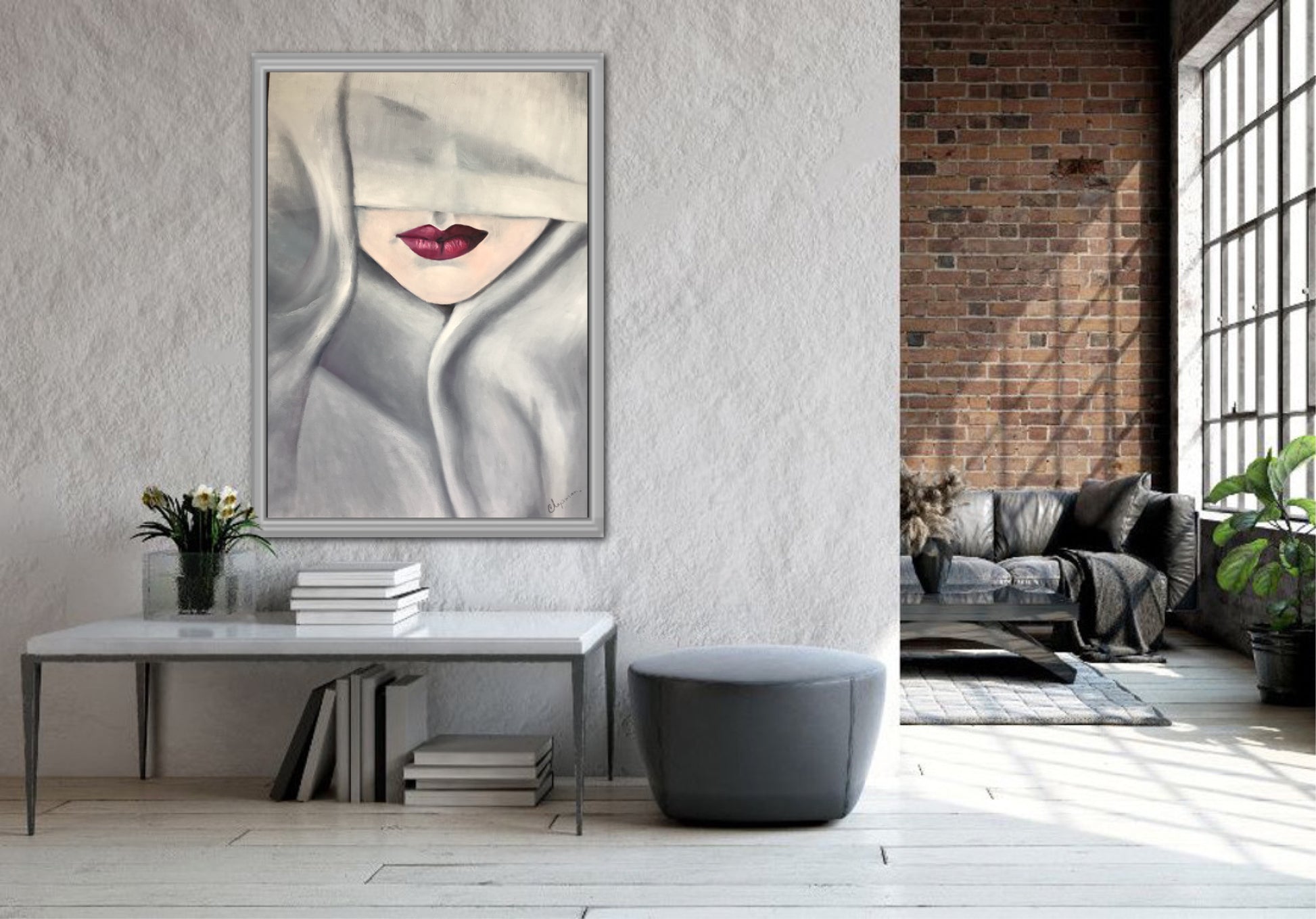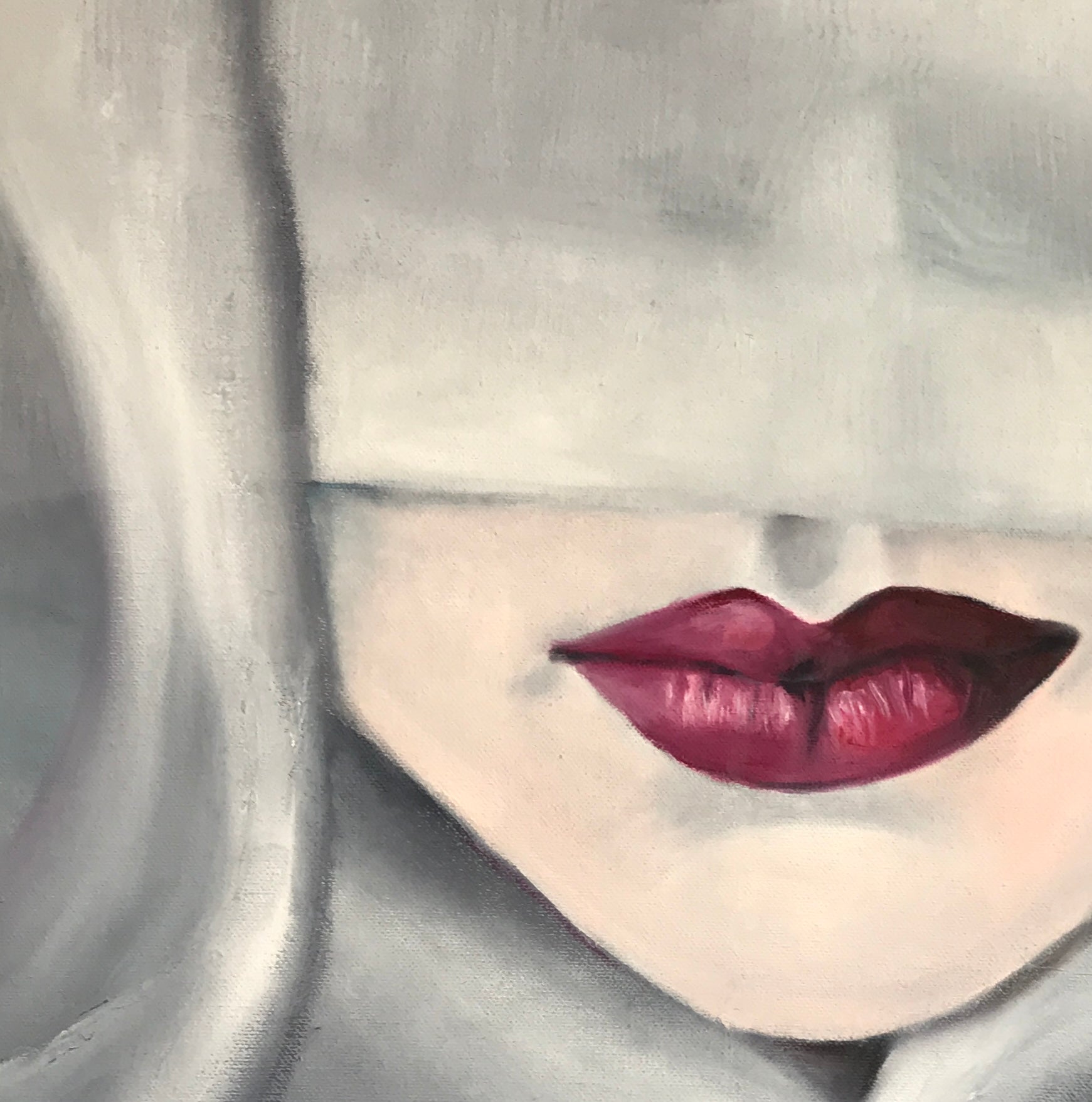 "Solo para tus ojos" obra intrigante y evocadora capturado un rostro humano de manera inusual y misteriosa. La figura está parcialmente oculta por una tela transparente que cubre los ojos, dejando al descubierto solo la zona desde la punta de la nariz hasta el mentón. Los colores son sutiles el Gris: Representa la ambigüedad y la incertidumbre, como si el rostro estuviera atrapado entre lo visible y lo oculto. Blanco: Simboliza la pureza y la transparencia de la tela que cubre los ojos. Labios rojos: Contrastan fuertemente con la paleta de colores suaves, atrayendo la atención hacia esta parte visible del rostro. Los labios rojos pueden sugerir pasión, deseo o incluso silencio. Es una obra que despierta la curiosidad y la contemplación.
