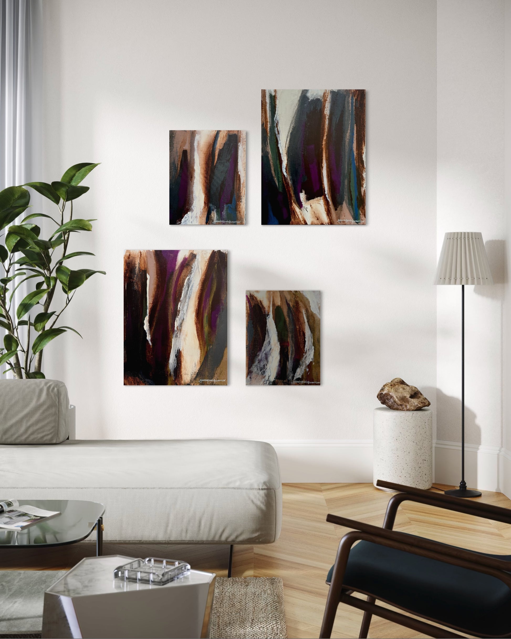 La paleta mantiene una base de ocres terrosos, marrones cálidos y beiges luminosos, acompañados por matices de gris suave y leves acentos de violeta diluido. Los tonos claros se integran progresivamente en las zonas más profundas, creando un equilibrio entre luz y sombra sin contrastes abruptos.