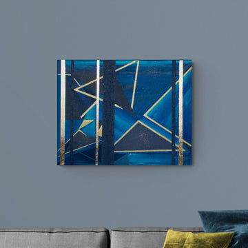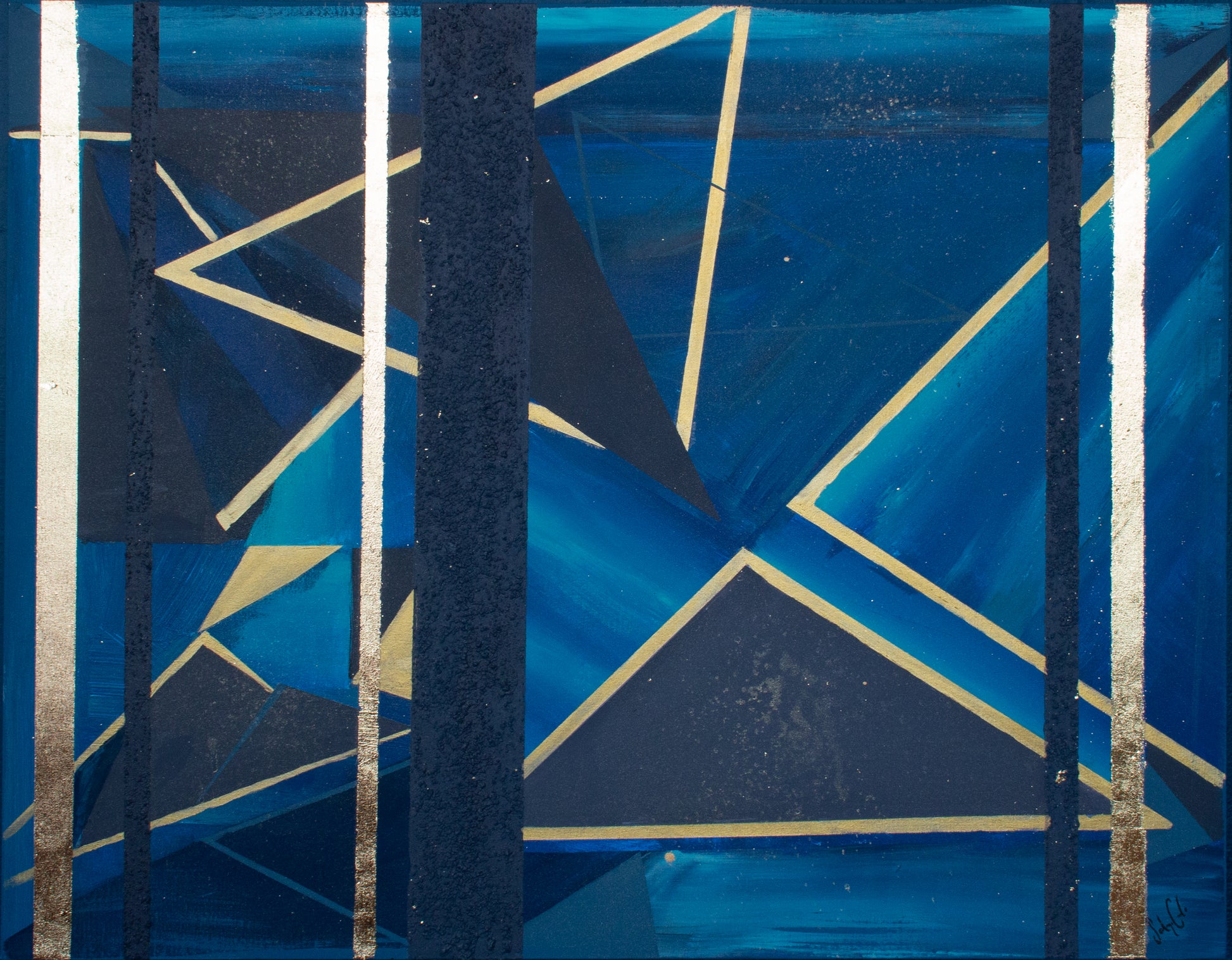 Pieza abstracta de acrílico y hoja de oro, en tonos azules y dorados, con estilo geométrico, basada en "Sonata Semplice" de Mozart.
