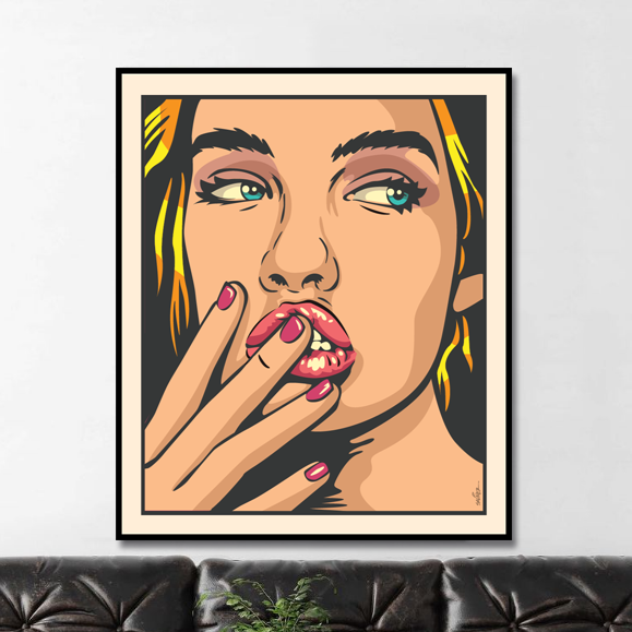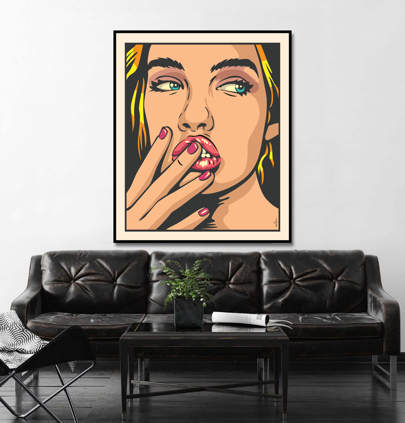 Una cara de mujer expresando sorpresa, en gran formato en un cuadro colgado en un muro, cómo si observara el entorno, no pasa desapercibido. Un tema para decorar.