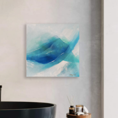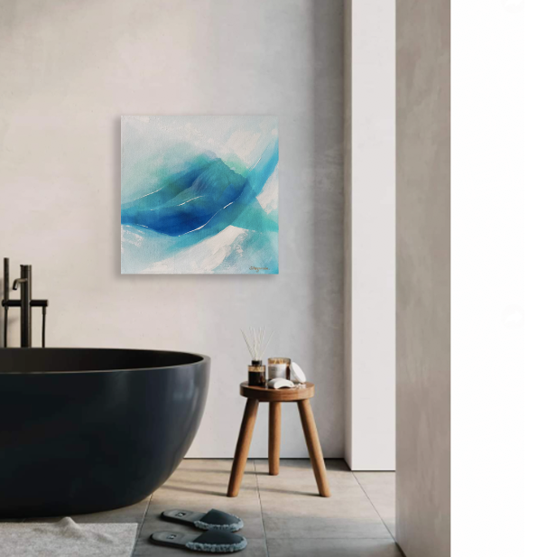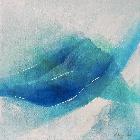 Esta obra, en azules y turquesas, está inspirada en la necesidad de mantenerse dinámico, abiertos al cambio, al movimiento, y hacerlo con gracia. Está hecho con diferentes materiales, viendo un poco de pastas dentro de la ligereza de la obra.