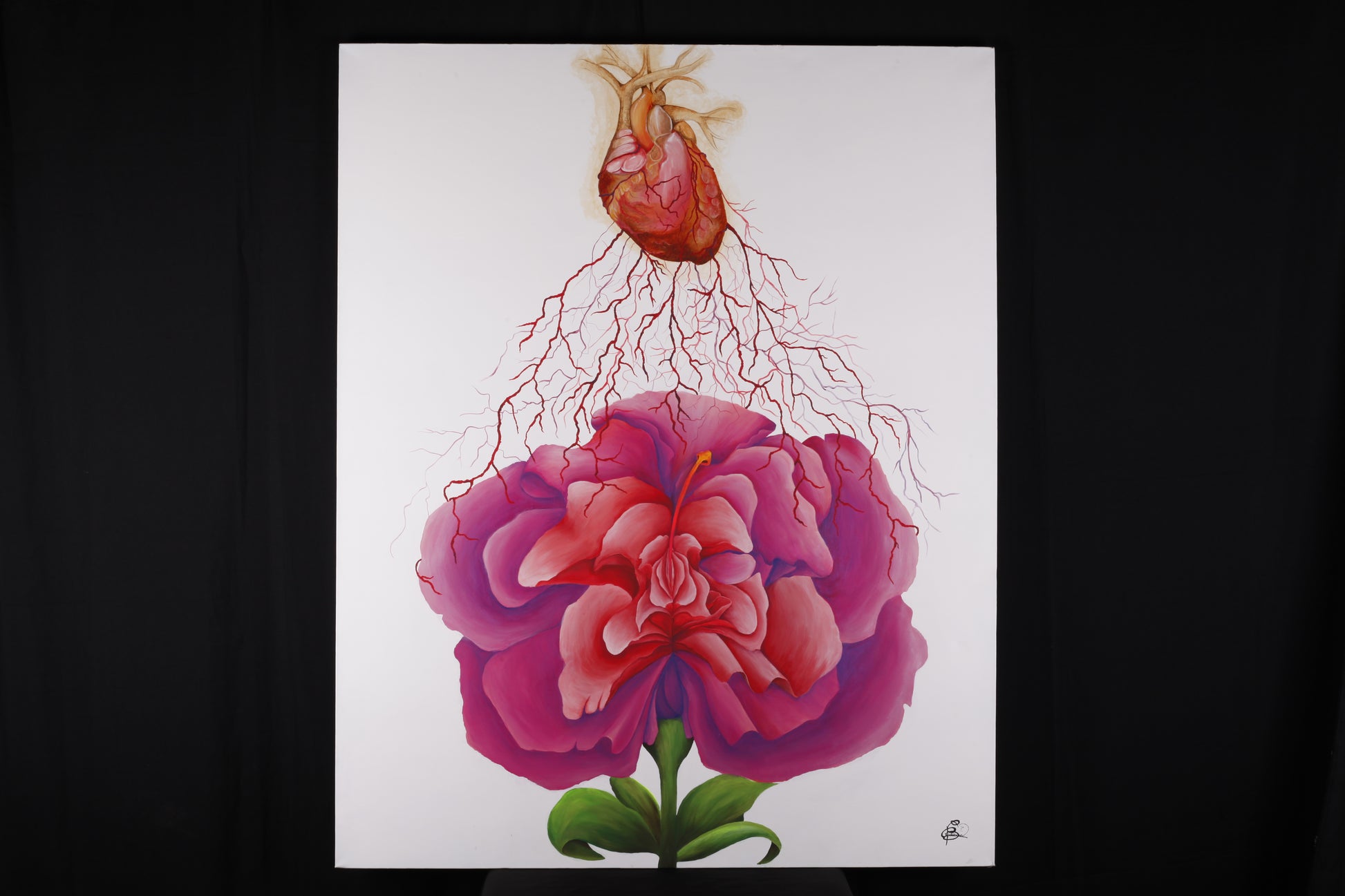“Suavidad y Carne” es una pintura de acrílico sobre tela que utiliza rojos, naranjas,
