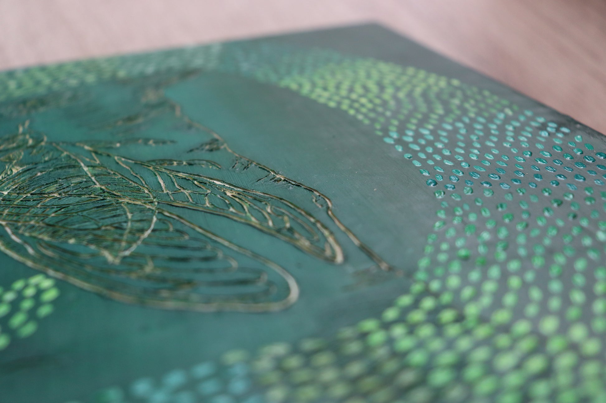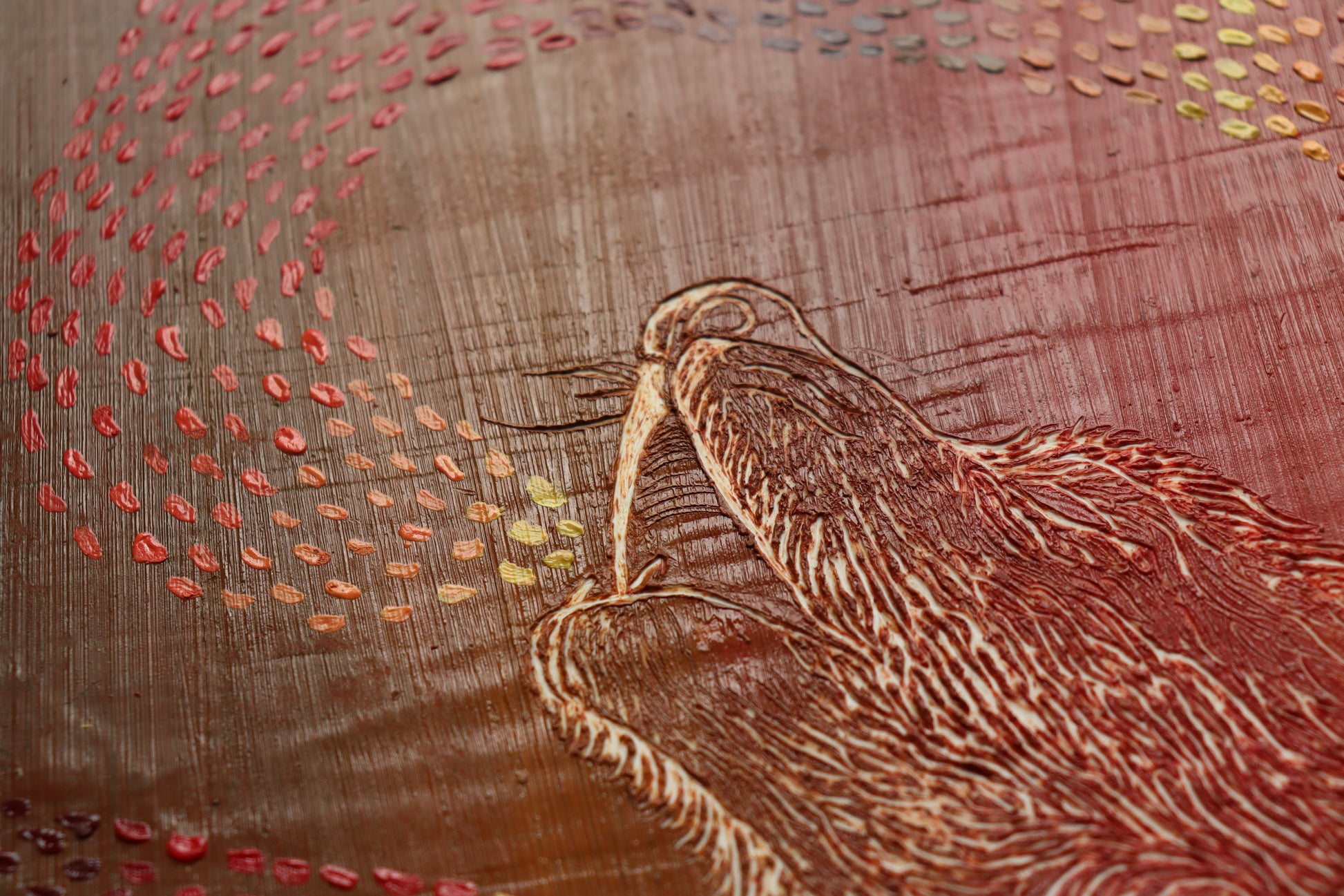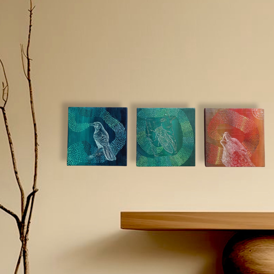 Esgrafiado sobre encáustica; Composición de 3 Cuadros de Madera