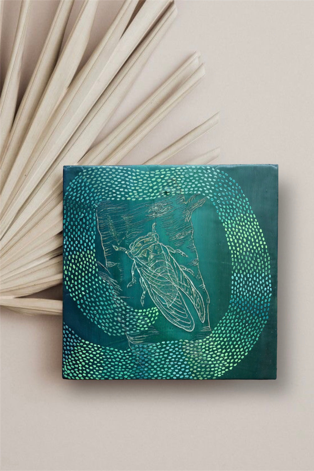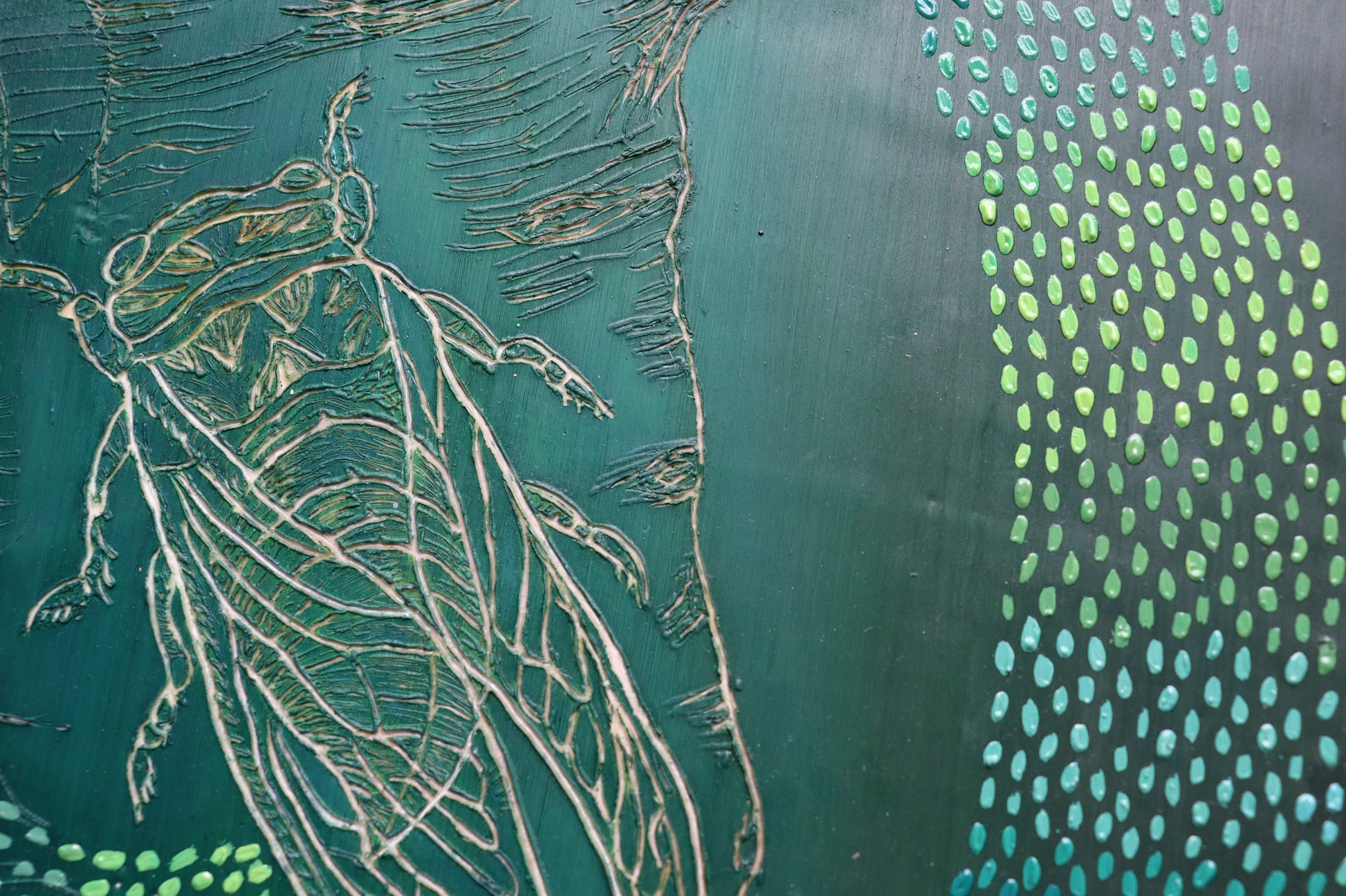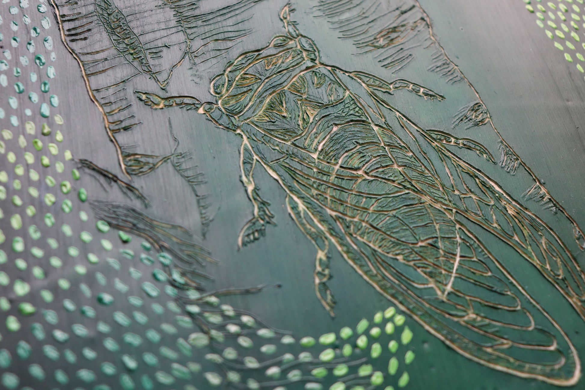 La chicharra representa la zona centro, celebra los vibrantes tonos verdes de los bosques y el sonido hipnotizante de las chicharras al caminar por el bosque.