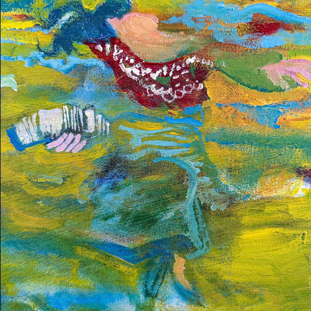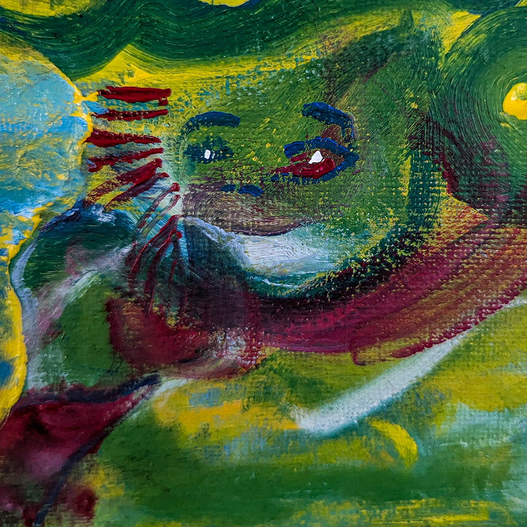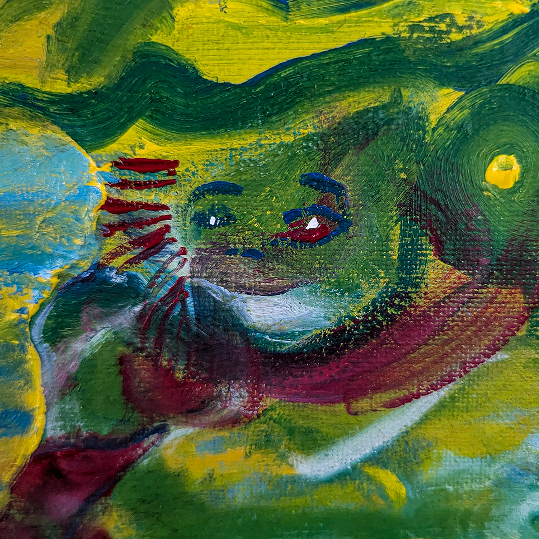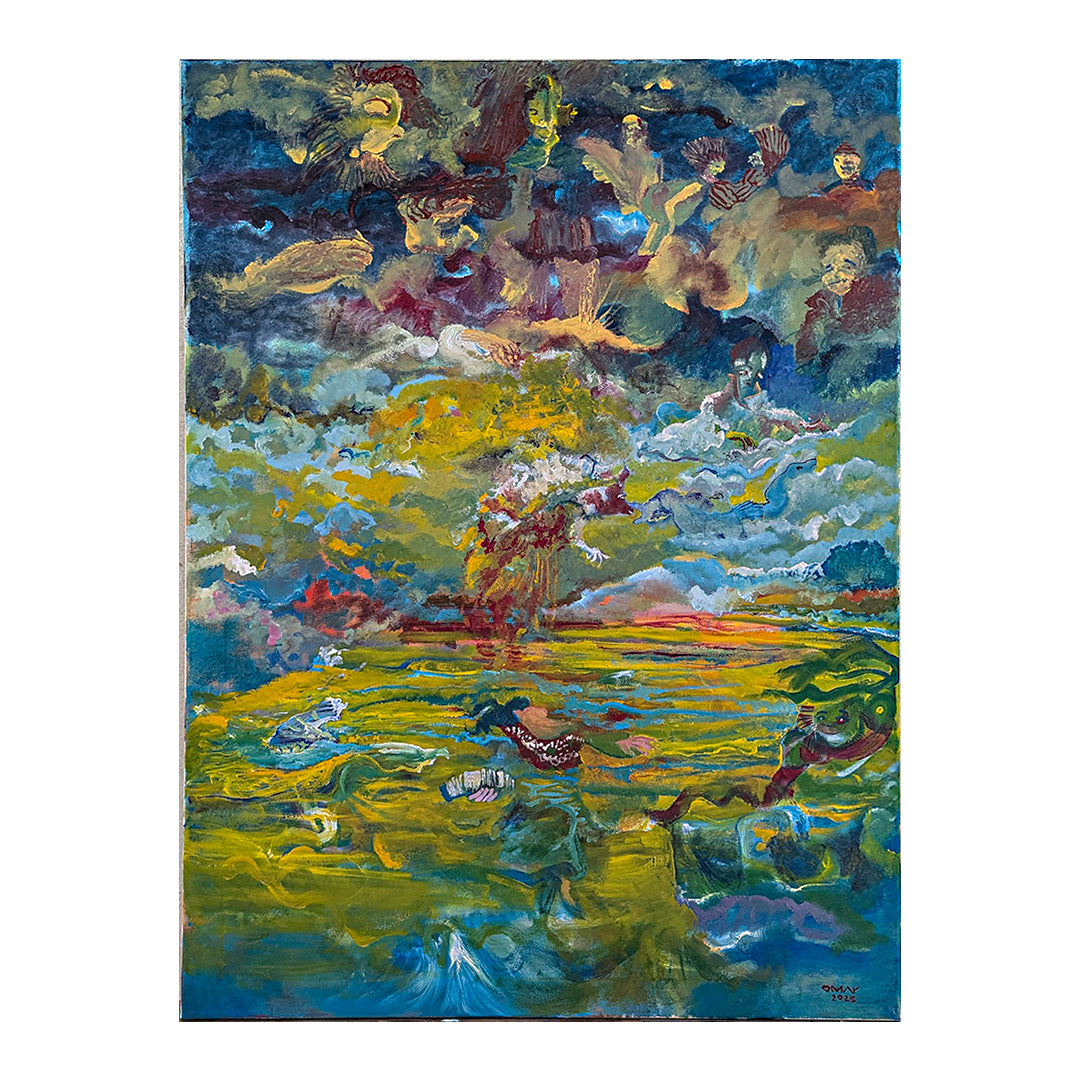 Un paisaje líquido, casi vegetal, vibra en tonos verdes y amarillos, criaturas indefinidas, seres que parecen surgir del subconsciente o de una memoria arcaica.