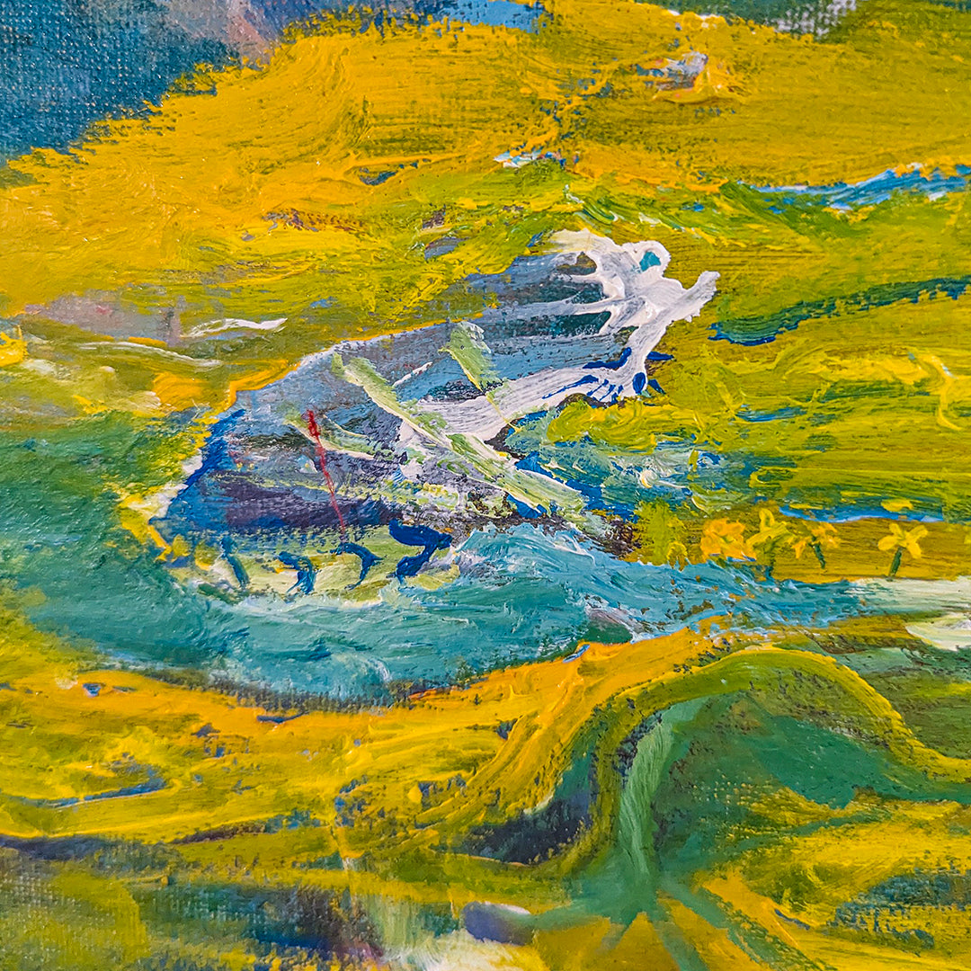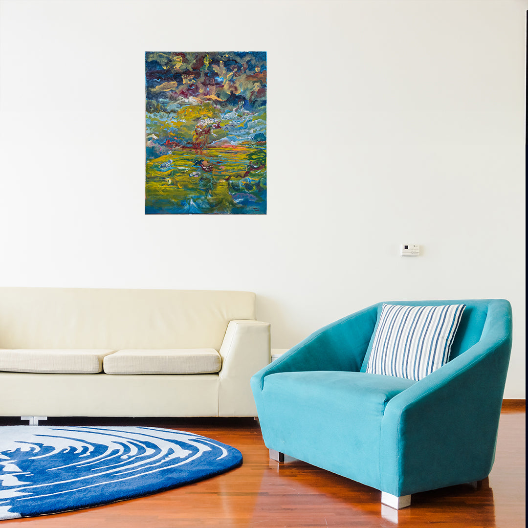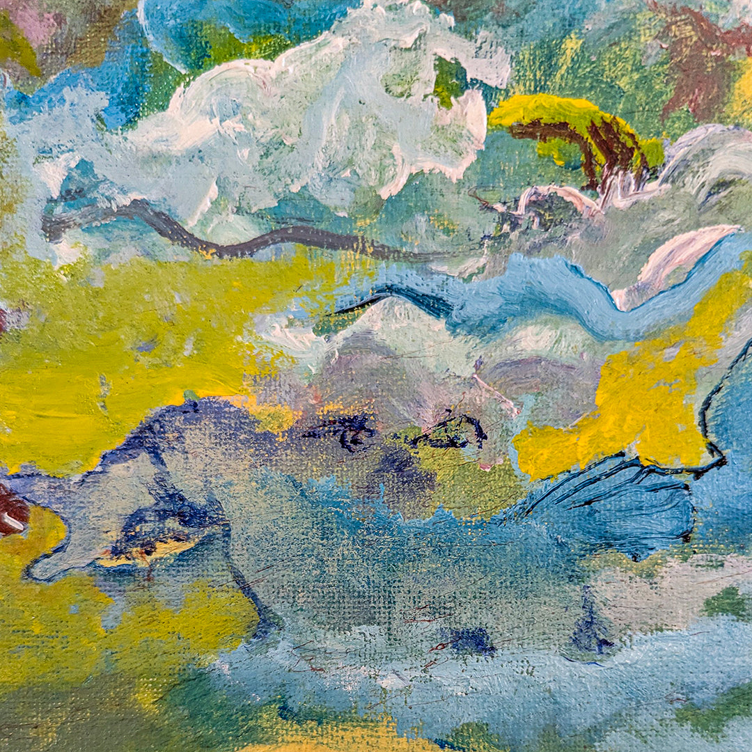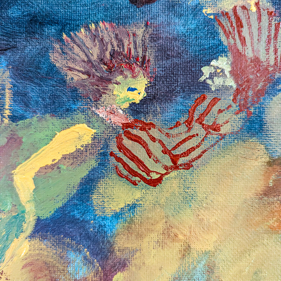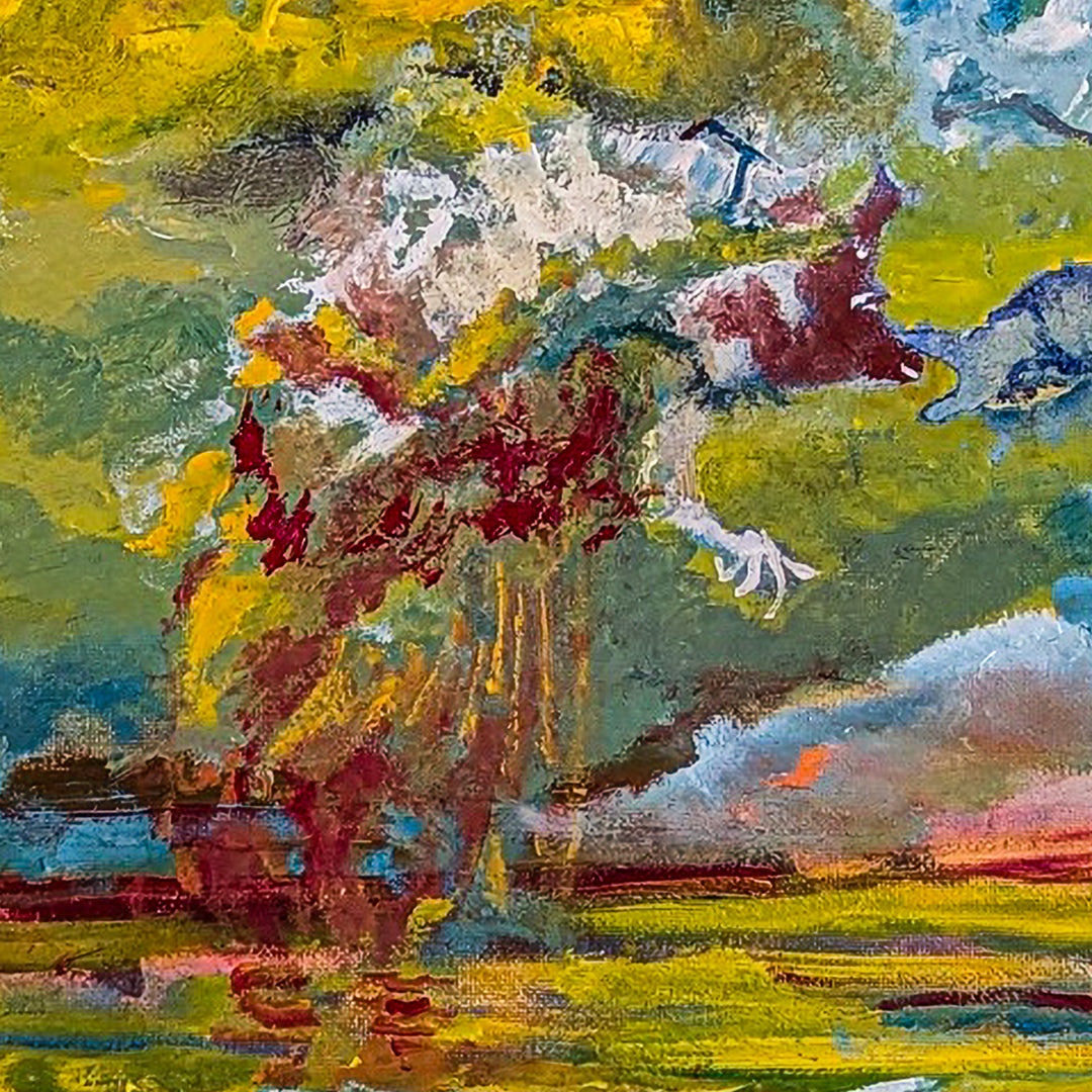 Un paisaje líquido, casi vegetal, vibra en tonos verdes y amarillos, criaturas indefinidas, seres que parecen surgir del subconsciente o de una memoria arcaica.
