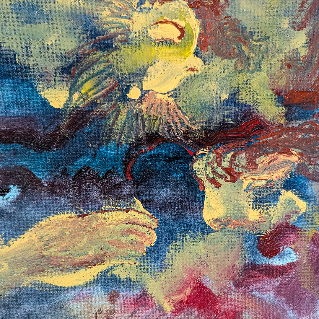 Sobre ellos, el cielo se transforma en un teatro de almas, representando la tensión entre lo terreno y lo etéreo.
