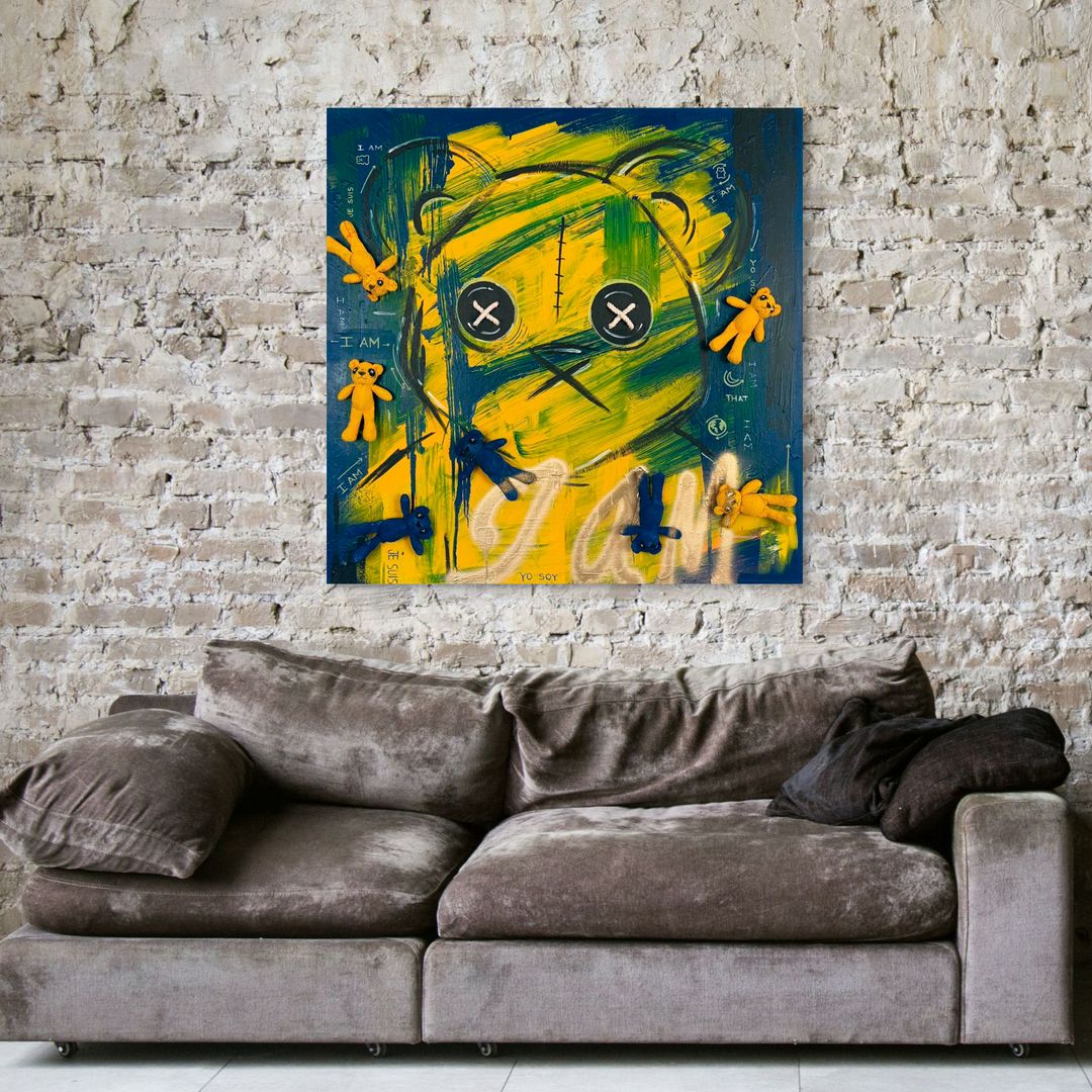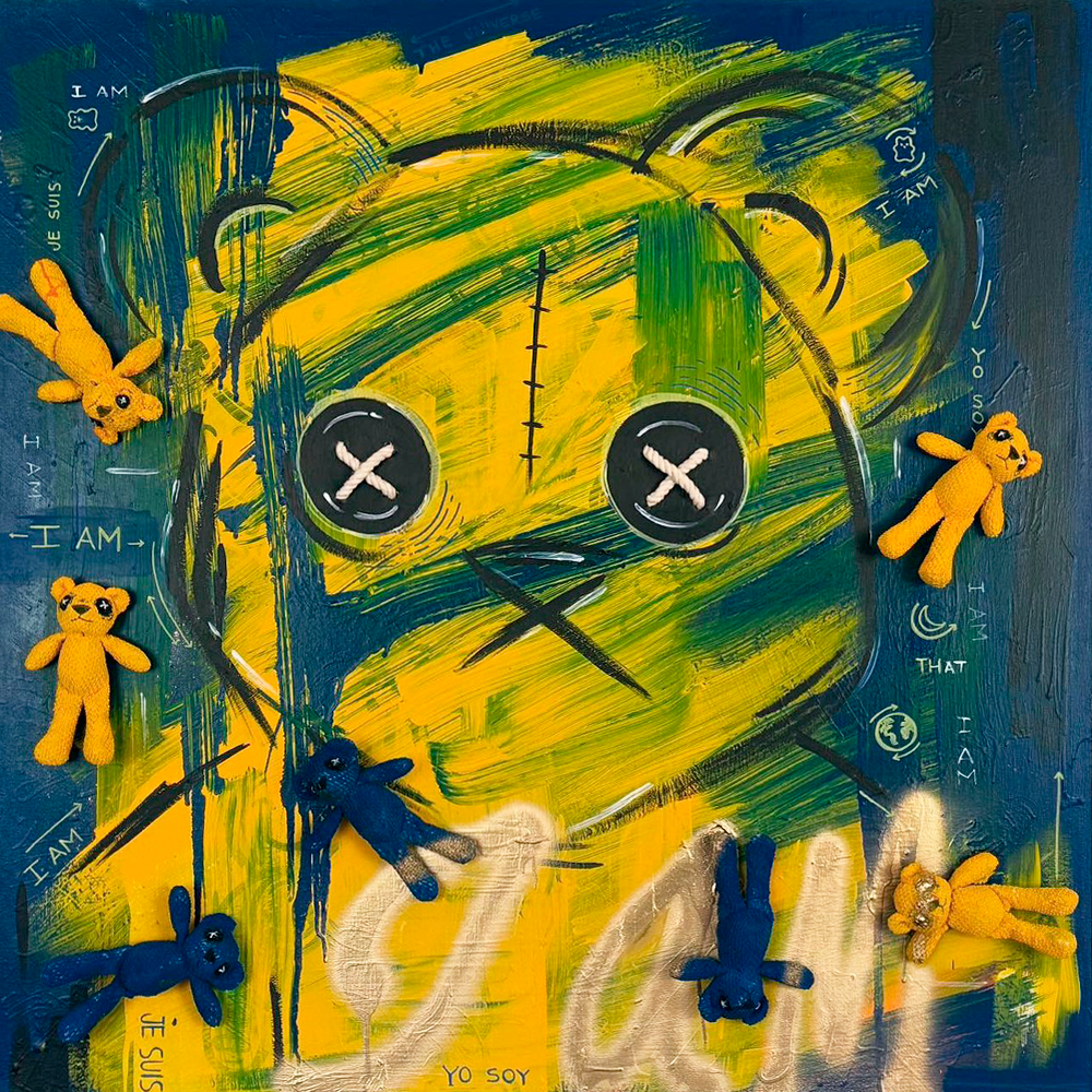 Técnica mixta con acrílicos sobre tela en canva con ositos de peluche.