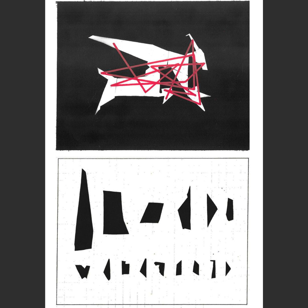 Después, partiendo de este orden, los fragmentos fueron unidos en las composiciones mediante una línea roja que seguía el criterio de clasificación previa. Esto dio como resultado un tipo imprevisto de visualidad en las composiciones iniciales.