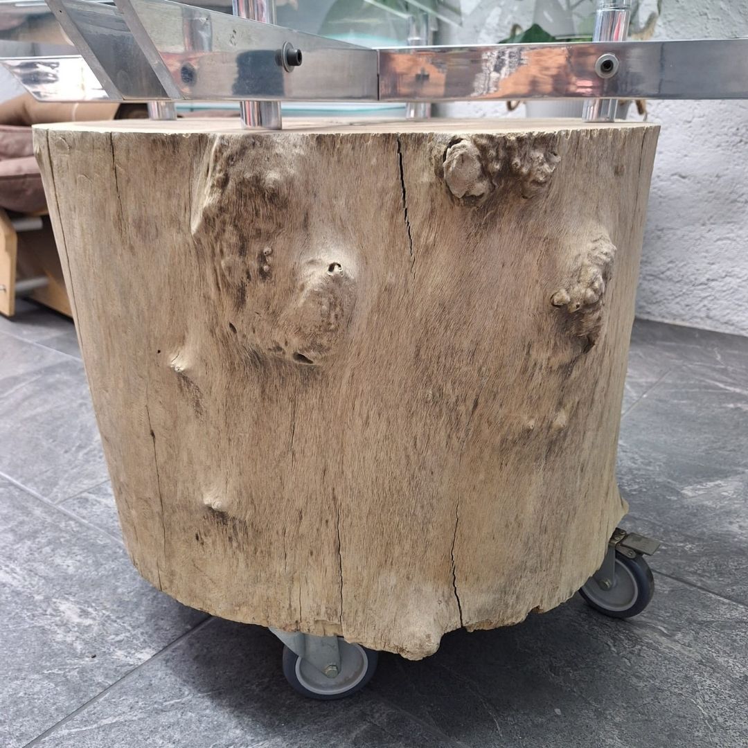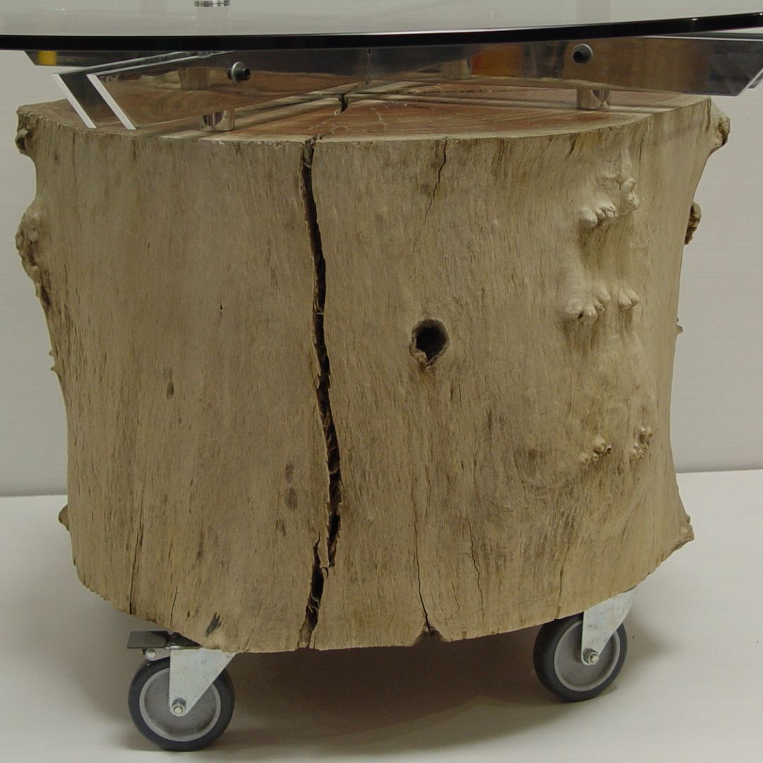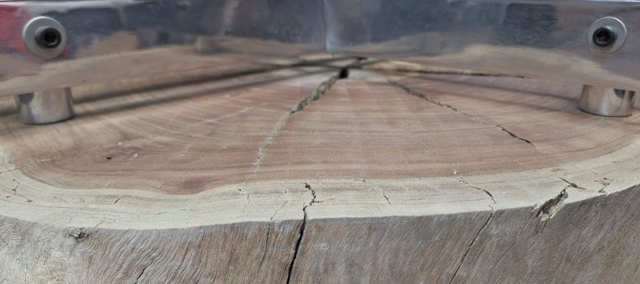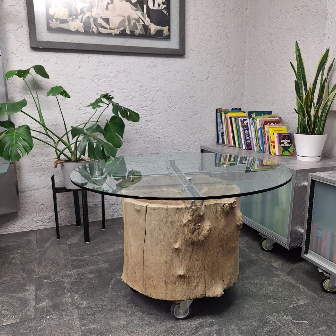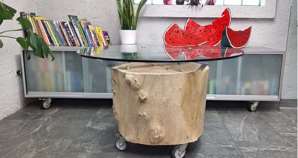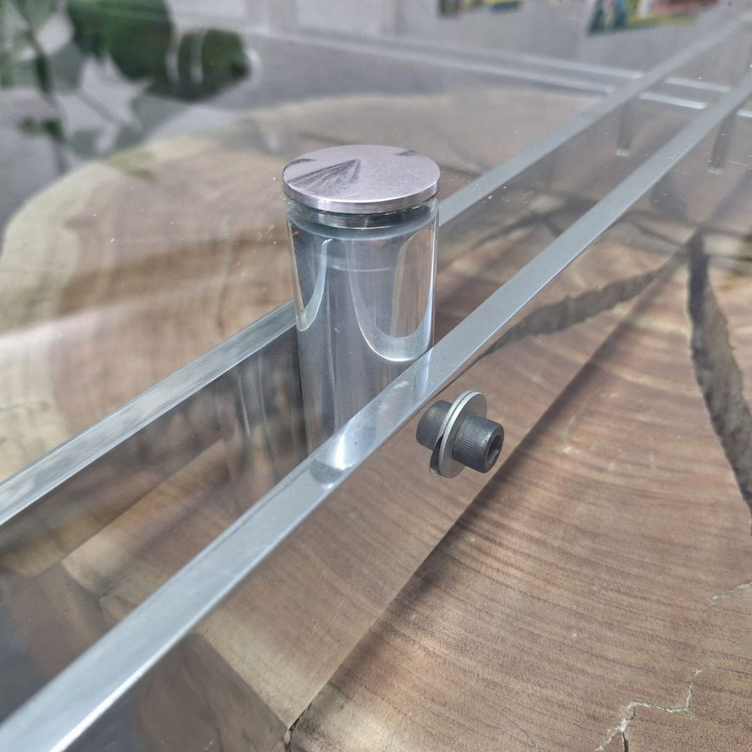 Mesa con base de madera natural de eucalipto, cruceta de placa de aluminio al alto brillo y cubierta de cristal claro de 10mm de espesor, con canto pulido brillante