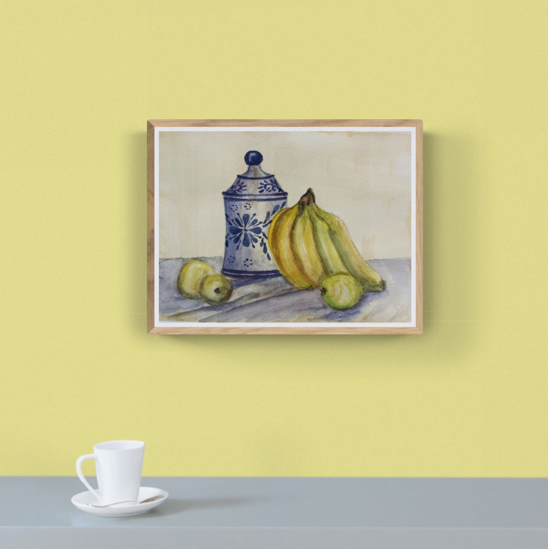 La magia de la Talavera mexicana en nuestro país. Plasmo la belleza de esta artesanía con un dulce bodegón con plátanos y unas guayabas ideal para armonizar tu habitación.
