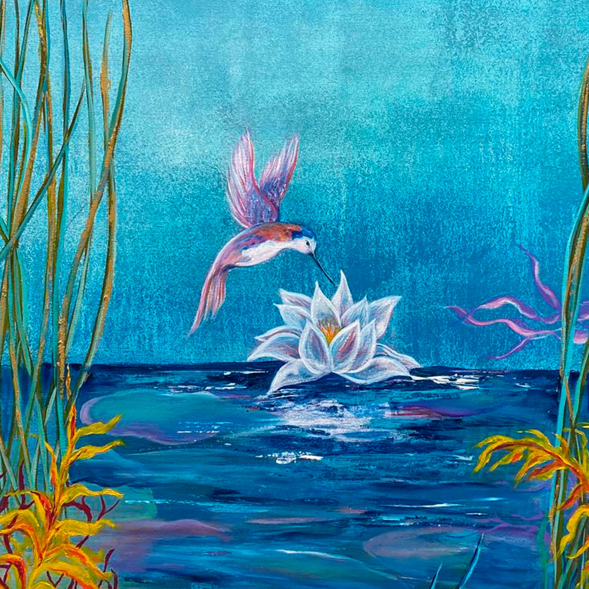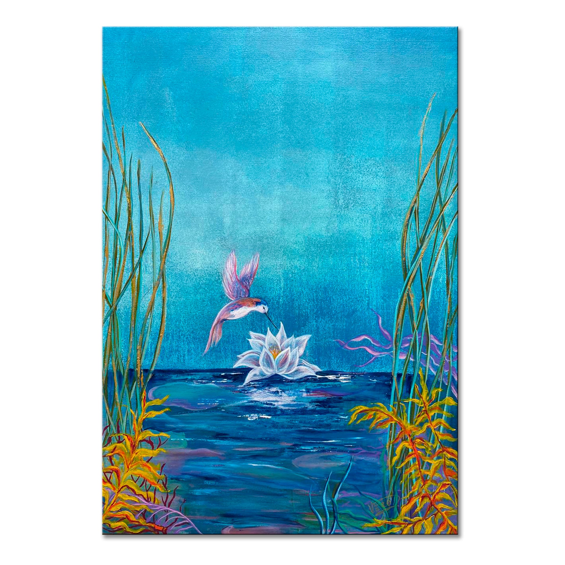 En la colección Almas Azules, el agua y el azul se unen en una obra que trasciende lo convencional. El colibrí, con sus colores mágicos, nos muestra la vida y la adaptación en armonía con la naturaleza.