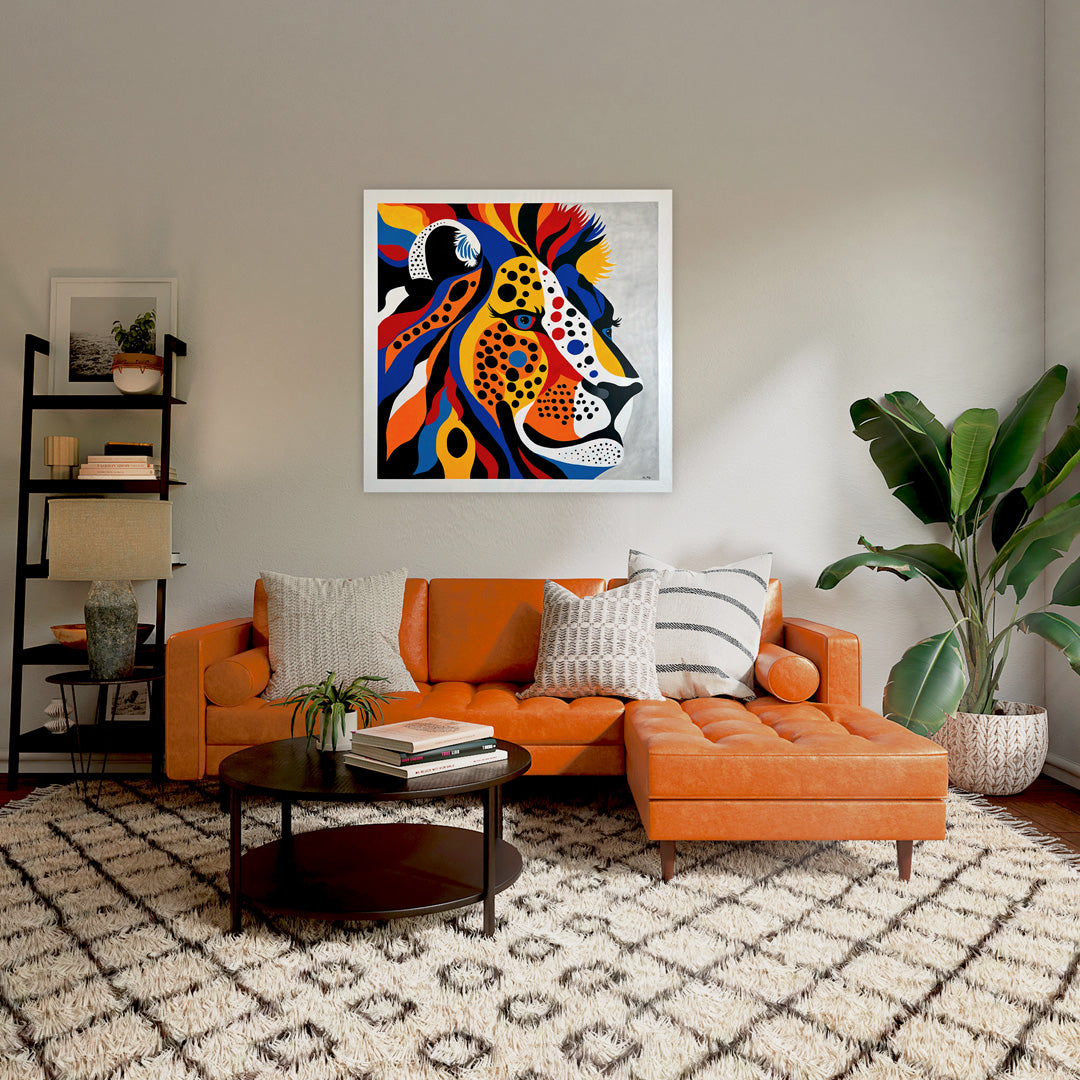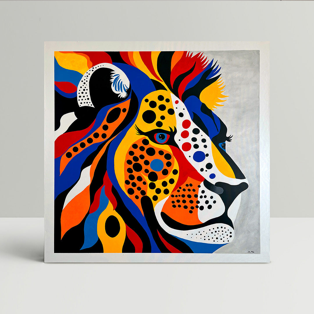 Retrato Pop Art majestuoso (rojo, azul, amarillo) y lunares crean una melena dinámica que irradia fuego y orgullo. La fuerza del león evoca al "Tecuani" náhuatl (que significa "el que come gente" o "fiera").