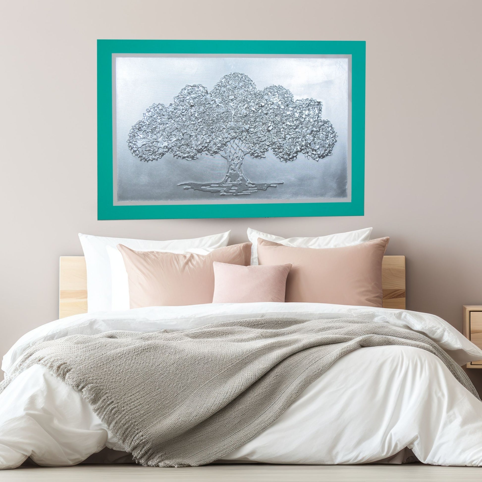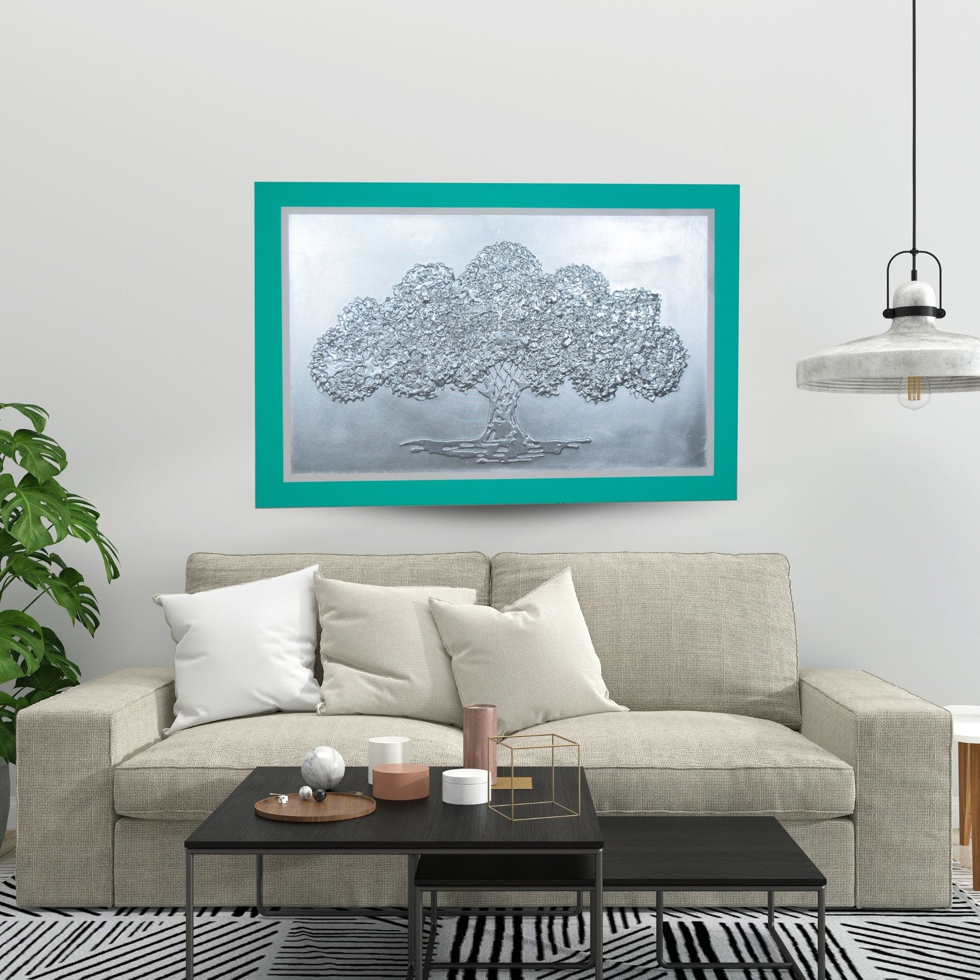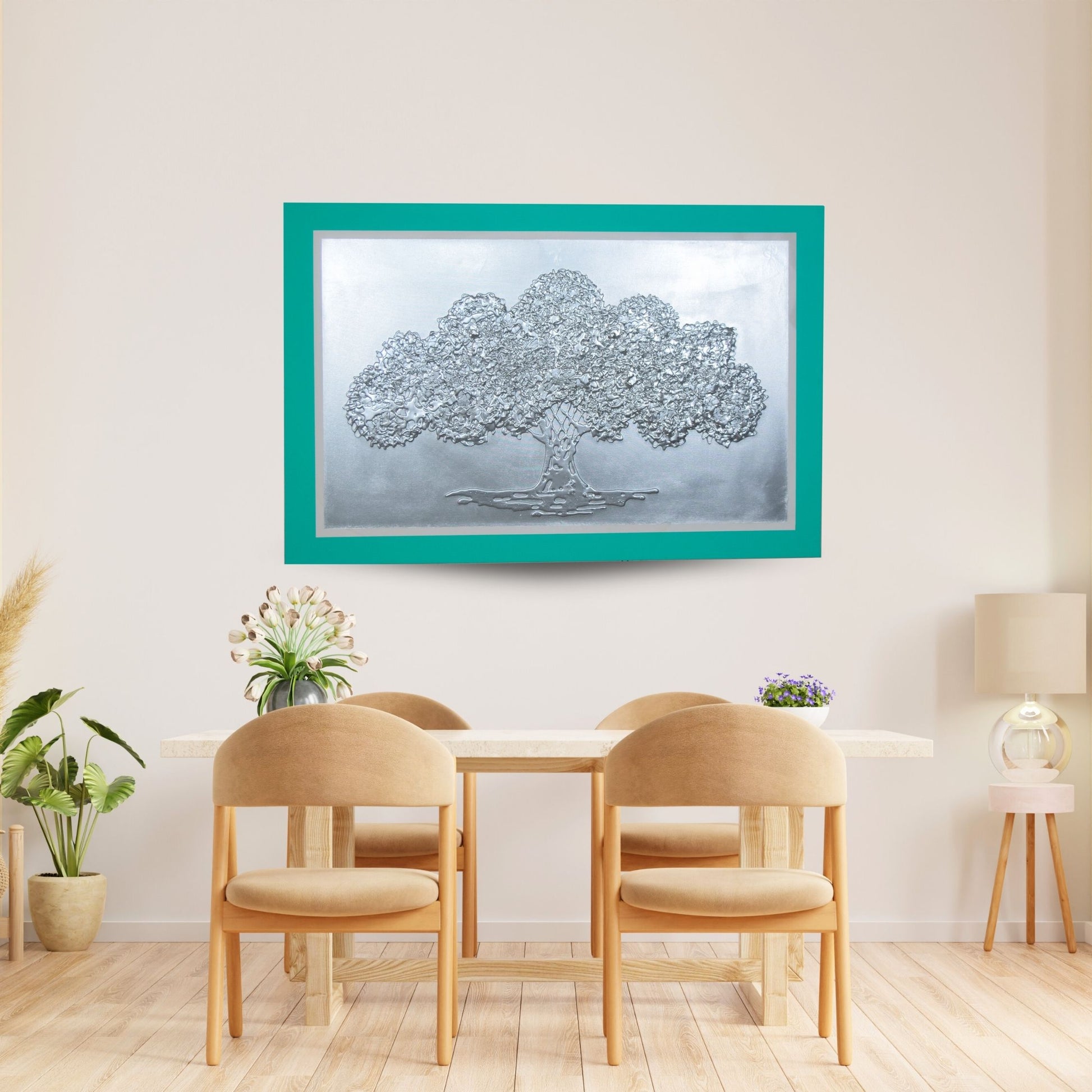 Cada detalle de esta pieza ha sido meticulosamente elaborado para evocar una sensación de modernidad y refinamiento. Montado sobre un bastidor de madera de primera calidad, "Plata Light" no solo es una declaración artística, sino una inversión duradera y de alta calidad que realzará cualquier espacio. Sus tonalidades plateadas y la interacción de sus texturas crean un punto focal cautivador