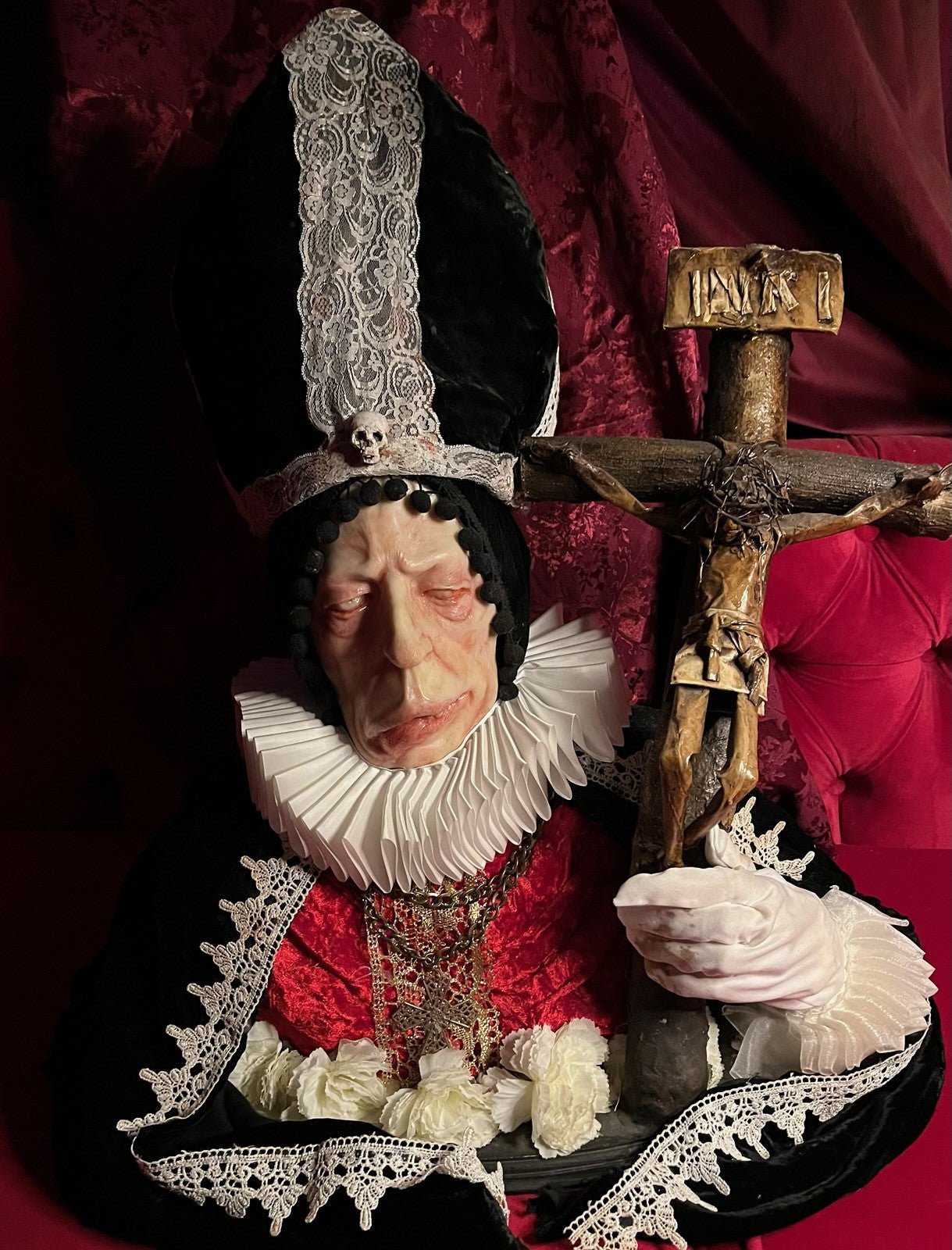 "The Blind Pope" representa el lado oscuro, maligno y distorsionado del catolicismo en tiempos medievales. Tomando a Jesucristo de bandera y su vistoso poder, pero ciego a la muerte de muchos y a la corrupción de la Iglesia. Sus palabras se derriten en su horrorosa boca al mentir. Grotesco en su magnánimo ser.