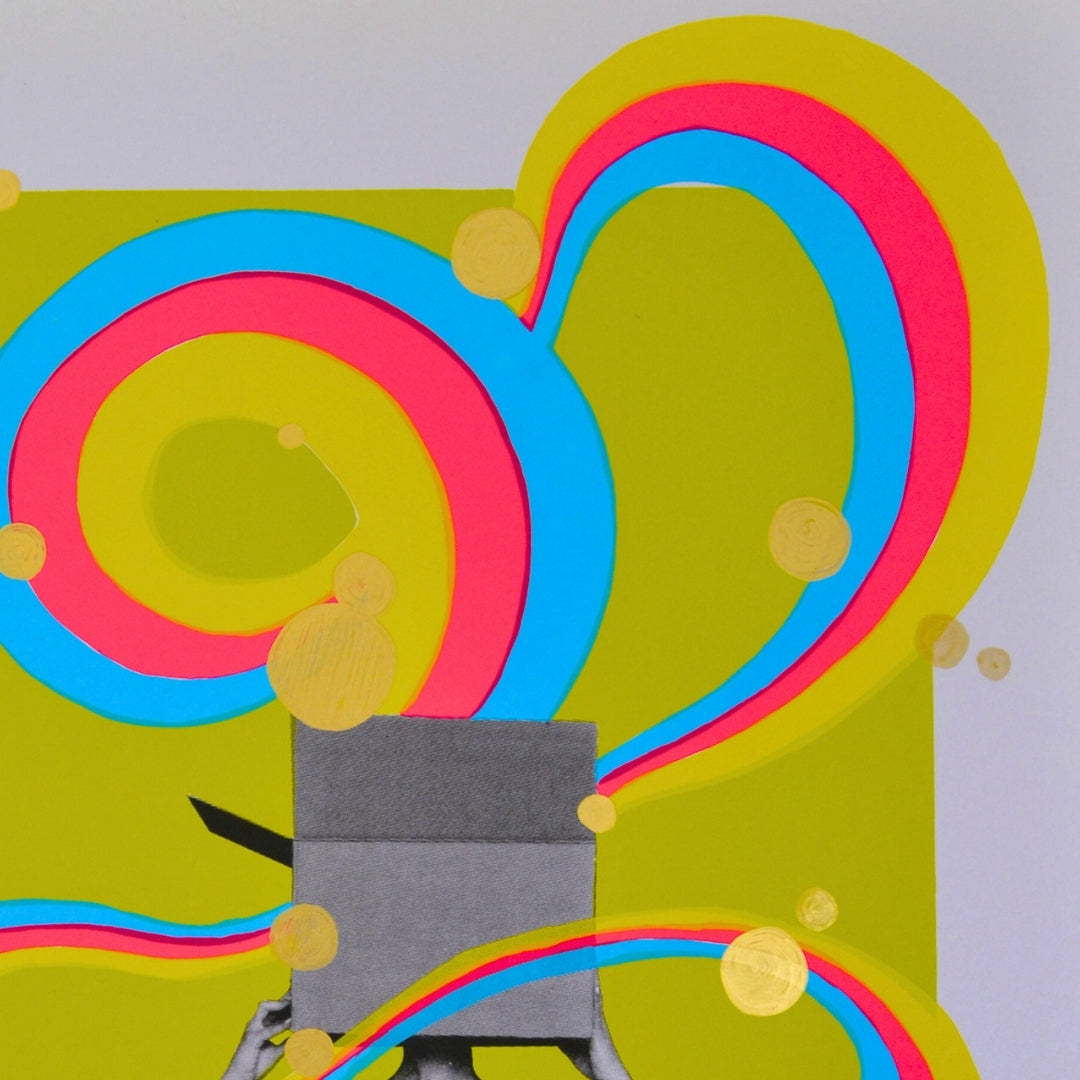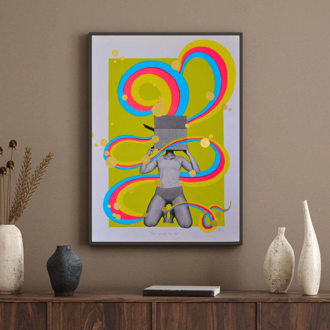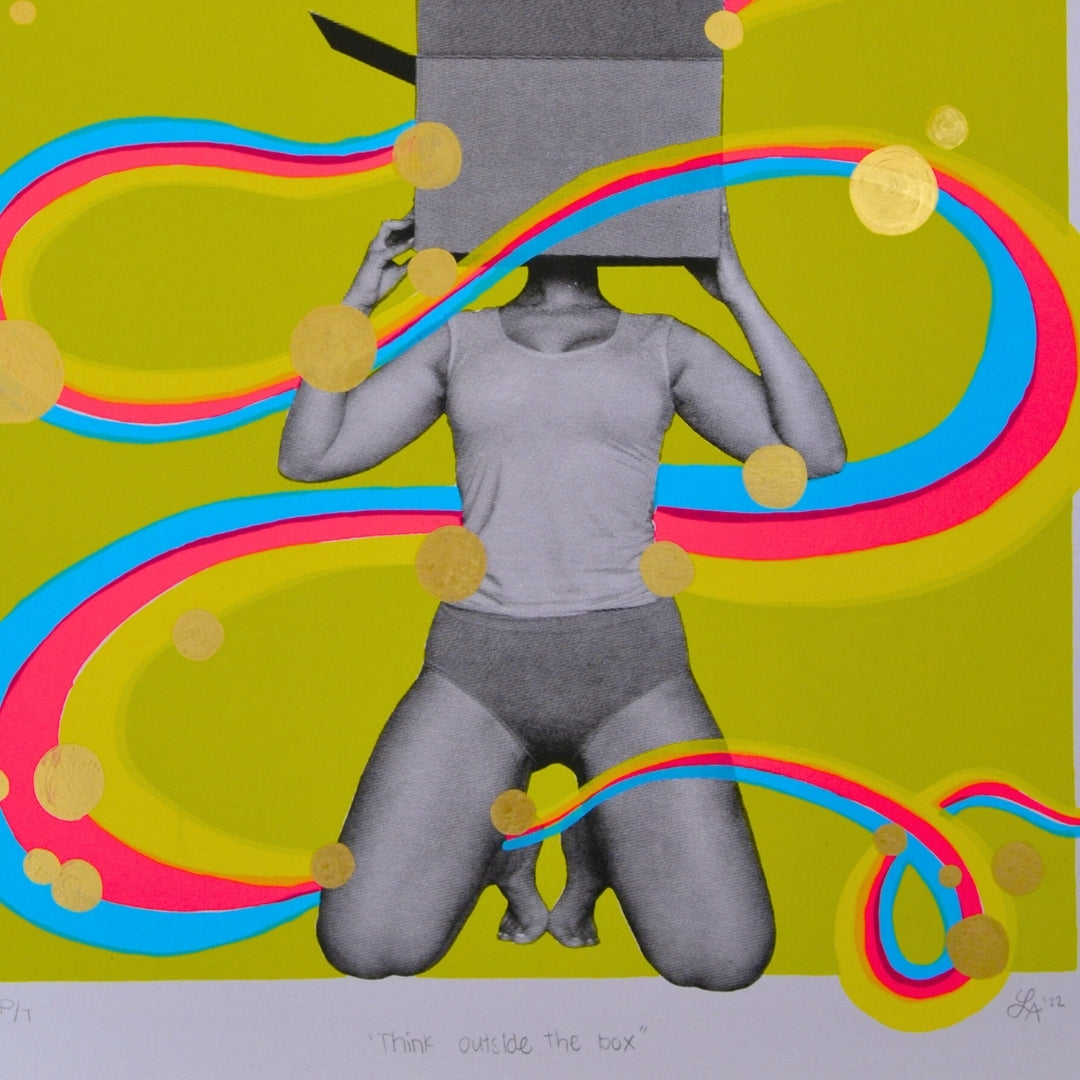 Ésta es una prueba de taller única de la serie de serigrafías "Think Outside The Box". Ésta obra me recuerda el infinito cambio de las perspectivas y aprendizajes que vamos teniendo en la vida y como es que debemos de seguir abiertos a reaprender sin casarnos con una sola filosofía de vida.