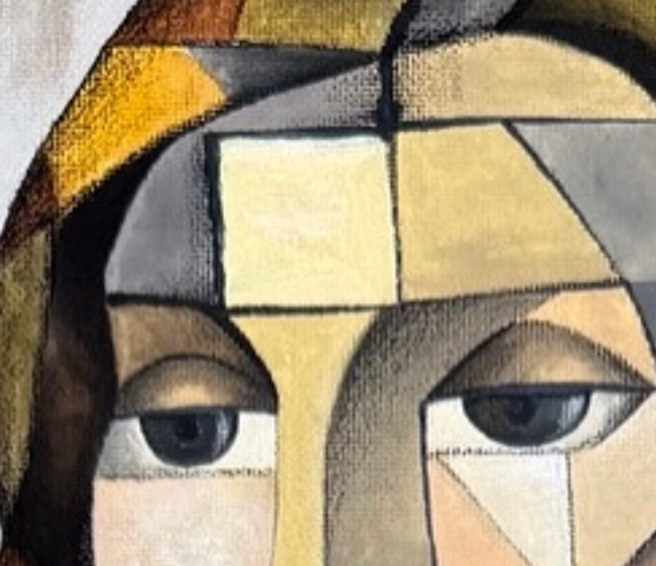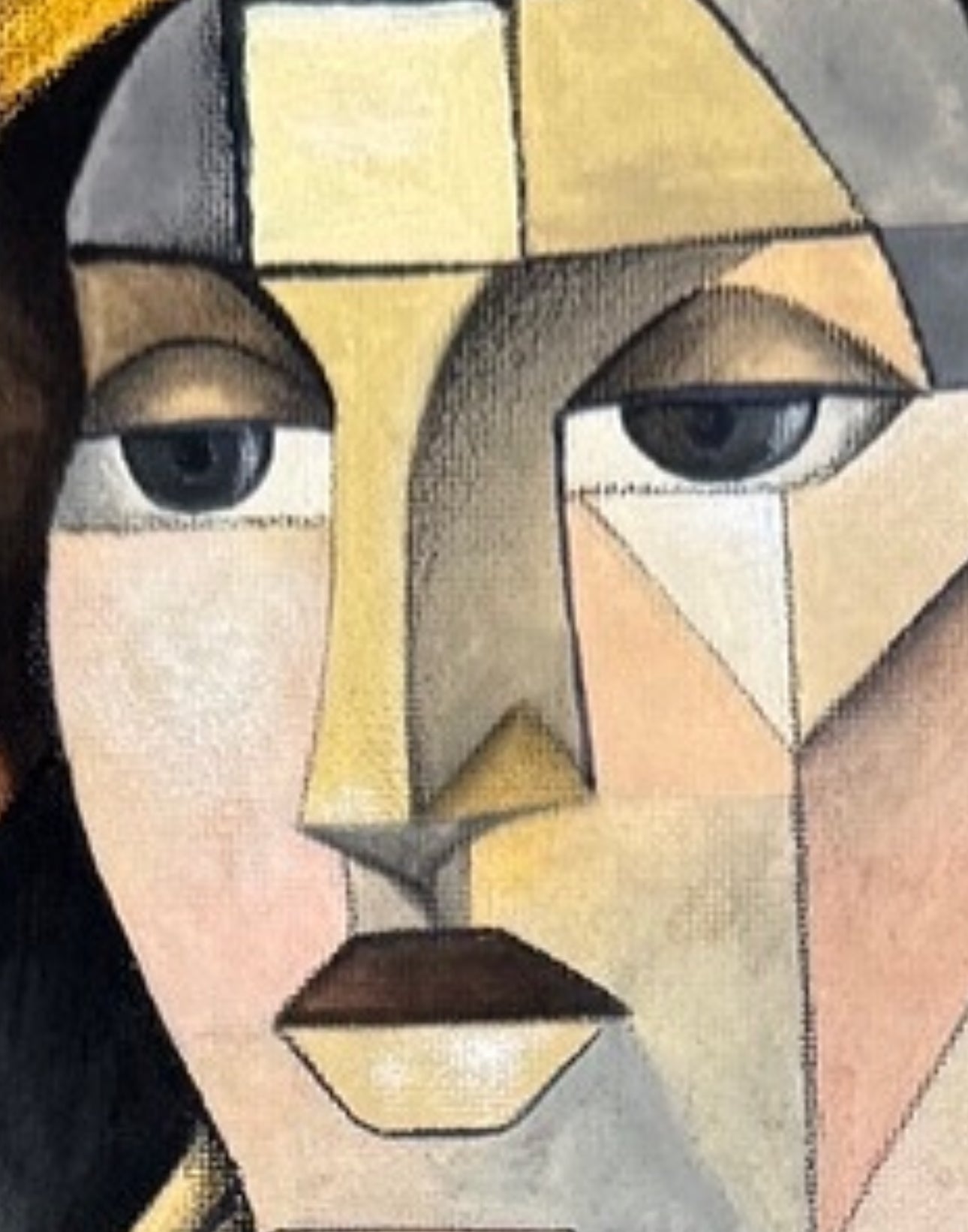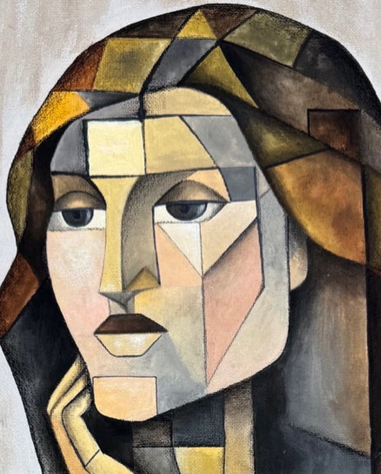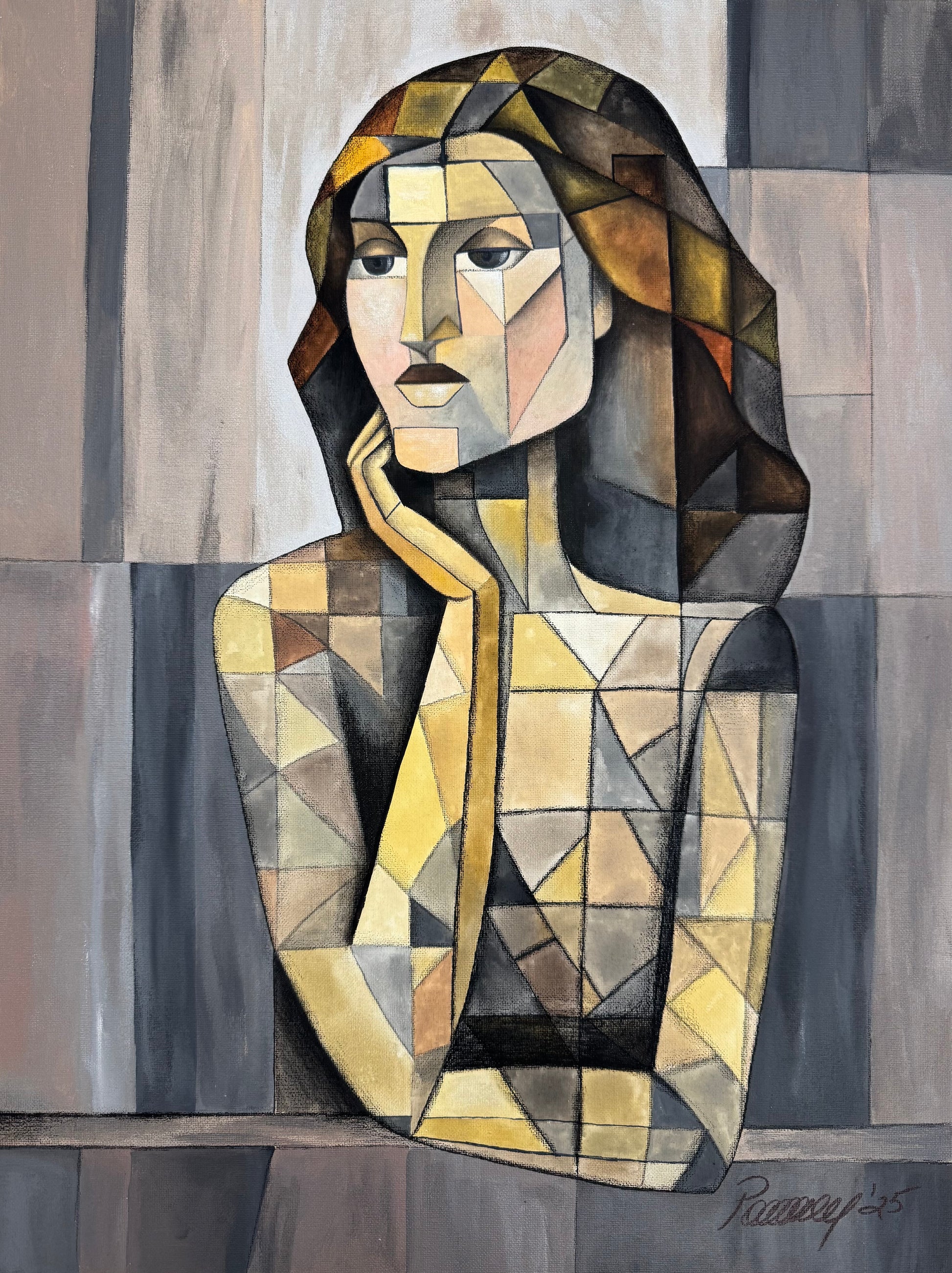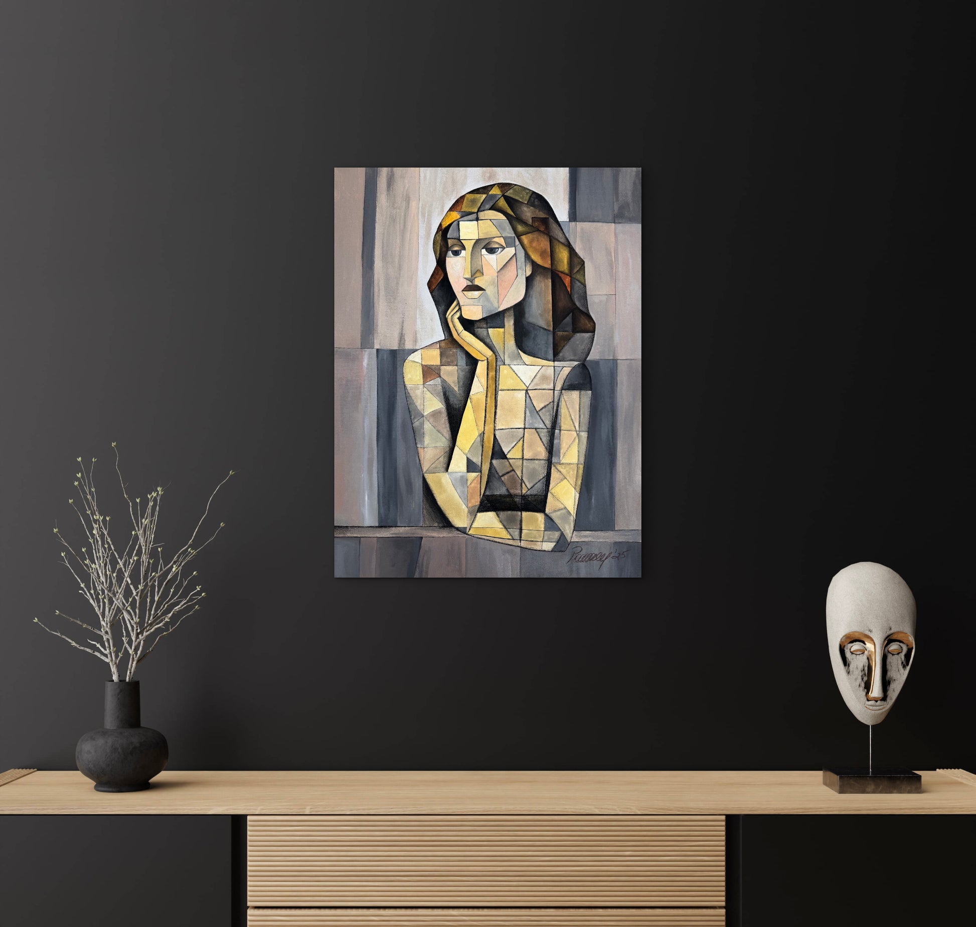 "Thoughts" Mujer estilizada en estilo cubista, construida con planos geométricos en tonos ocres, grises y dorados. Aparece pensativa, con la mano apoyada en el rostoro, mientras las formas fragmentadas crean un efecto de profundidad.
