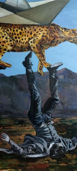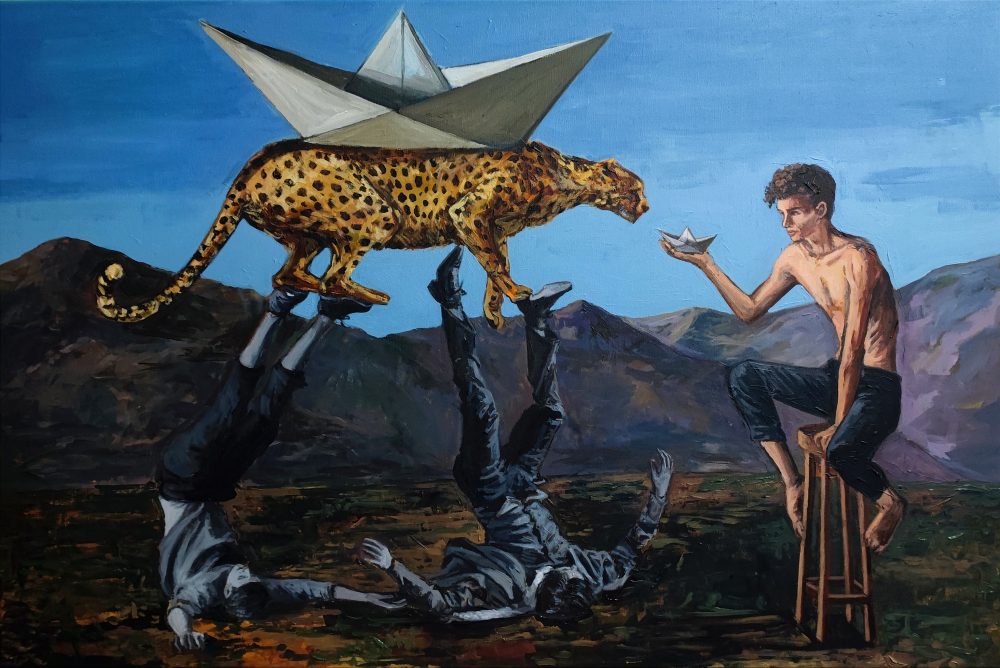 En el centro de la composición, dos figuras en blanco y negro yacen en el suelo, sosteniendo con los pies a un majestuoso leopardo. Este felino, que representa la realidad actual, carga en su lomo un barco de papel gigante. Este barco, aunque frágil en su construcción, parece llevar consigo la carga del pasado y sobretodo de la infancia, manifestándose como una amalgama de experiencias y recuerdos.