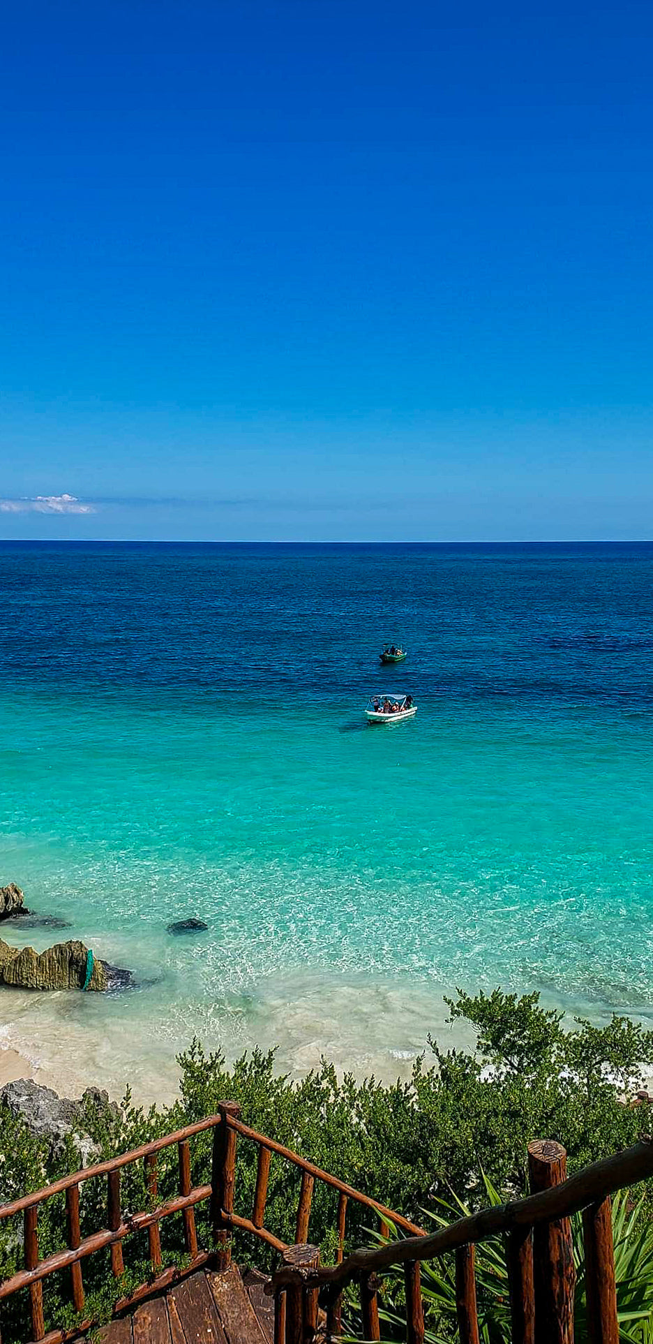En una paradisíaca playa de Cancún, México; se pueden observar los tonos azules del mar, que se combinan de una manera armoniosa con el azul del cielo.