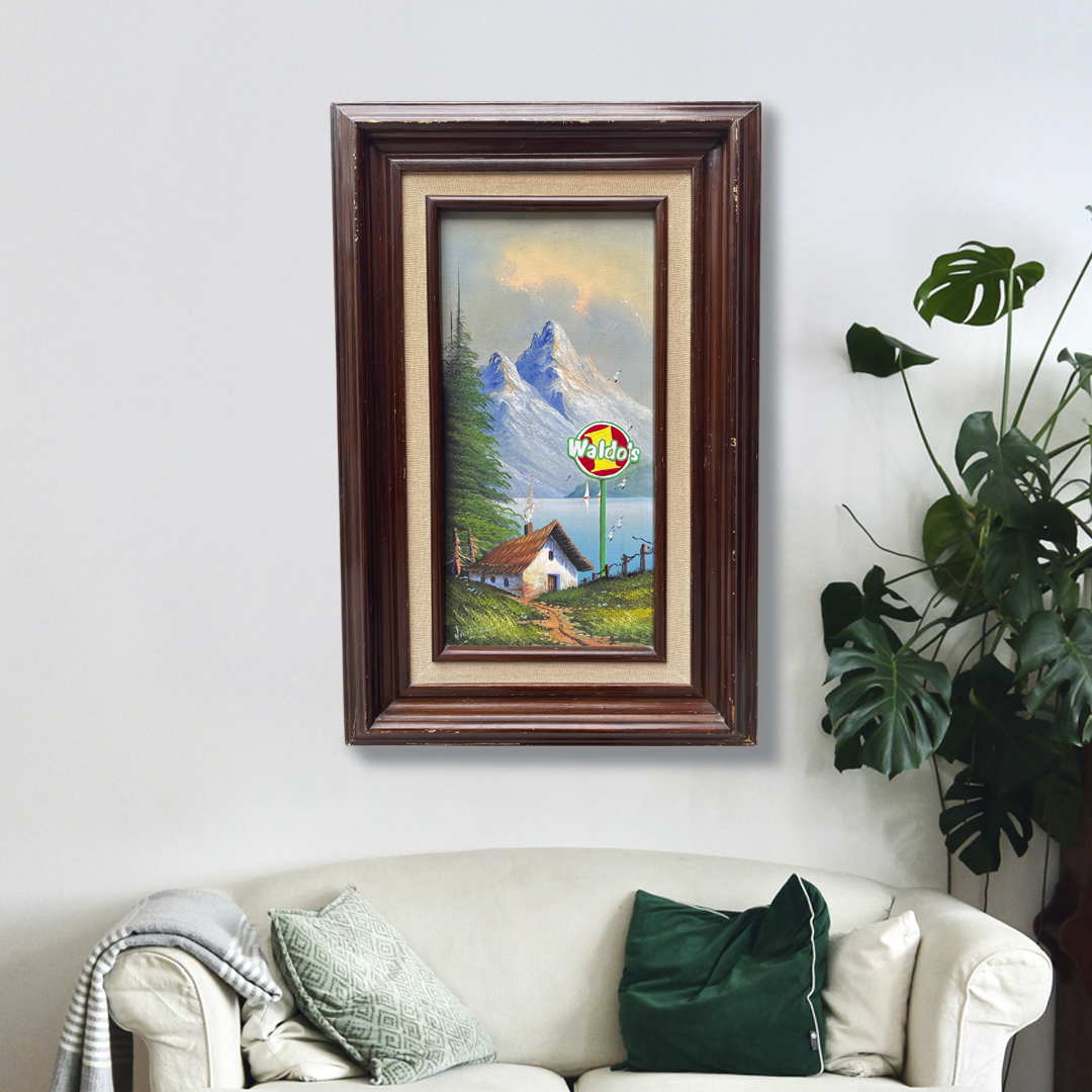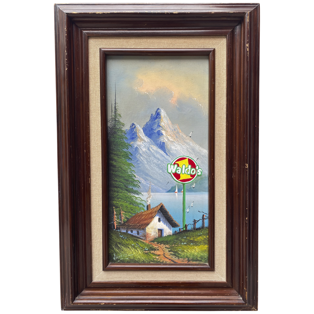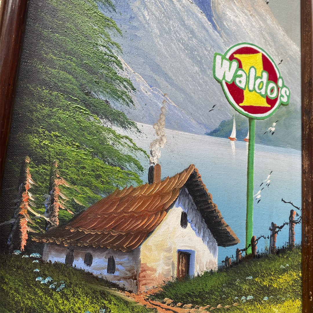 Esta obra es parte de una serie apropiacionista que interviene cuadros de tianguis de la CDMX. Muestra un letrero de Waldo's en un paisaje, cambiando su contexto. Combina elementos contemporáneos del imaginario mexicano con la pintura tradicional en una composición novedosa.