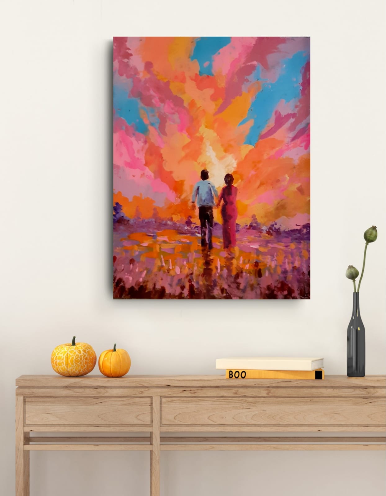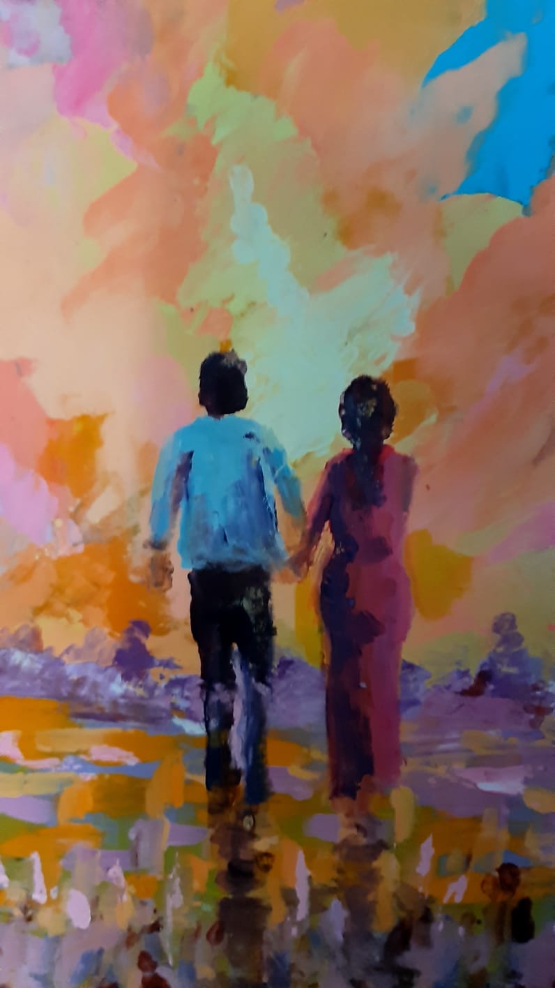 Es una obra de colores cálidos , que capta un momento de amor, el titulo "tomando tu mano" se debe a que cuando tenemos a alguien que amamos , el lugar donde estamos se convierte en un paisaje lleno de luz, un lugar lleno de la libertad de ser uno mismo. Si alguna vez has amado a alguien y has sentido que al tomar su mano lo tienes todo. Esta obra es para ti.