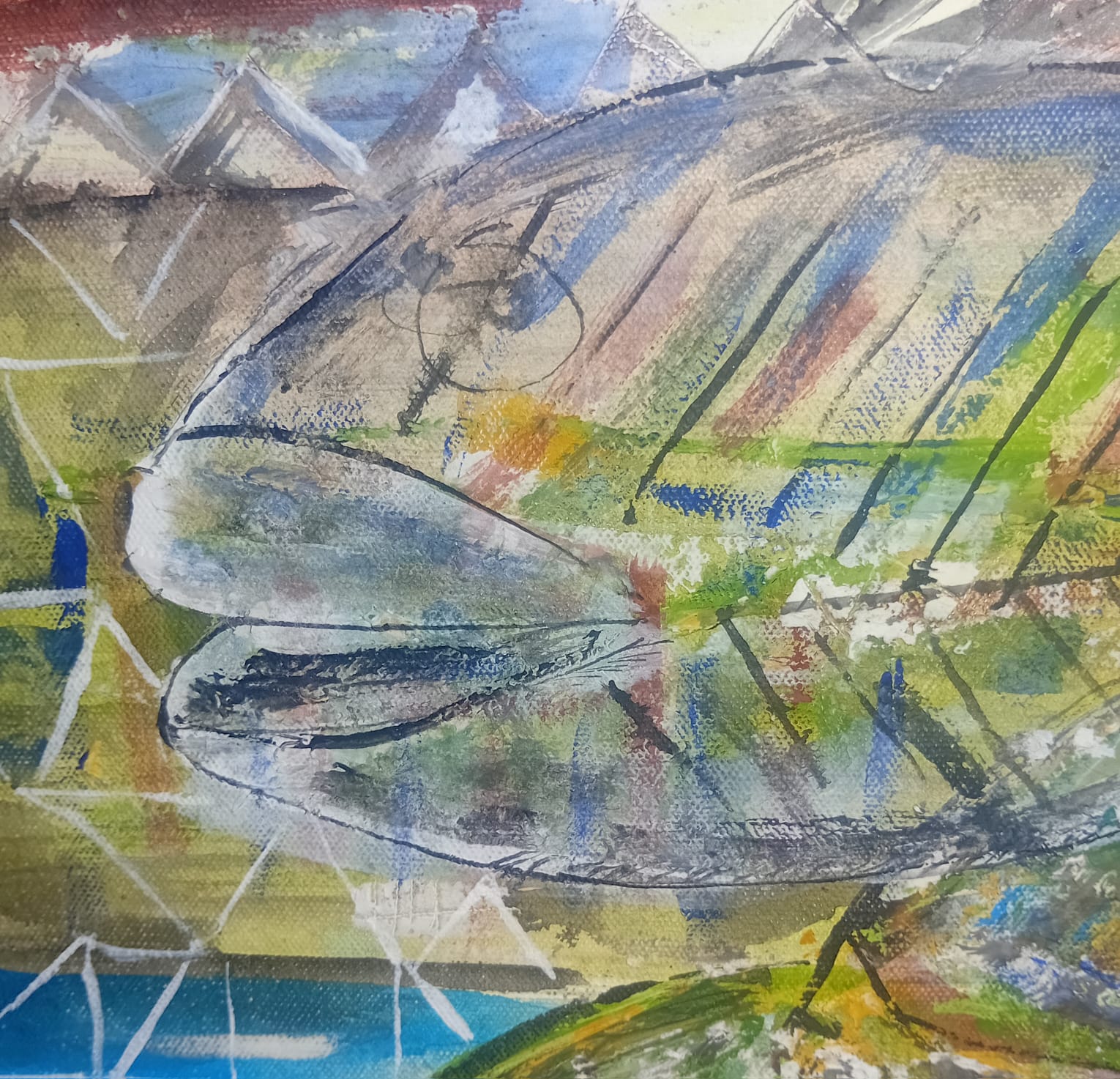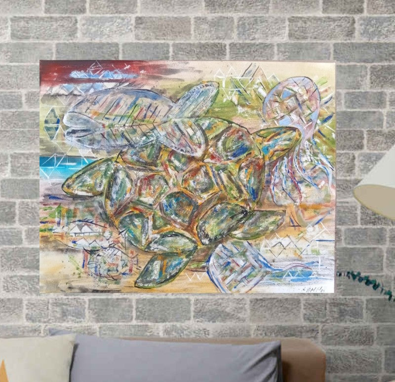 Esta obra pertenese a una serie de pinturas llamada "Mar abierto" tratando el tema ecologico y respeto a nuestros mares, trata sobre diferentes aspectos de la fauna marina, la tortuga, el pulpo y peces en el oceano y mar. Obra en acrilico sin enmarcar con tonos verdes, azules y morados.