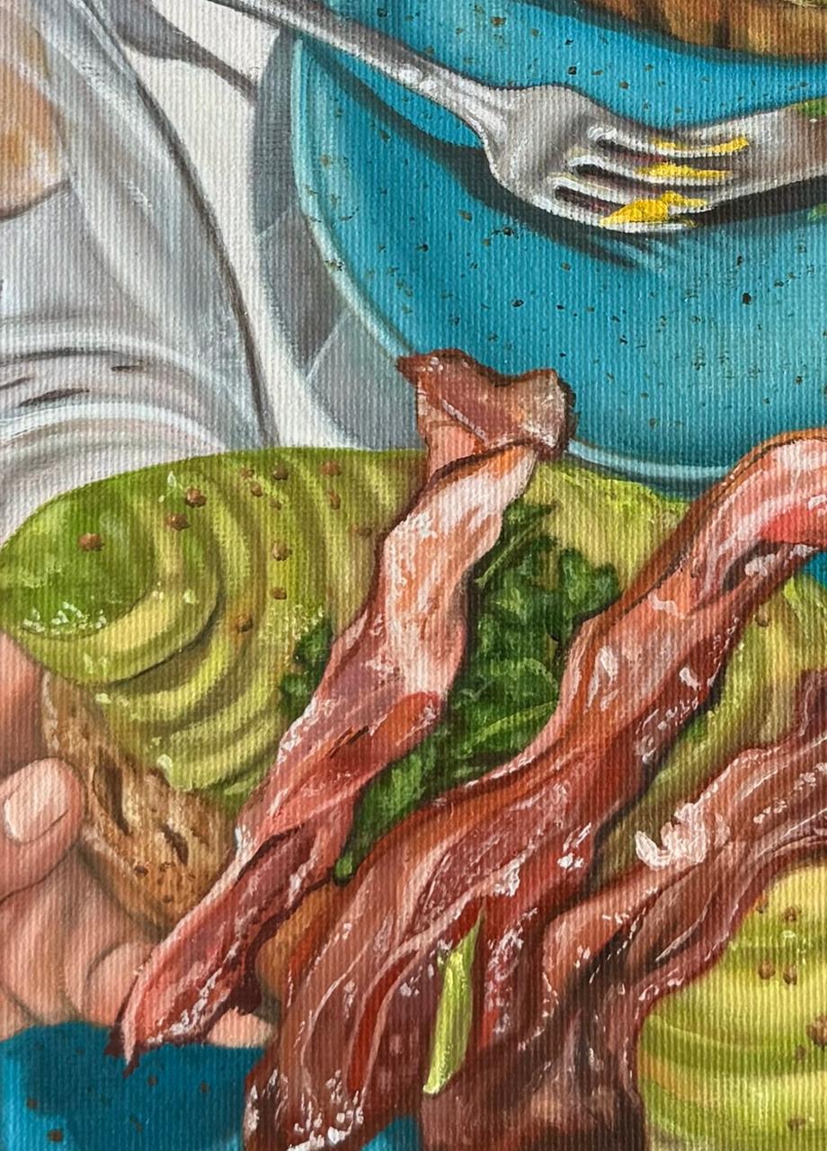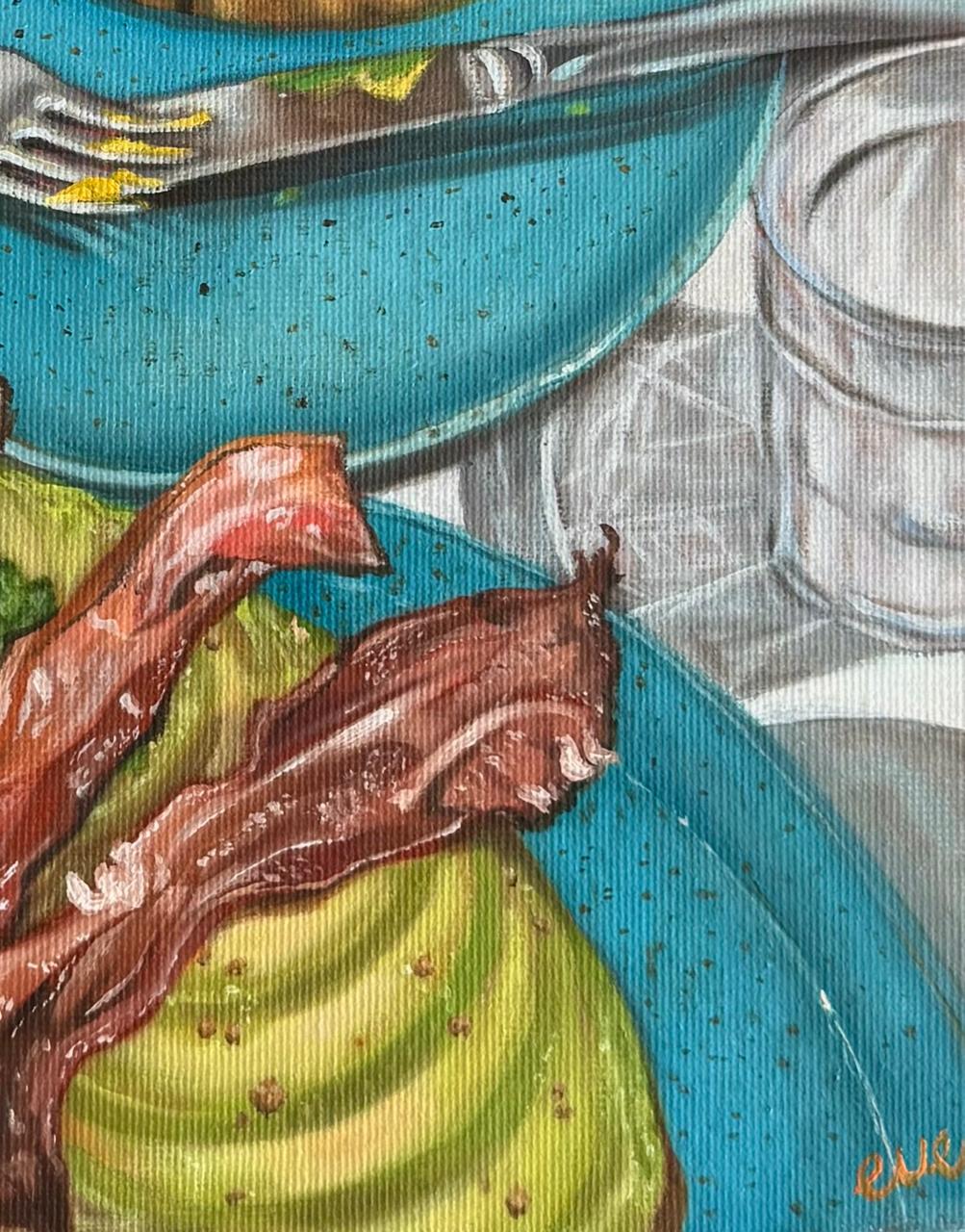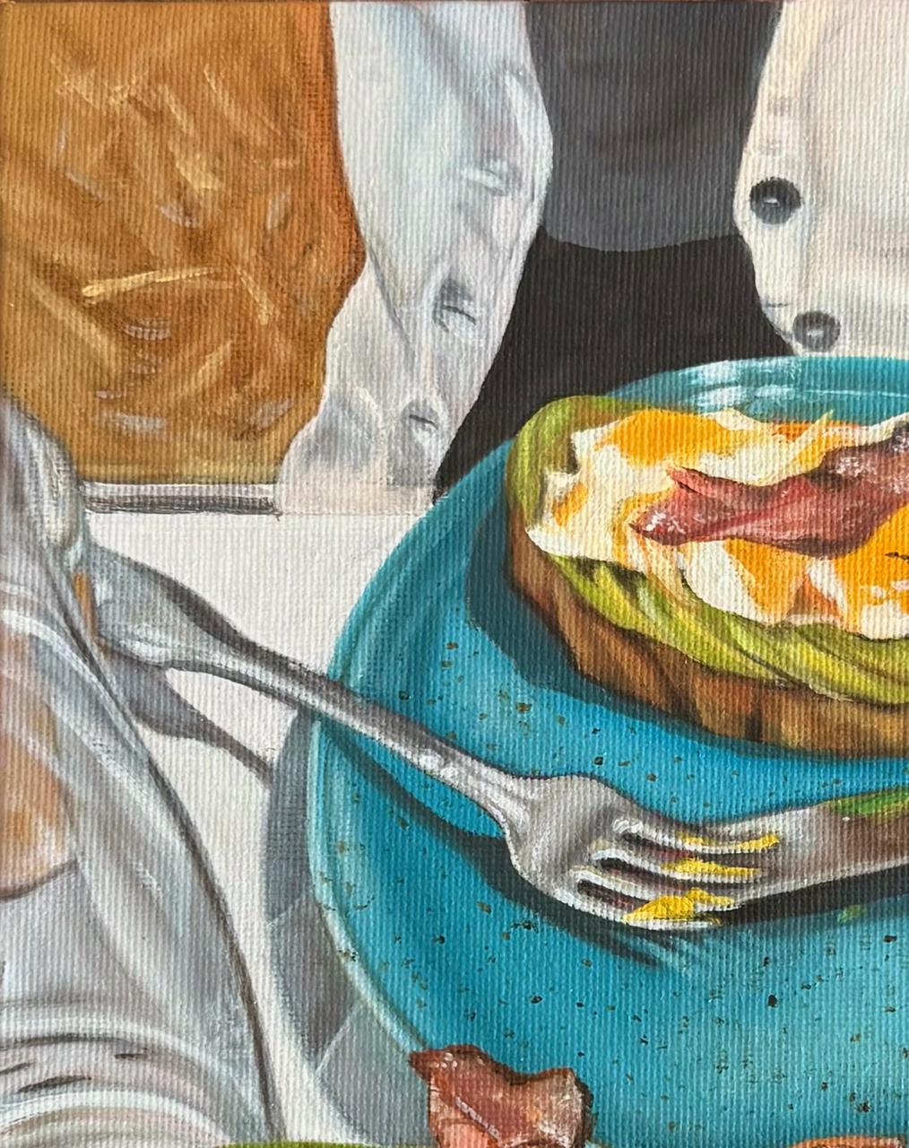 Esta pintura captura un momento muy de mi mejor amiga y mío: un desayuno que se volvió pausa y disfrute, y la sensación de estar compartiendo la mesa sin prisas.