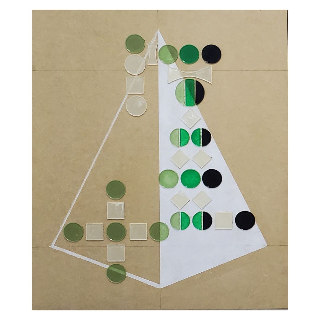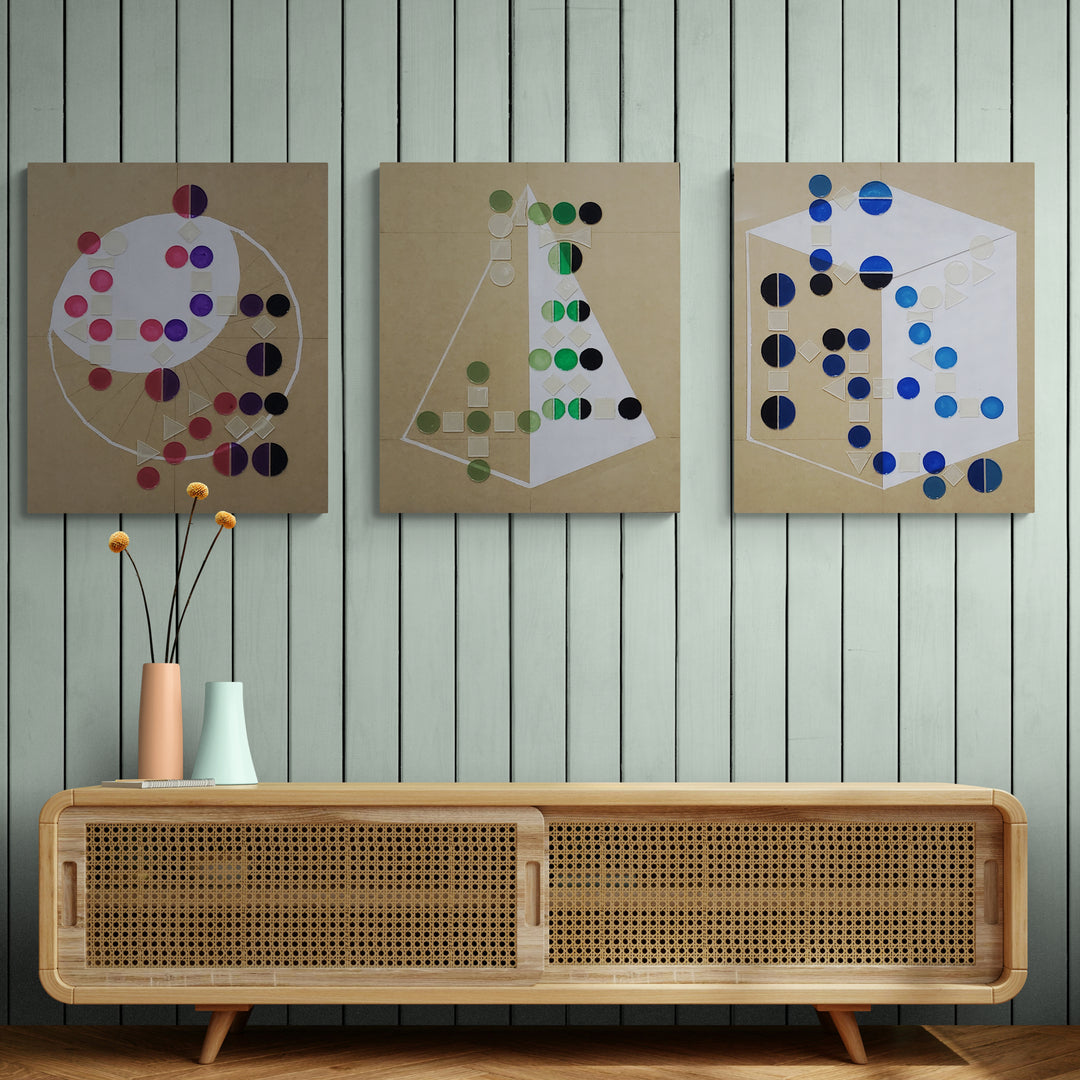 En esta obra se desarrollaron una serie de signos que representan el color y sus variaciones dentro de una imagen (luz, sombra, gradación, mezcla, dispersión, etc.) con el fin de crear un proceso visual donde el uso de estos generara una imagen autoexplicativa. El resultado fueron una serie de piezas donde se traduce el color, luz y sombra de tres figuras básicas, cubo, esfera y pirámide, a través de esta notación visual para generar un nuevo tipo de estética.