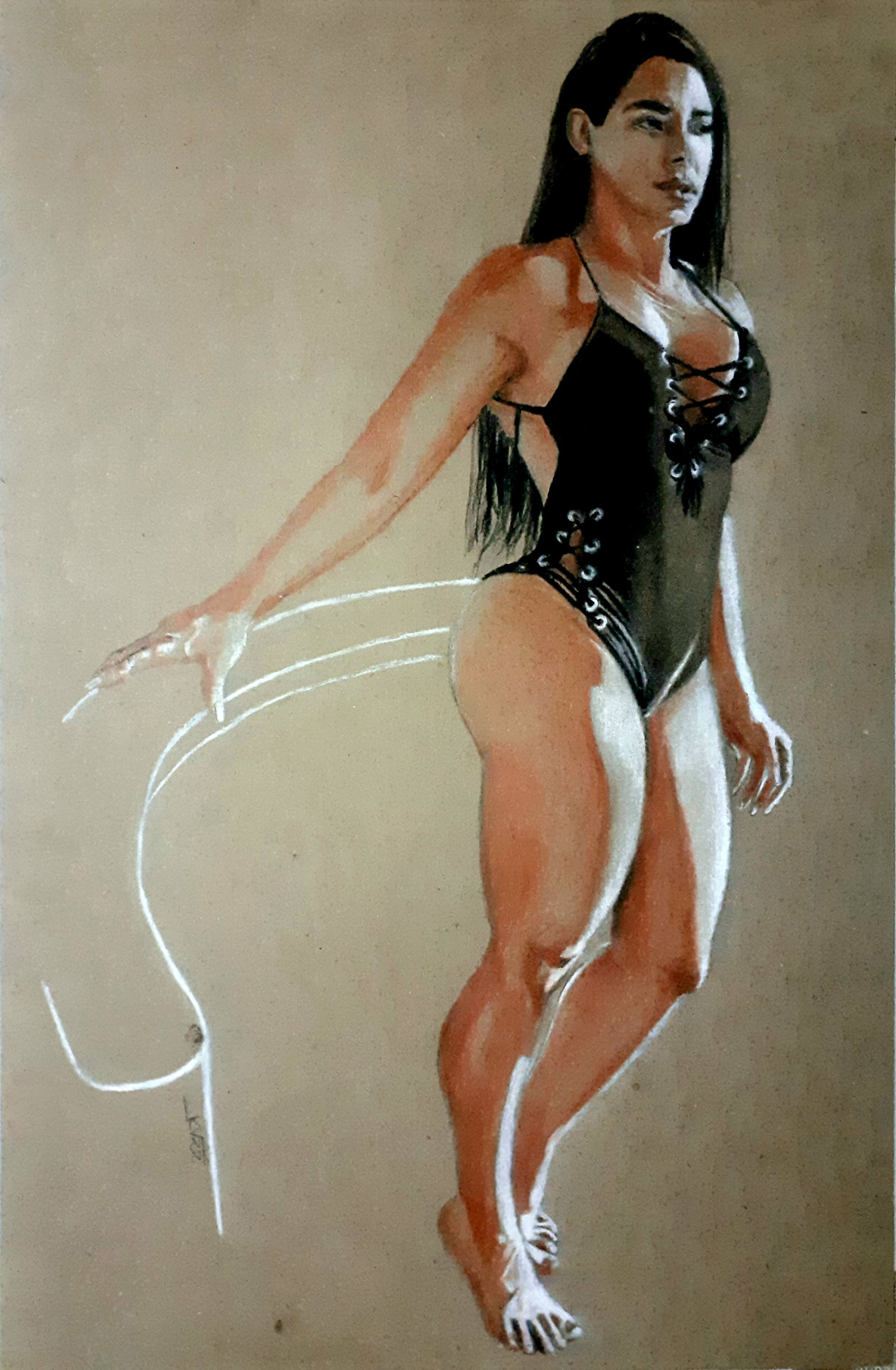 Dibujo de mujer hecho en sanguina y carboncillo sobre papel craft.