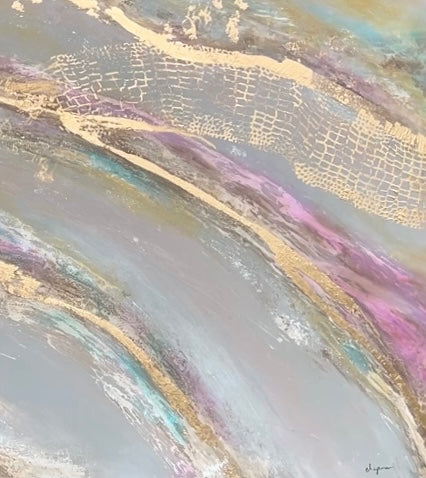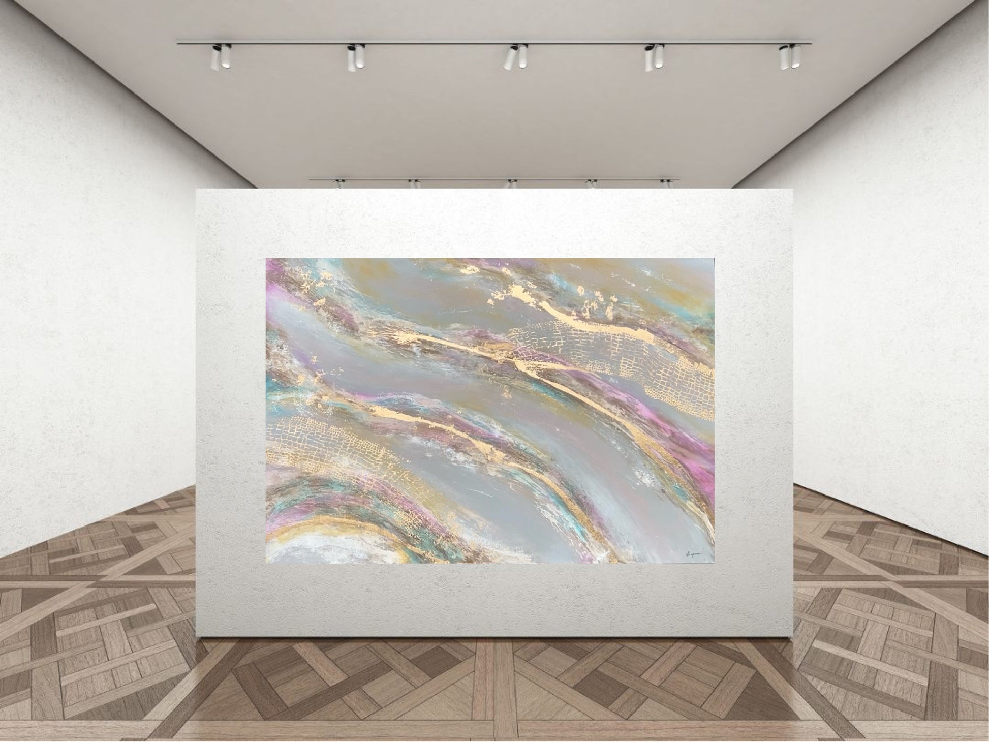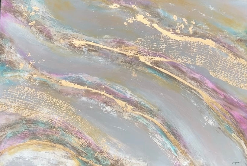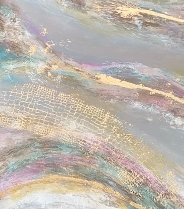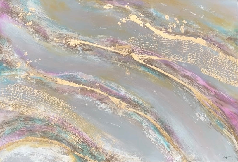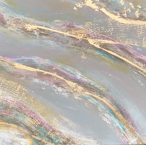 “Tranquilidad” es una obra fascinante. La combinación de colores como el blanco, los grises, los rosas, el esmeralda y el ocre, junto con la textura de la hoja de oro, crea una sensación de serenidad y elegancia.