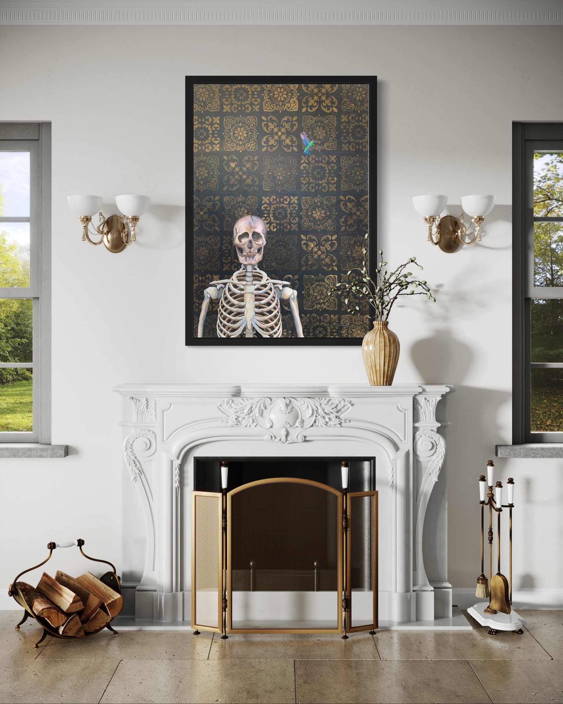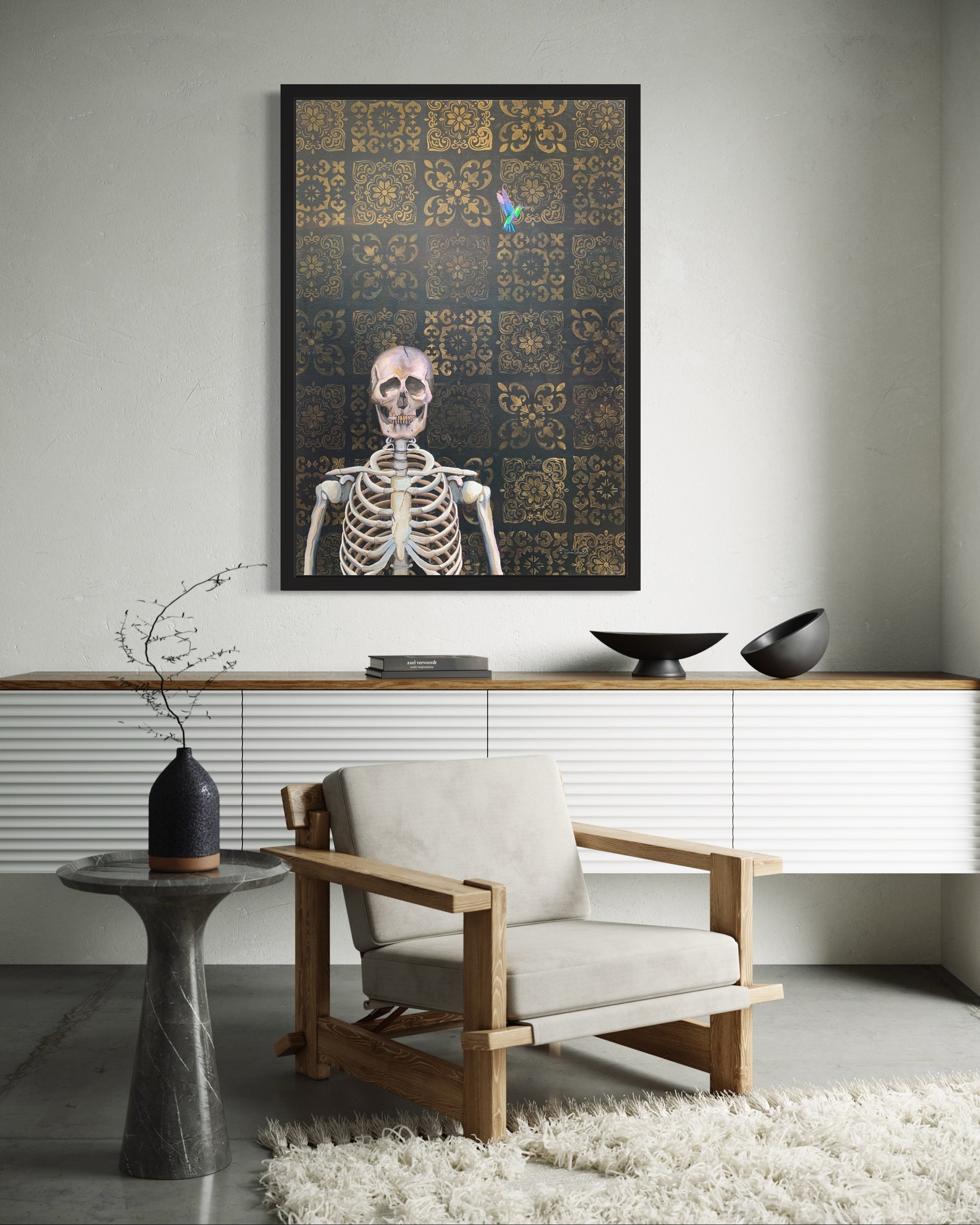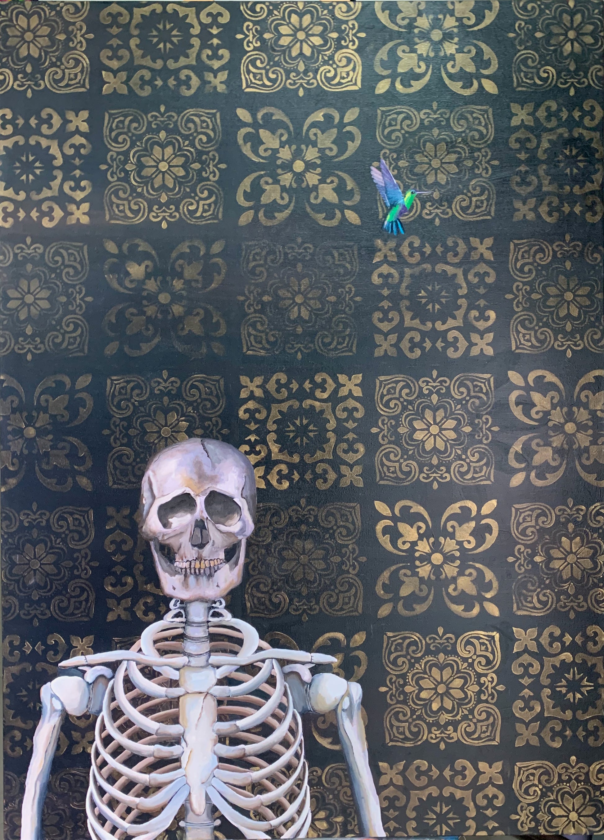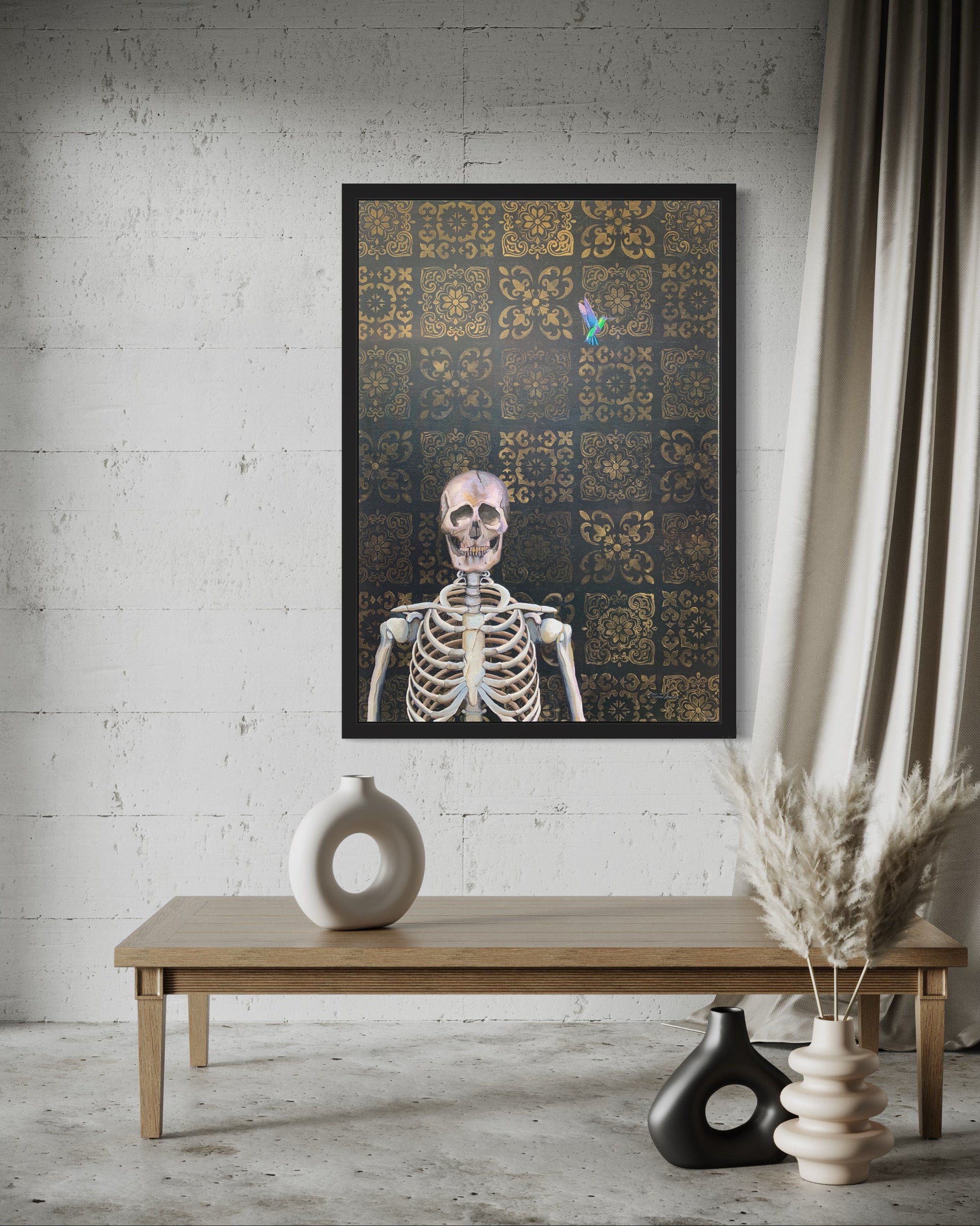 En el costado izquierdo de la composición, aparece una figura esquelética con un aire solemne pero no aterrador, un esqueleto inmóvil, simbolizando el fin del movimiento, del tiempo, como el fin de una parte natural de la vida; en la parte superior derecha, volando, aparece un colibrí conocido por su velocidad, fragilidad, vitalidad y su conexión con el simbolismo de la resurrección, en algunas culturas.