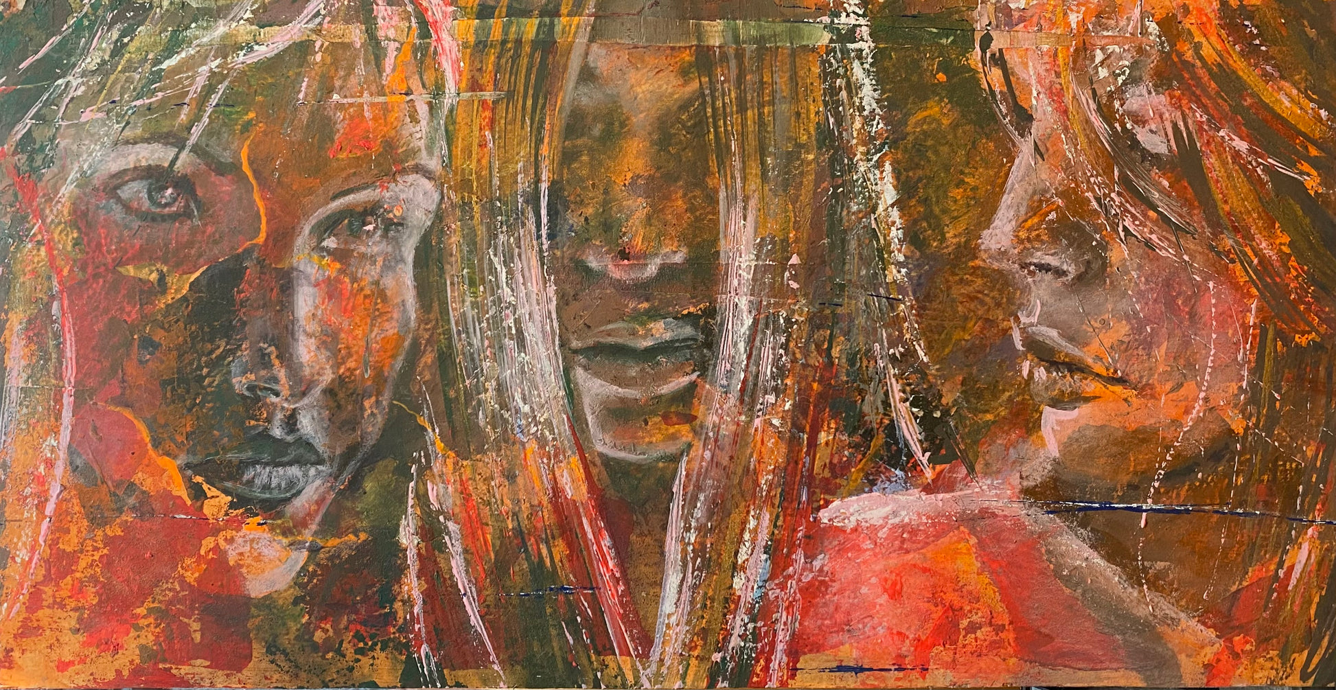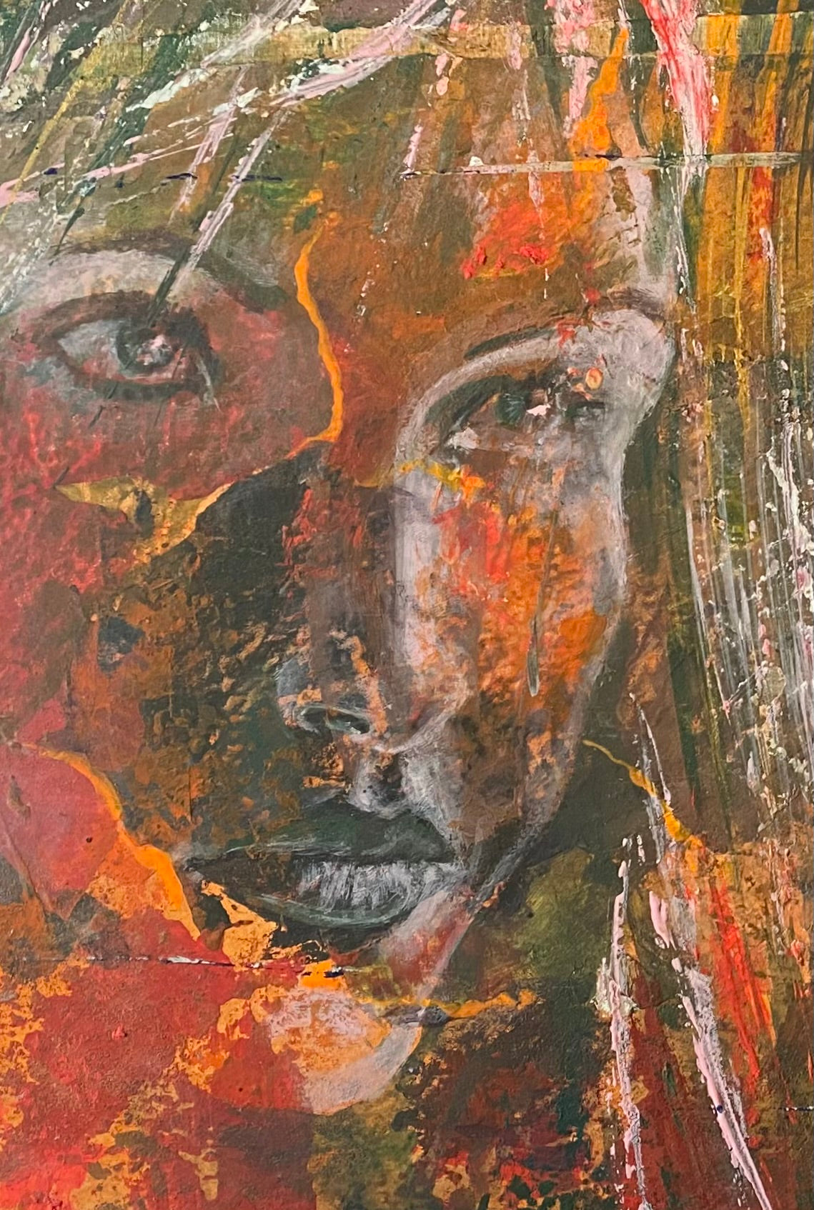 Aquí continúo buscando hacer una narración de emociones para tocar un periodo de la vida. En particular en este cuadro me imagino dos momentos de introspección que se adhieren con una extroversión que está rota, y un ojo como fragmento que puede ser que tiene una visión sea correcta o no pero diferente de el resto de la cara que comparte la misma suerte sin certeza pero ya en otro plano.