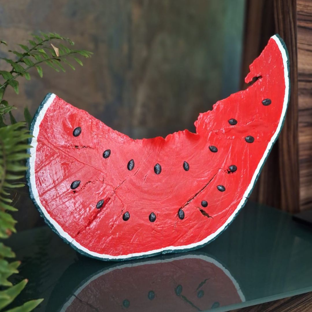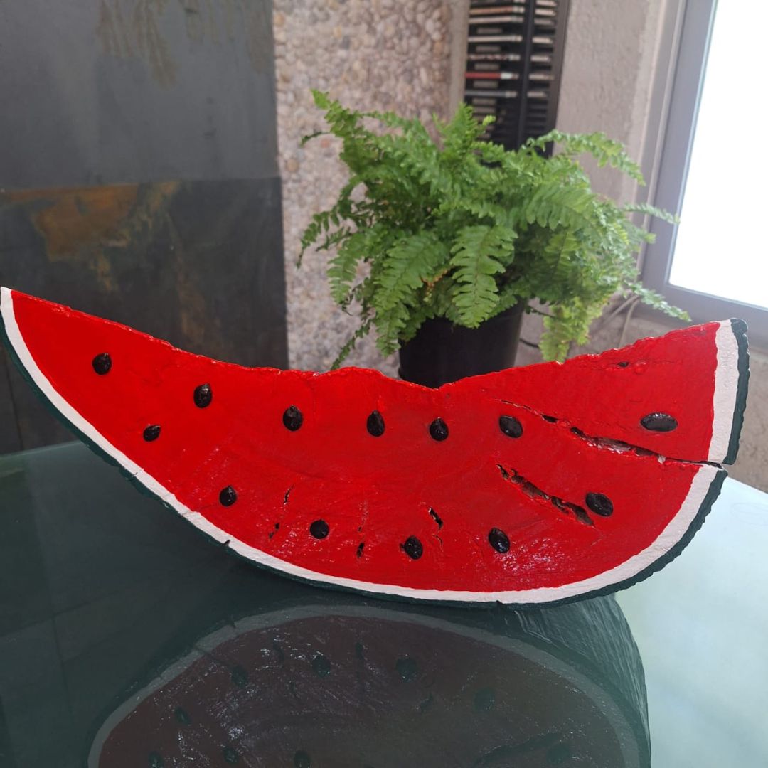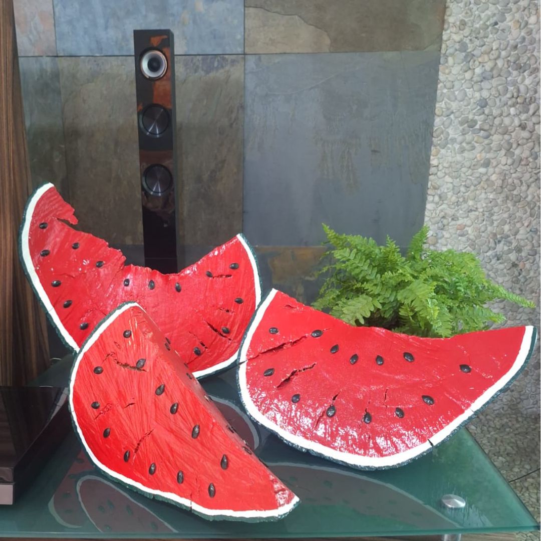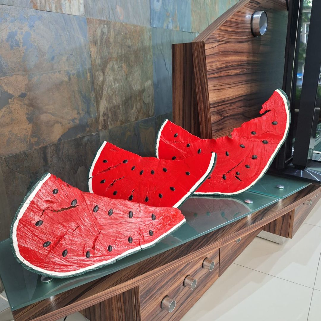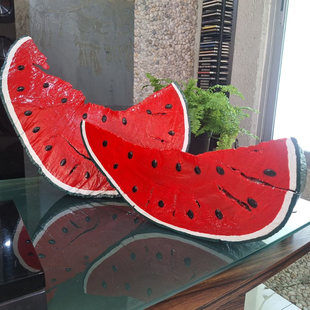 Tres ricas y frescas rebanadas de sandía, fabricadas en madera sólida de eucalipto