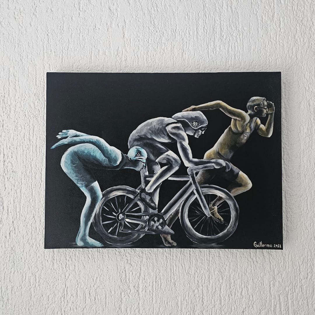 La escena transmite energía y determinación: el primer atleta refleja la intensidad del segmento de natación; el segundo, en una bicicleta aerodinámica, simboliza la velocidad y la resistencia del ciclismo; y el tercero, calzado y preparado para correr, encarna la perseverancia del último tramo de la carrera.