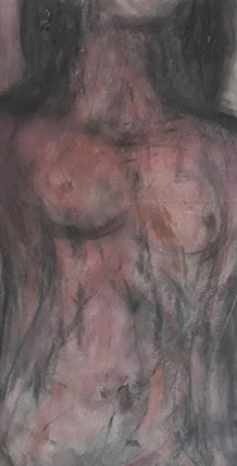 De la serie “LIBERA-2”, esta obra alude, de manera cruda y osada, a la interpretación del mundo, tras lo oculto. Colores fríos, trazos y marcas grabadas en la piel. Obra que se enmarca, una vez que “el secreto es develado”, en la silueta, en las huellas tras el sufrimiento y en la repercusión permanente de la condición física, pero también, dentro del cuerpo sutil, propio del alma recrudecida tras la redención del mártir anónimo, vuelto a ser liberado. Obra sin enmarcar.