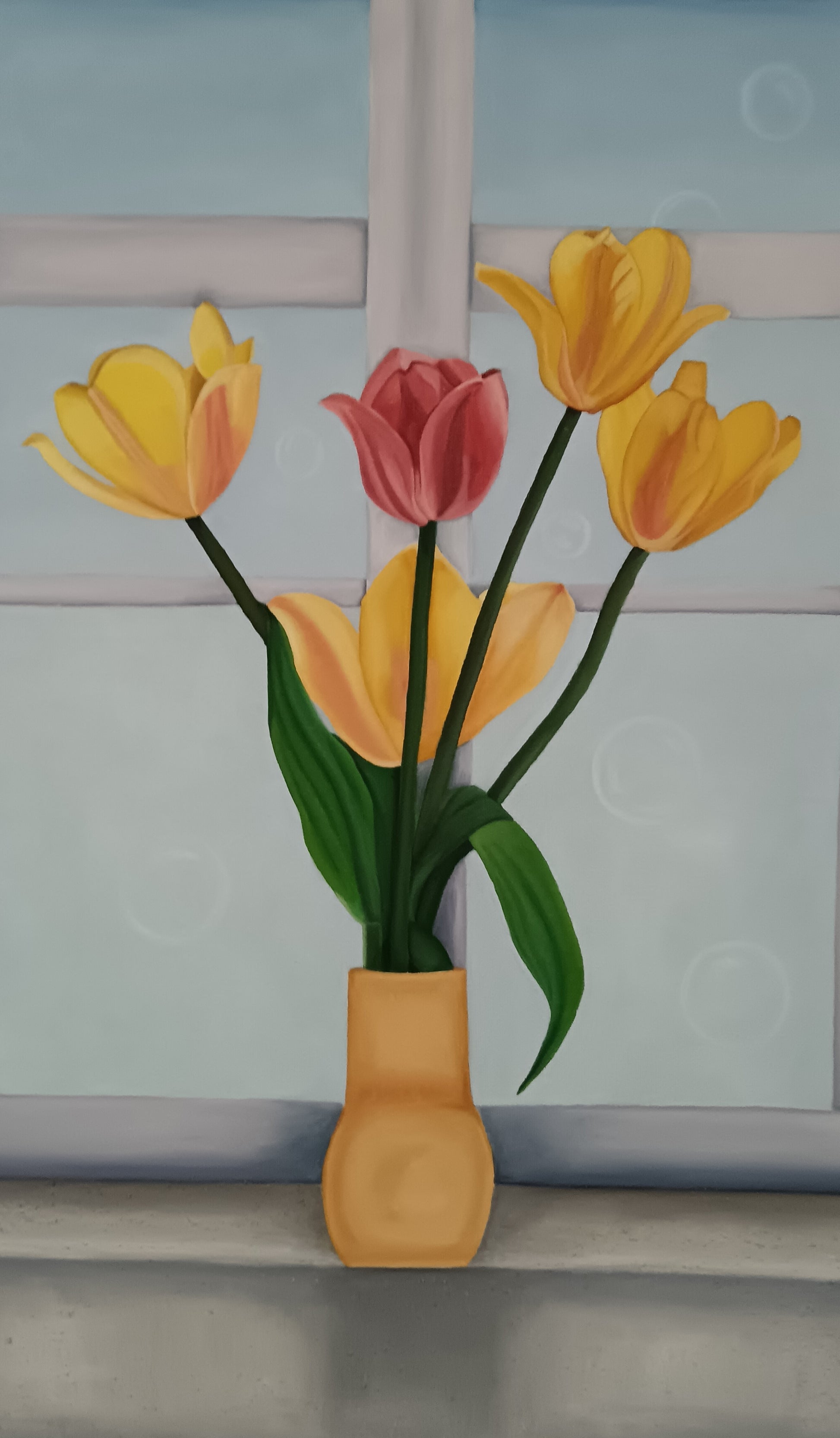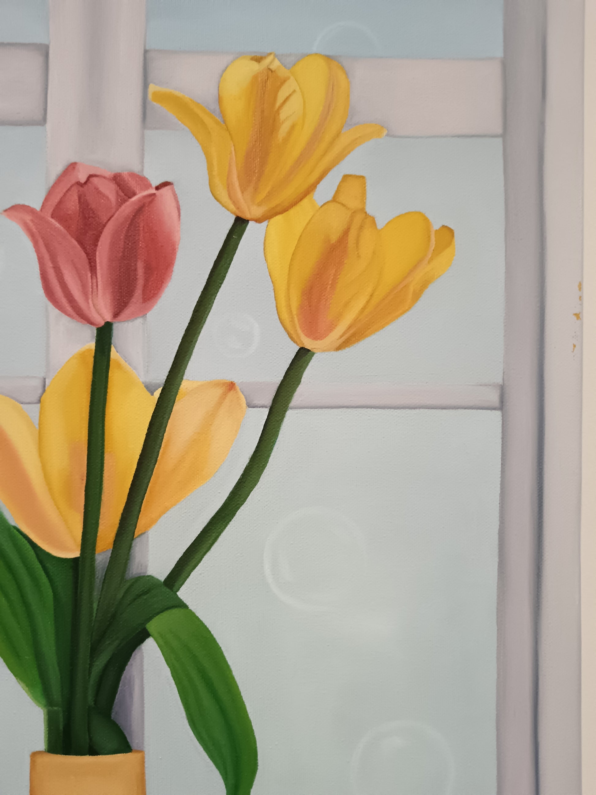 Naturaleza muerta, pintura por capas con un poco de textura en la parte de abajo. Sin Marco. Estos tulipanes en la ventana están inspirados en el deseo de tener el clásico florero en la ventana lleno de hermosas flores. Lo más lindo es que este cuadro representa esa belleza que es tan efímera.