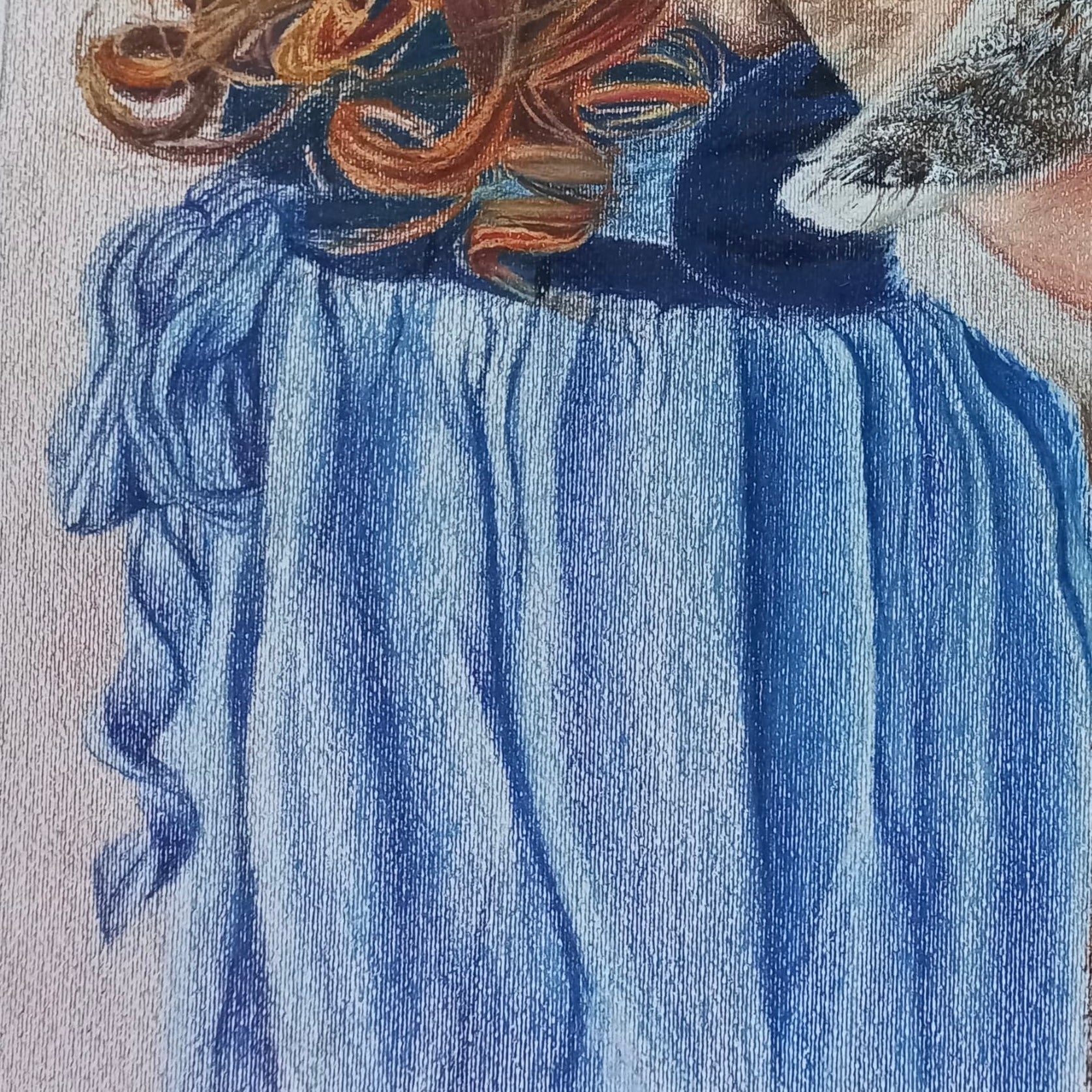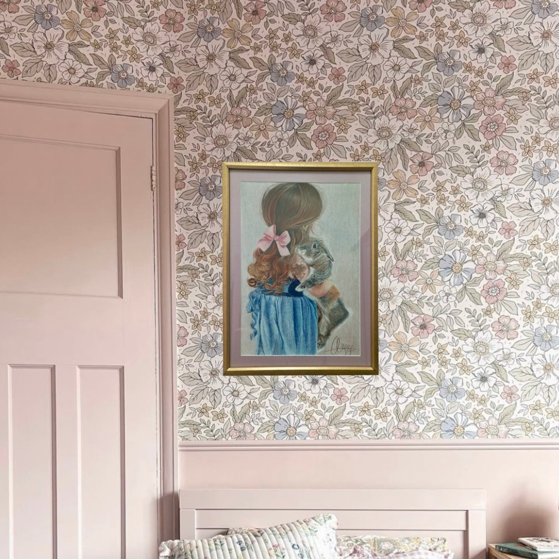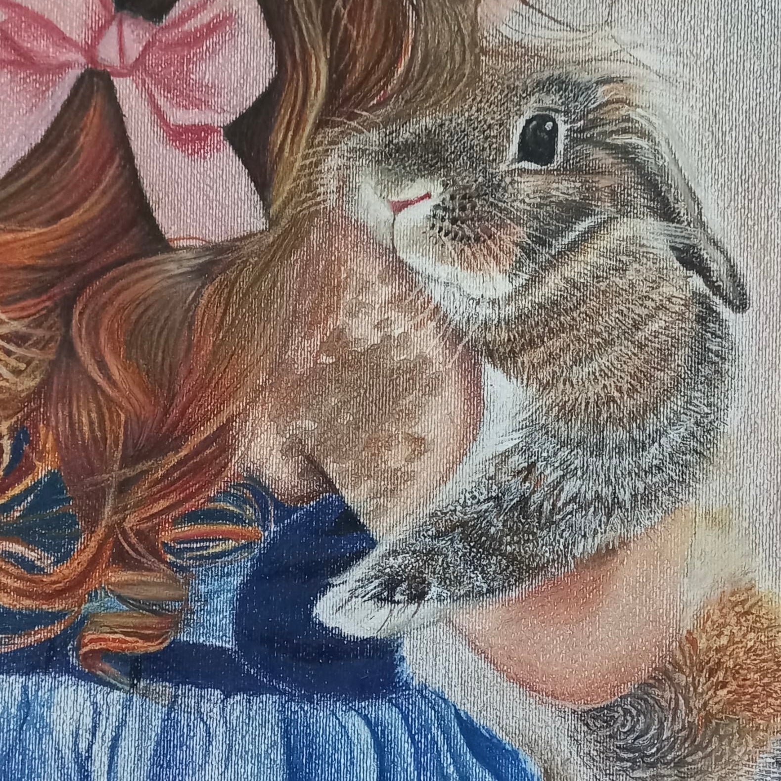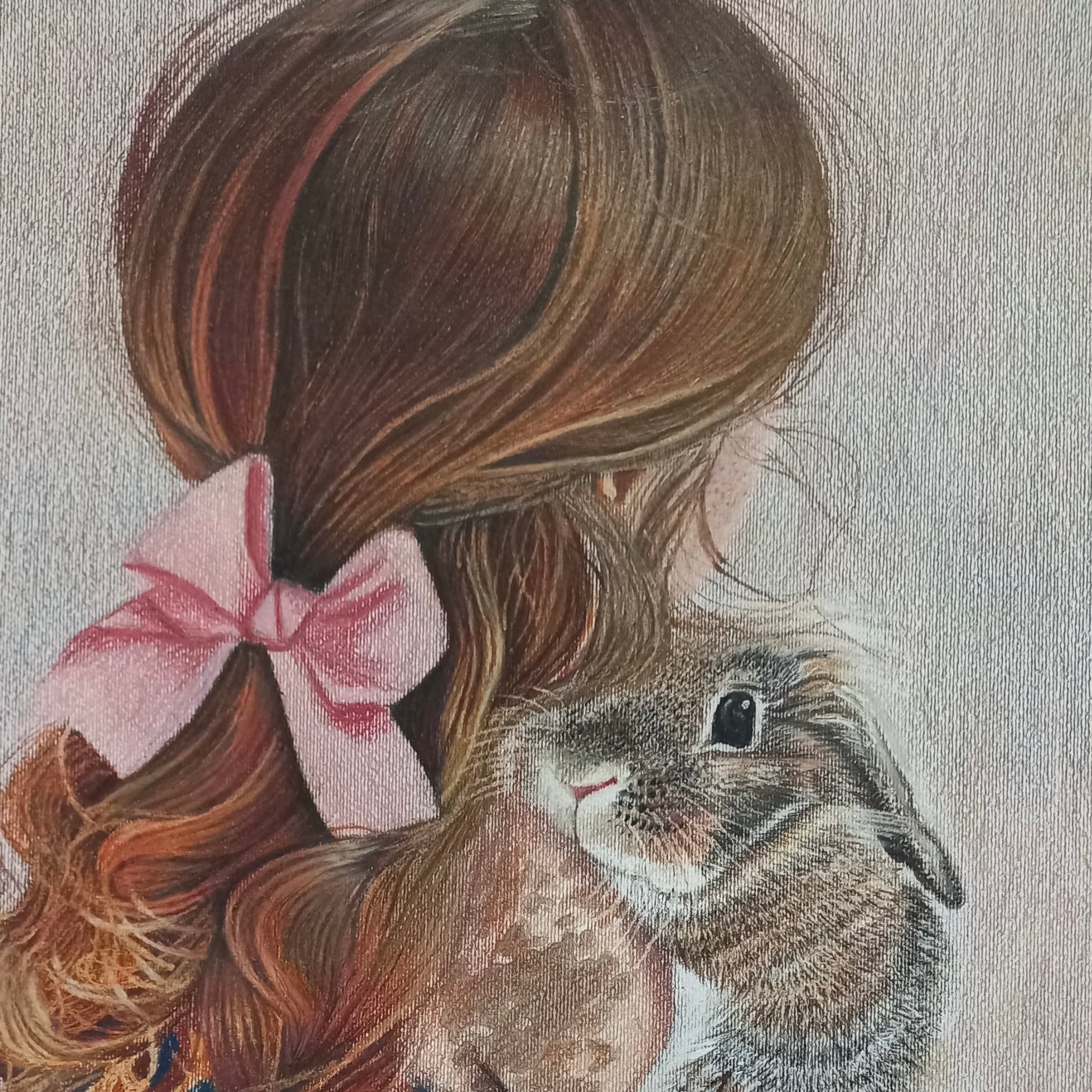 Esta obra captura la esencia de la infancia y la seguridad que nos brindan los objetos queridos. Inspirada en el recuerdo de un conejo de peluche que acompañó a la artista en su infancia. La obra tiene Marialuisa color lavanda rosa, cristal y marco dorado.