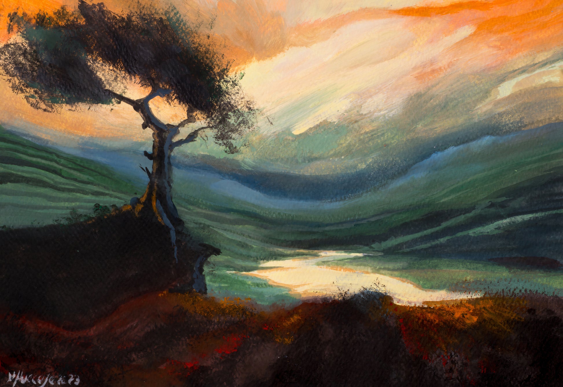 Esta pintura muestra un paisaje que pinté para el ARTE Y MINDFULNESS PARA EMPRESAS. PROGRAMA VIRTUAL DE CREATIVIDAD Y BIENESTAR, que he diseñado e implanto en grupos empresariales.