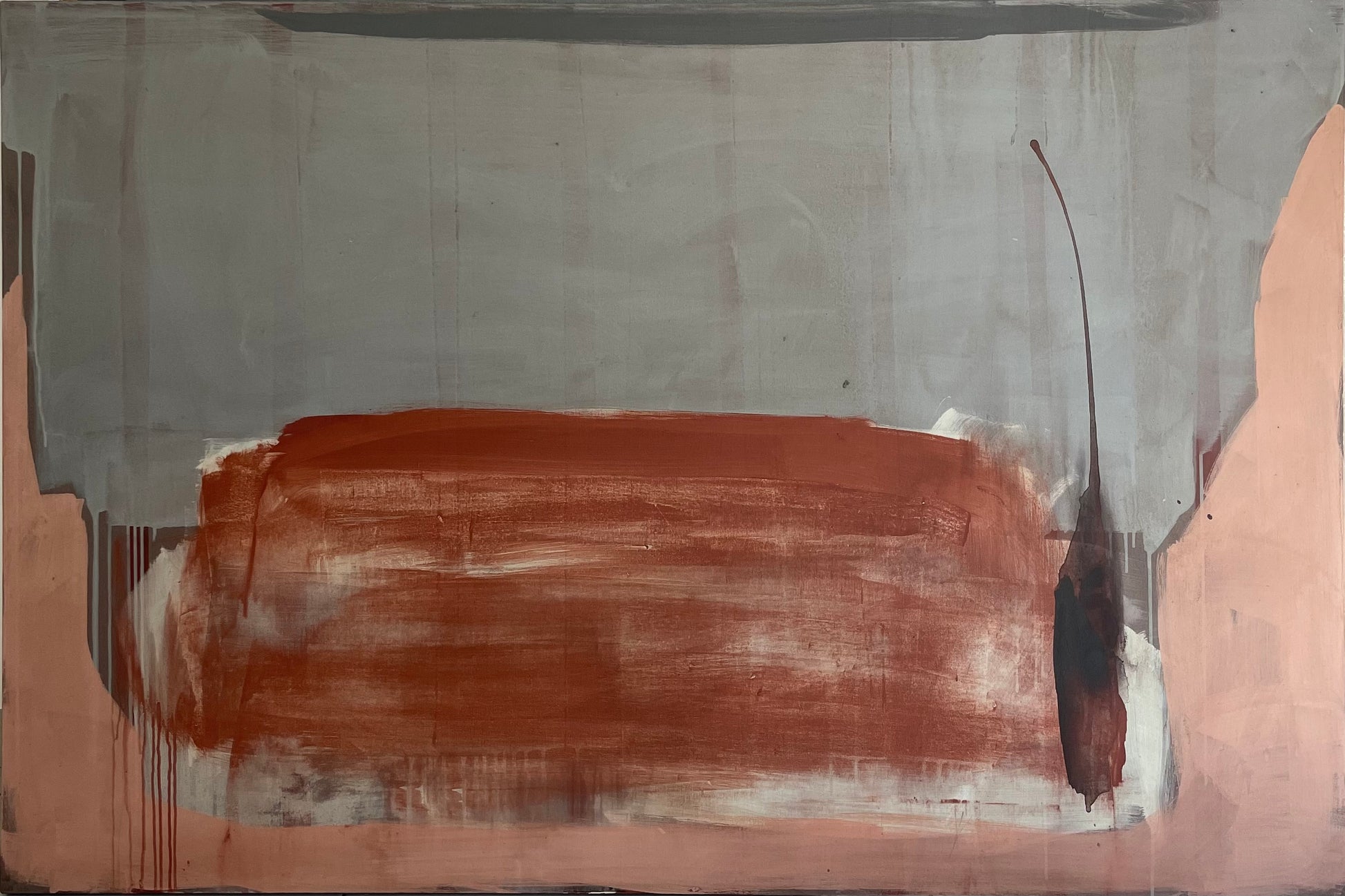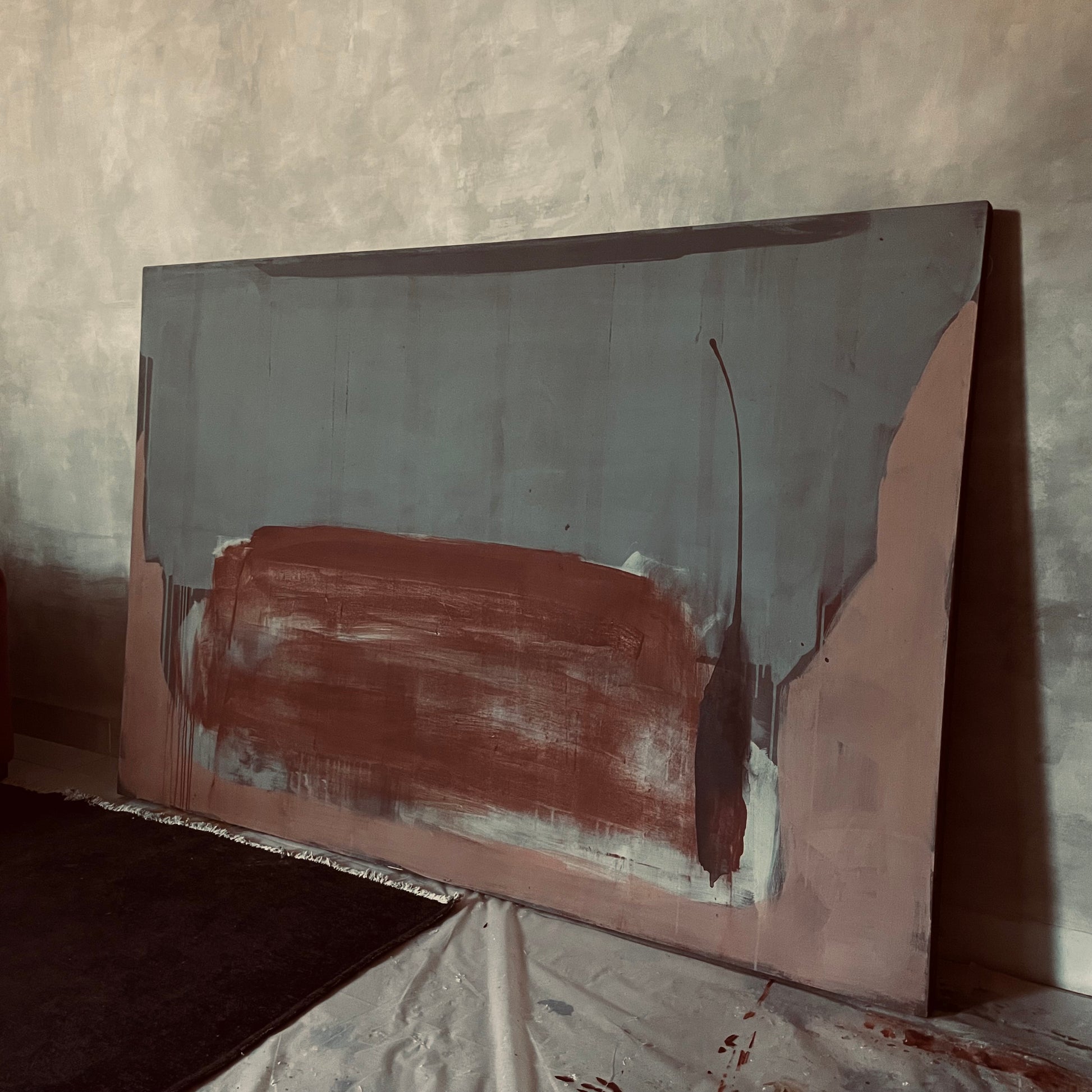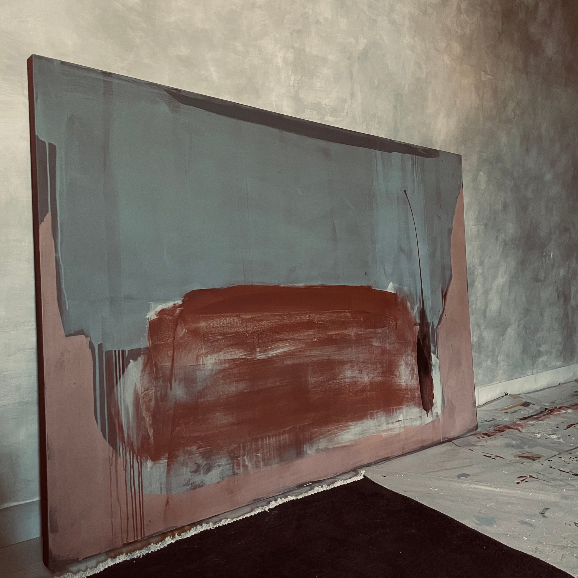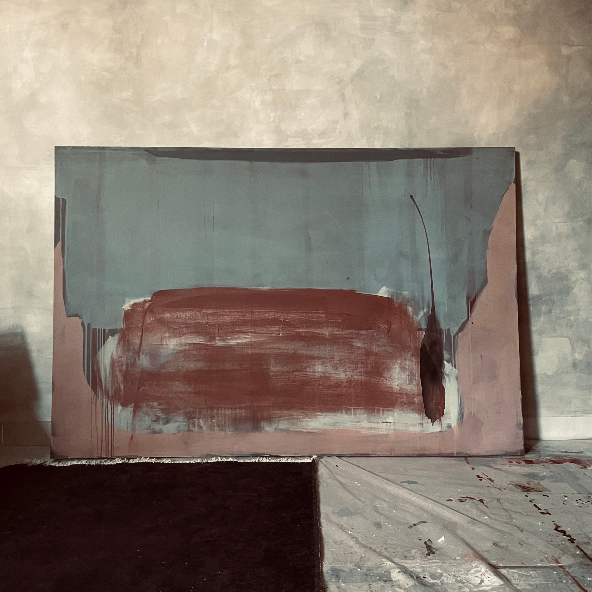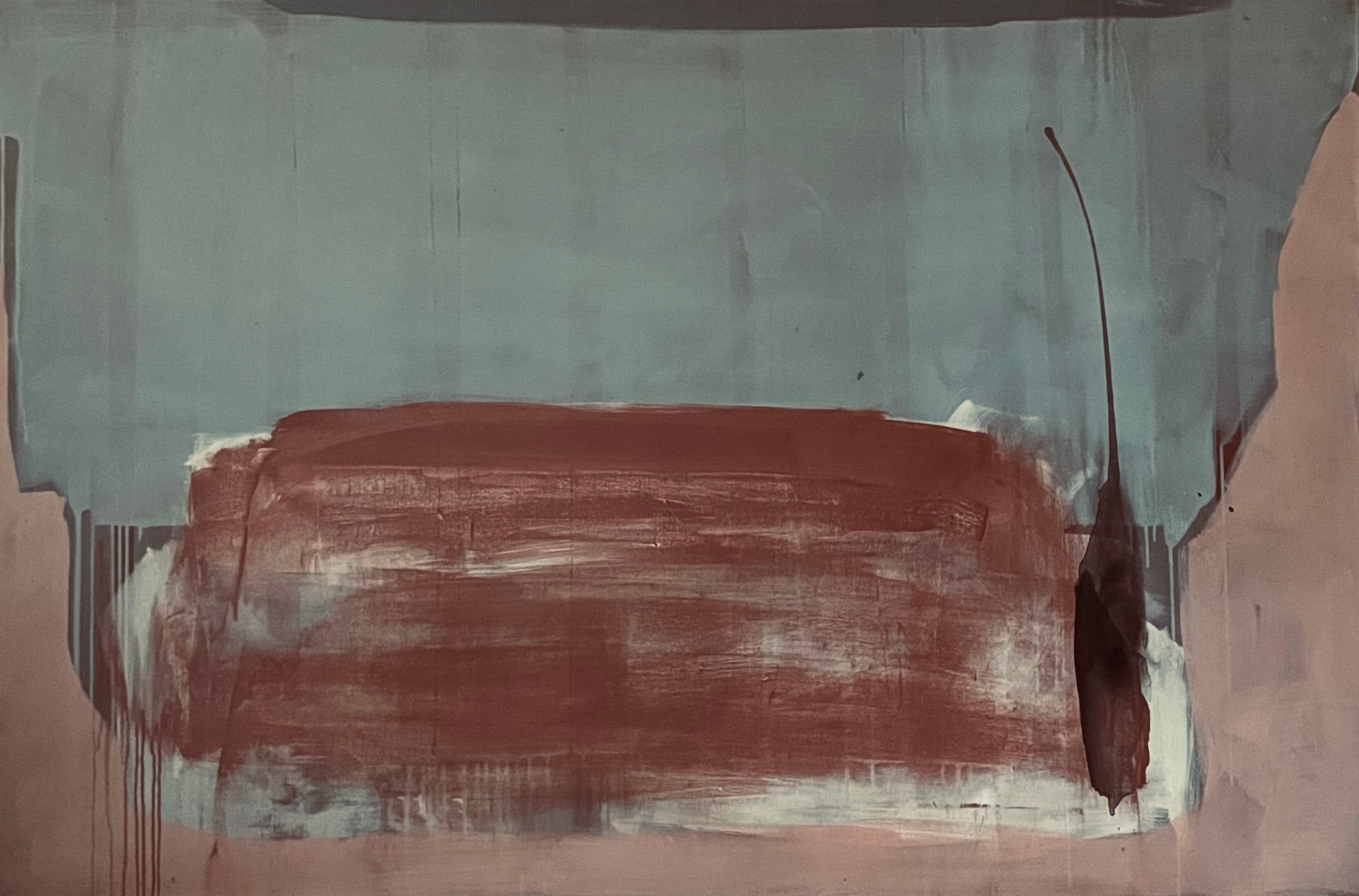 Pieza de colores sobrios, azules grisáceos, cremas, ocres óxidosy rosa palo. Año 2024